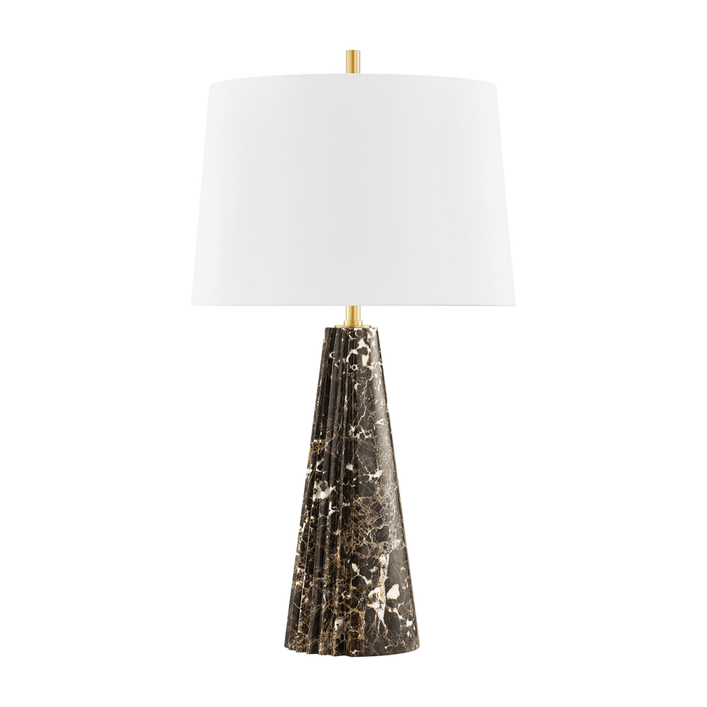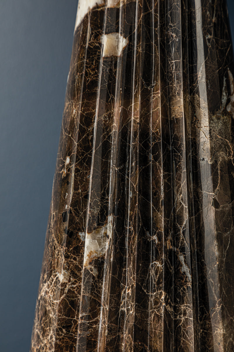 Crafted from lustrous dark Emperador marble, the gently tapered cone shape of this table lamp is fluted to provide a sense of depth. With unique pattern variations, the dark-hued marble is highly reflective, interacting with light to create areas of shine and shadow. An off-white linen shade in a classic drum shape adds a fresh finishing note.