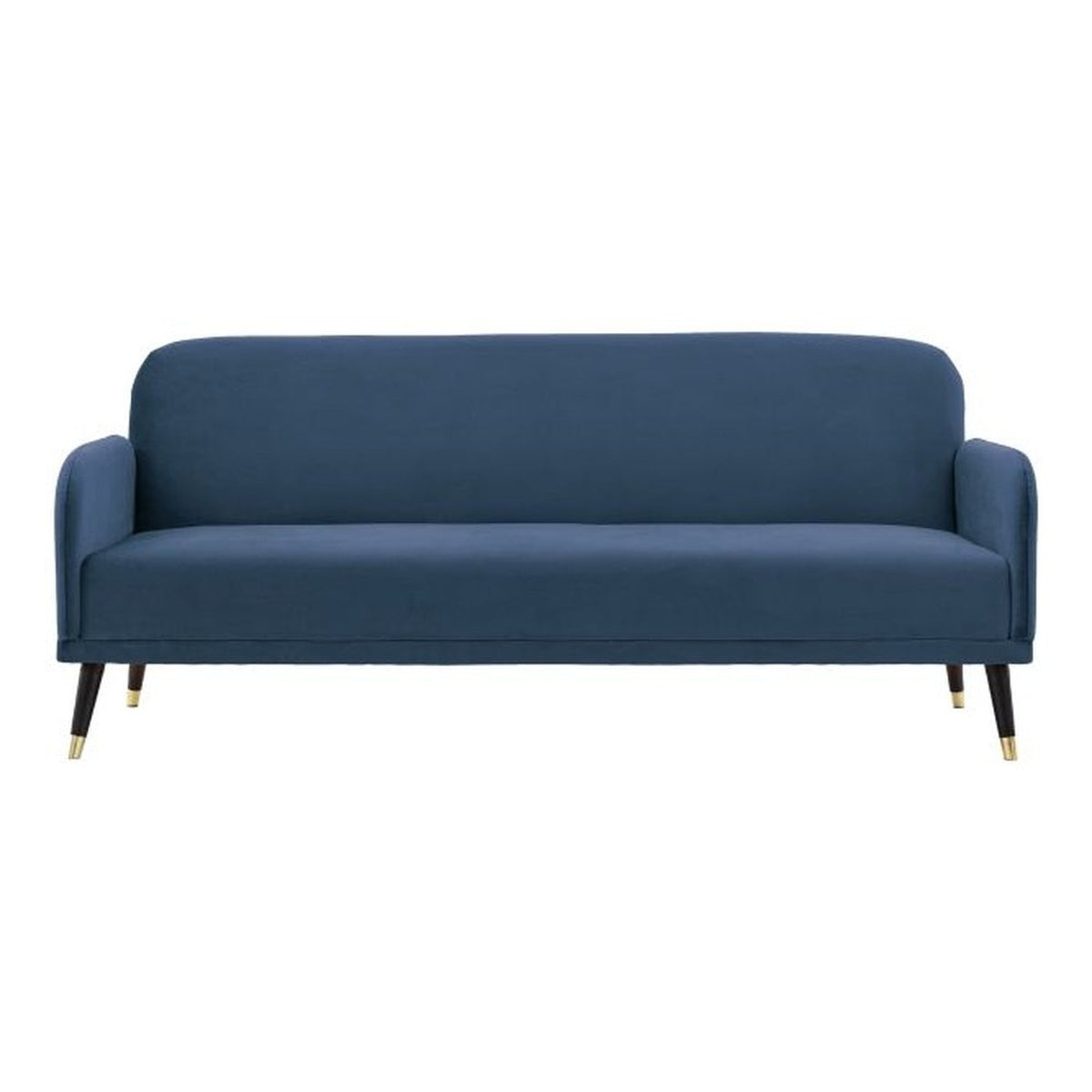 This lovely sofa bed offers stylish contemporary design with the gently curved ends of the back which are echoed in the slim arms. The back quickly and simply folds down to create a bed, perfect for when guests stay overnight. It is upholstered in a lovely cyan blue fabric, but it also available in dark grey and rust.