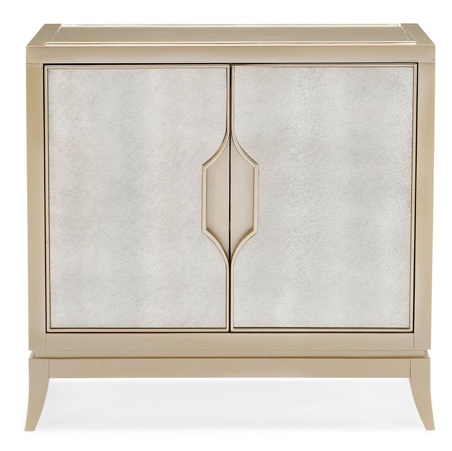 A perfectly antiqued mirror is the shining star of the front of The Adela Nightstand. This glimmering rectangular piece is enrobed in metallic Blush Taupe. The custom, inset astroid-carved handles open the cabinet to reveal a drawer and one adjustable shelf. On either side of a bed, these nightstands are a glamorous way to dress up a space while hiding bedtime essentials. Two doors with antique mirror fronts.Interior and exterior in Blush Taupe One tray drawer and one adjustable shelf behind doors. Doors function with recessed finger pulls.