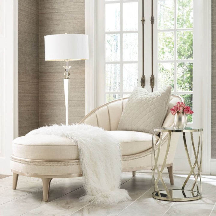 Finish off any sofa by pairing it with the Adela Round Table. Only 40.6cm in diameter, this accent table has a contemporary woven Whisper of Gold metal frame that is topped in glass and features a bevelled mirror shelf at the bottom. This petite piece is the perfect gem to add to any sitting area. Metal frame plated in Whisper of Gold. Tempered glass top. Tempered bevelled mirror on the bottom shelf.