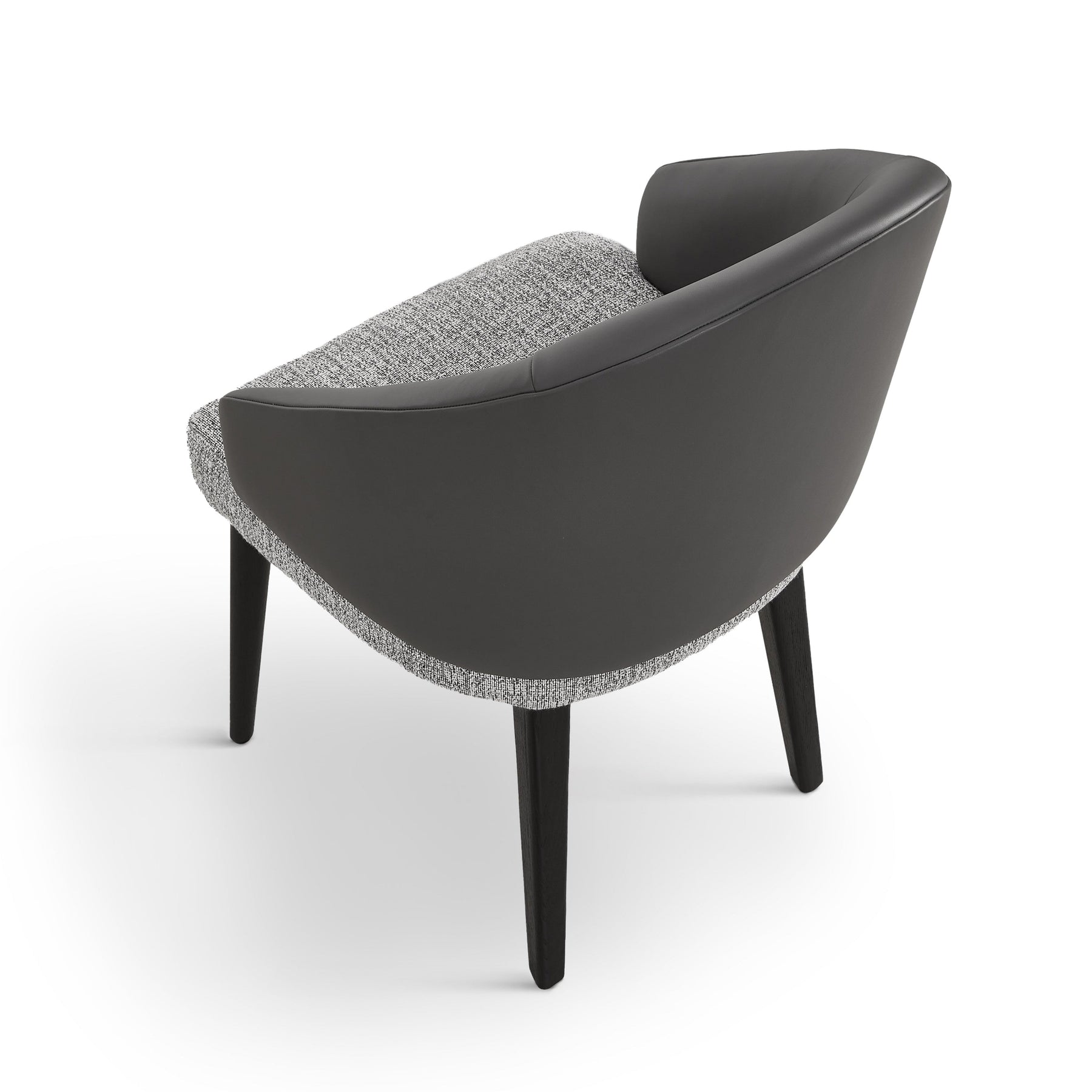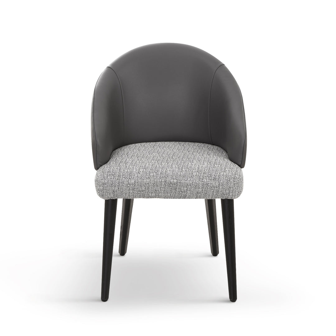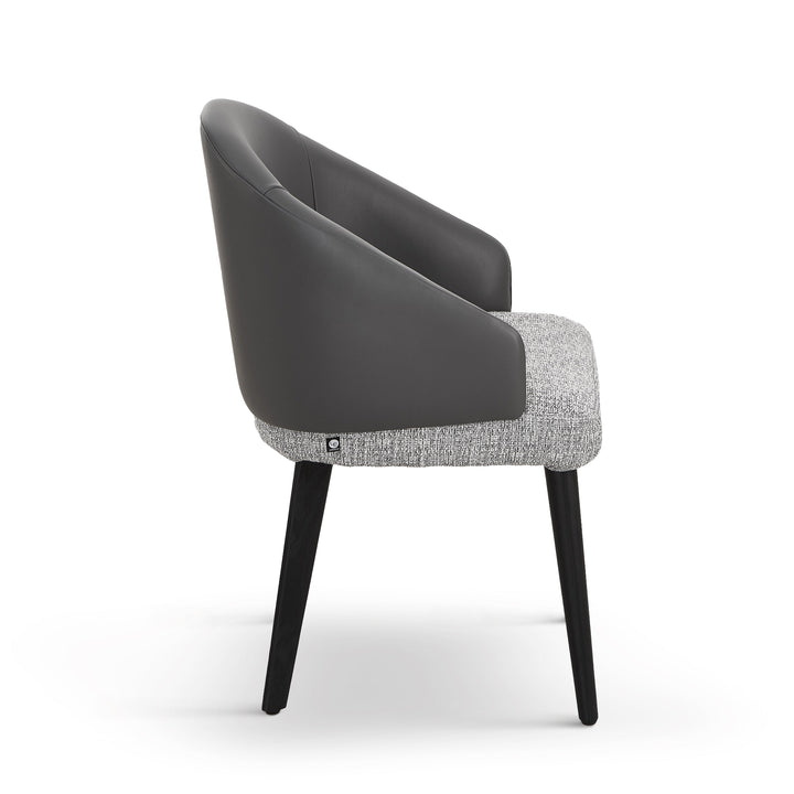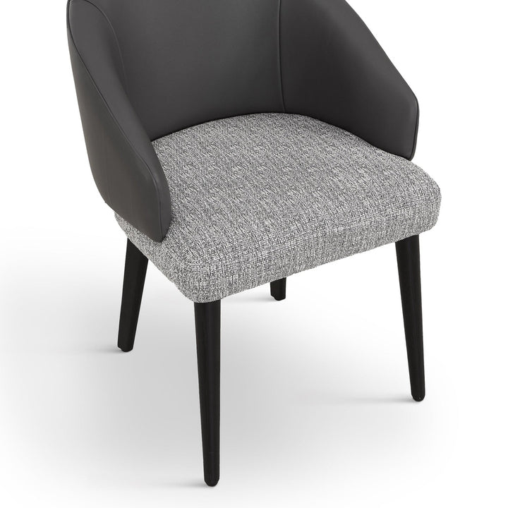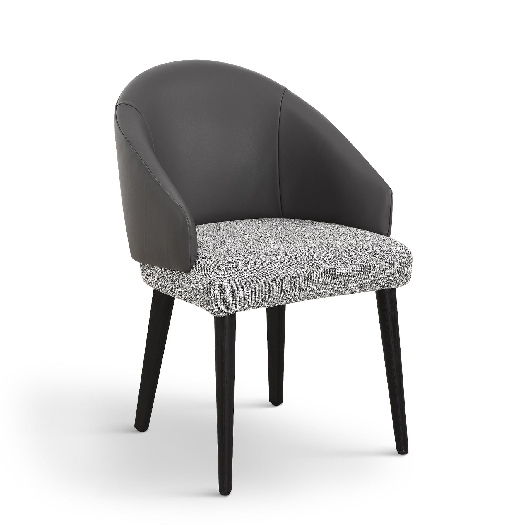 The Agadir Dining Chair (Crib 5) in Kelpa textured taupe, grey faux leather and matte black ash wood blends sculptural elegance with everyday comfort. Its distinctive silhouette and rich texture make it a sophisticated addition to residential or hospitality interiors.