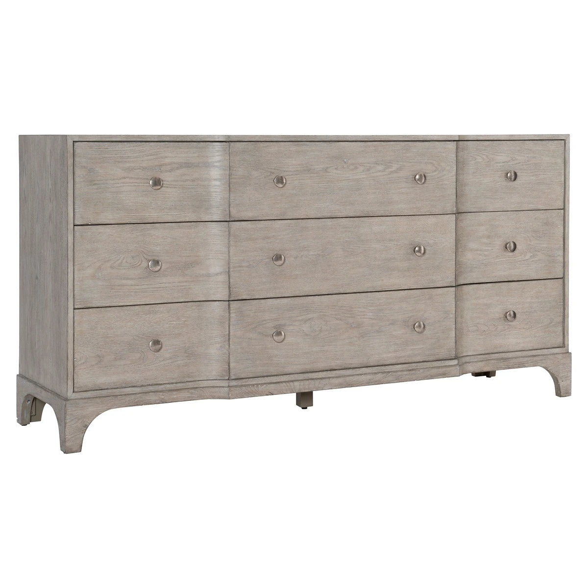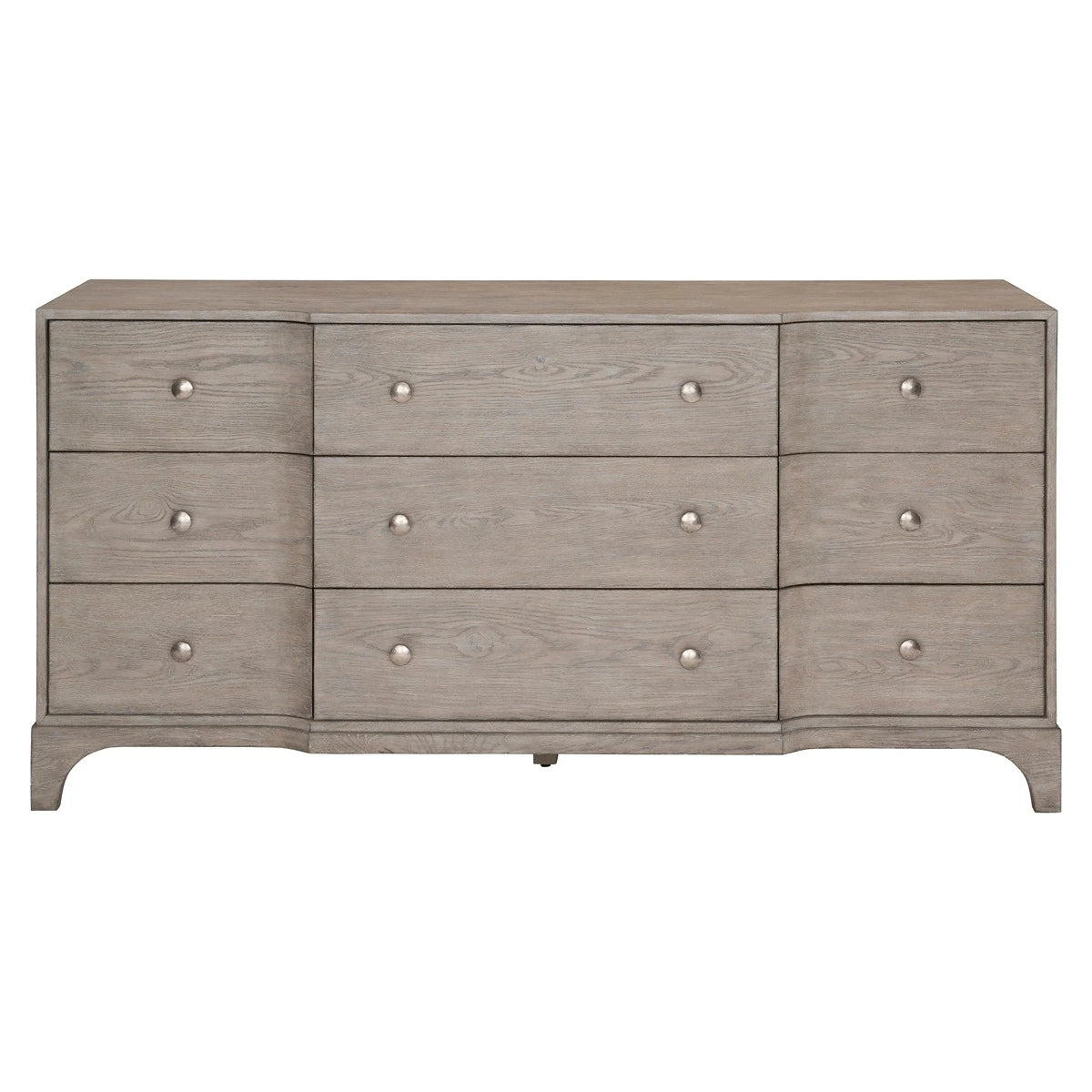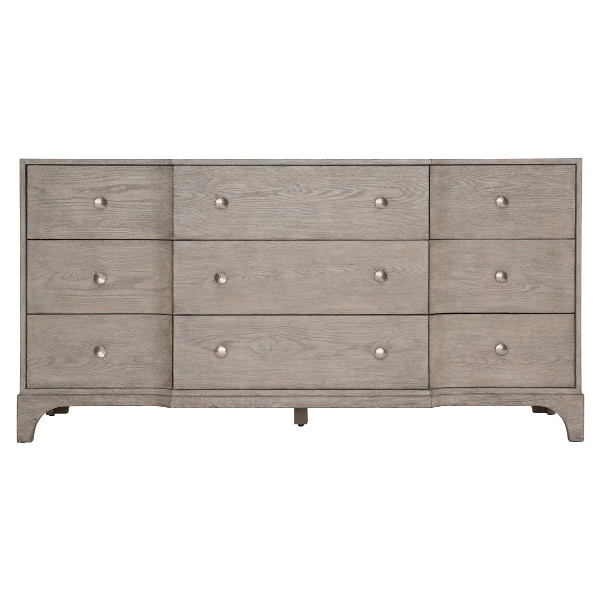 Traditional design finds a modern interpretation in the Albion dresser. The breakfront style, with a center panel that projects forward, is softened with clean lines and a gorgeously worn finish. Nine soft-closing drawers showcase rustic cast zinc hardware with texture and a soft sheen.
