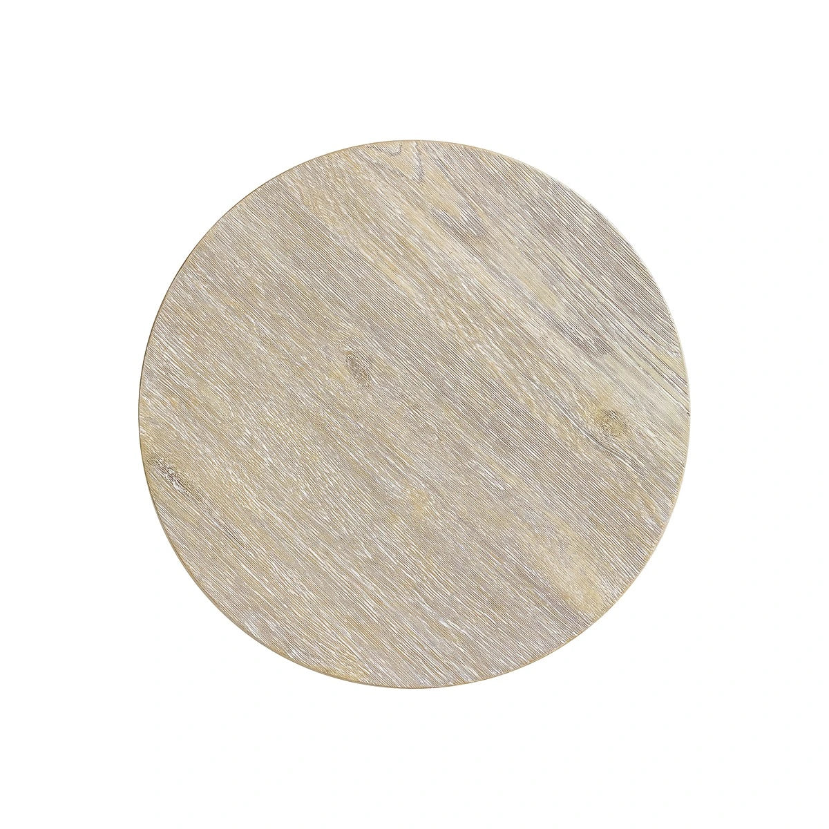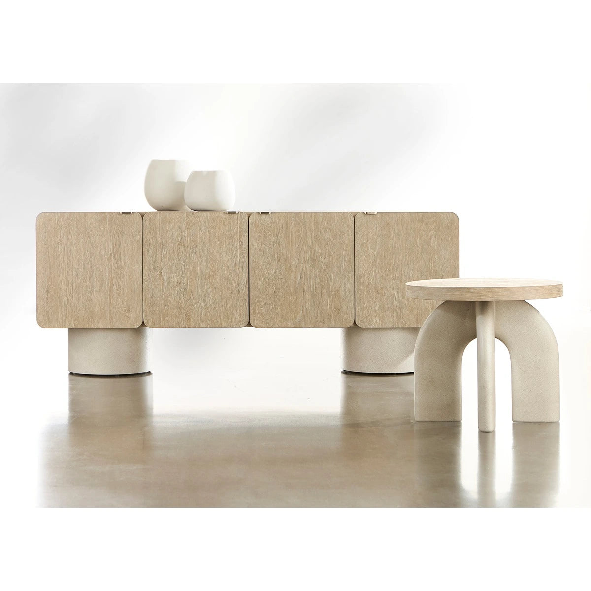 An interlocking sculptural base makes an artistic statement on the Antibes side table. Bisecting arches are crafted from a textural glass-reinforced concrete in a Pumice finish. The base contrasts beautifully with a round wood top in the rustic Roz finish.