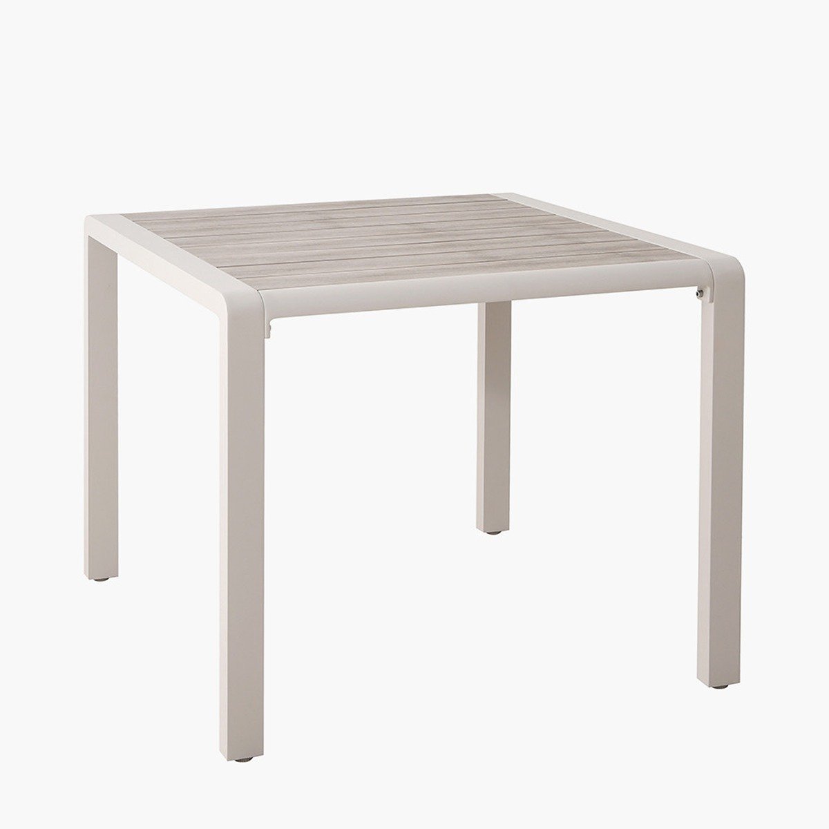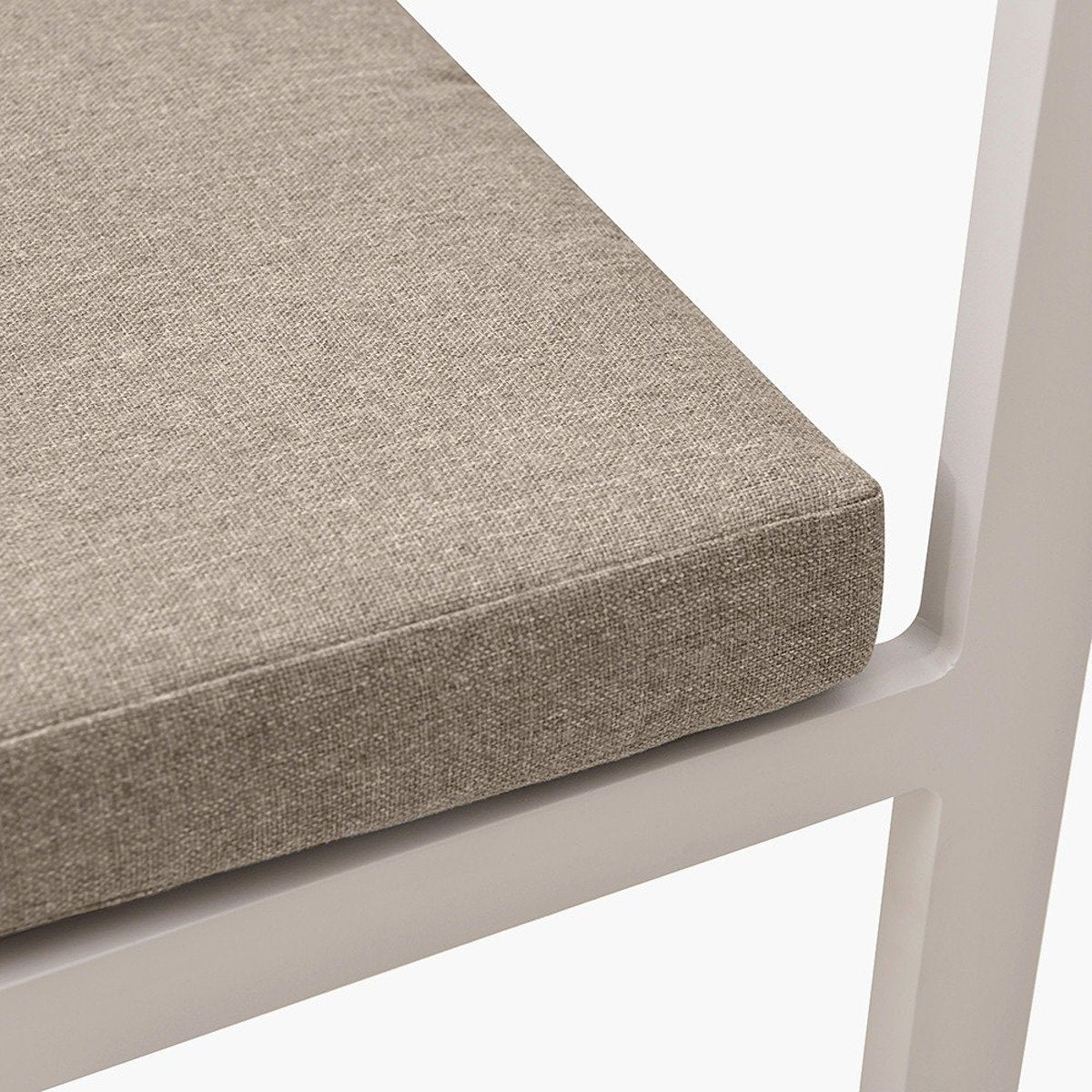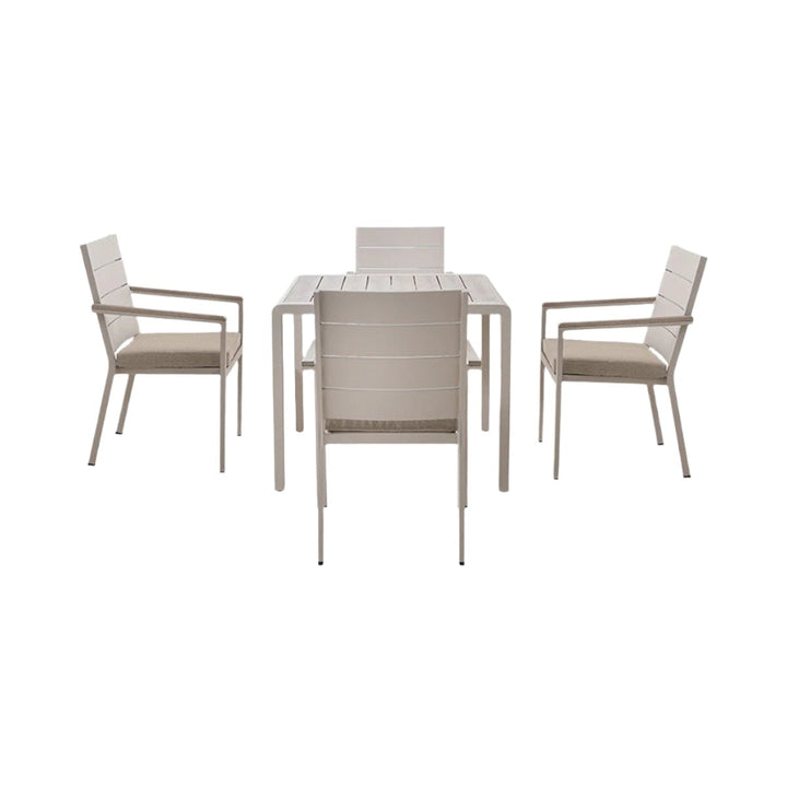 The Arona Outdoor 4 Seater Outdoor Dining Set is the ideal choice for al fresco dining. This set includes; 4 Dining Chairs and 1 Dining Table, all featuring a durable powder-coated aluminium frame in a stylish Latte colour. The dining table is topped with an Ash coloured polywood surface for a modern look. Each outdoor dining chair is paired with a comfortable, season-proof seat cushion covered in Putty Olefin fabric. The Olefin fabric, an industry favourite is a synthetic fibre, highly resistant to staining and fading, quick drying, making it perfect for outdoor furniture.