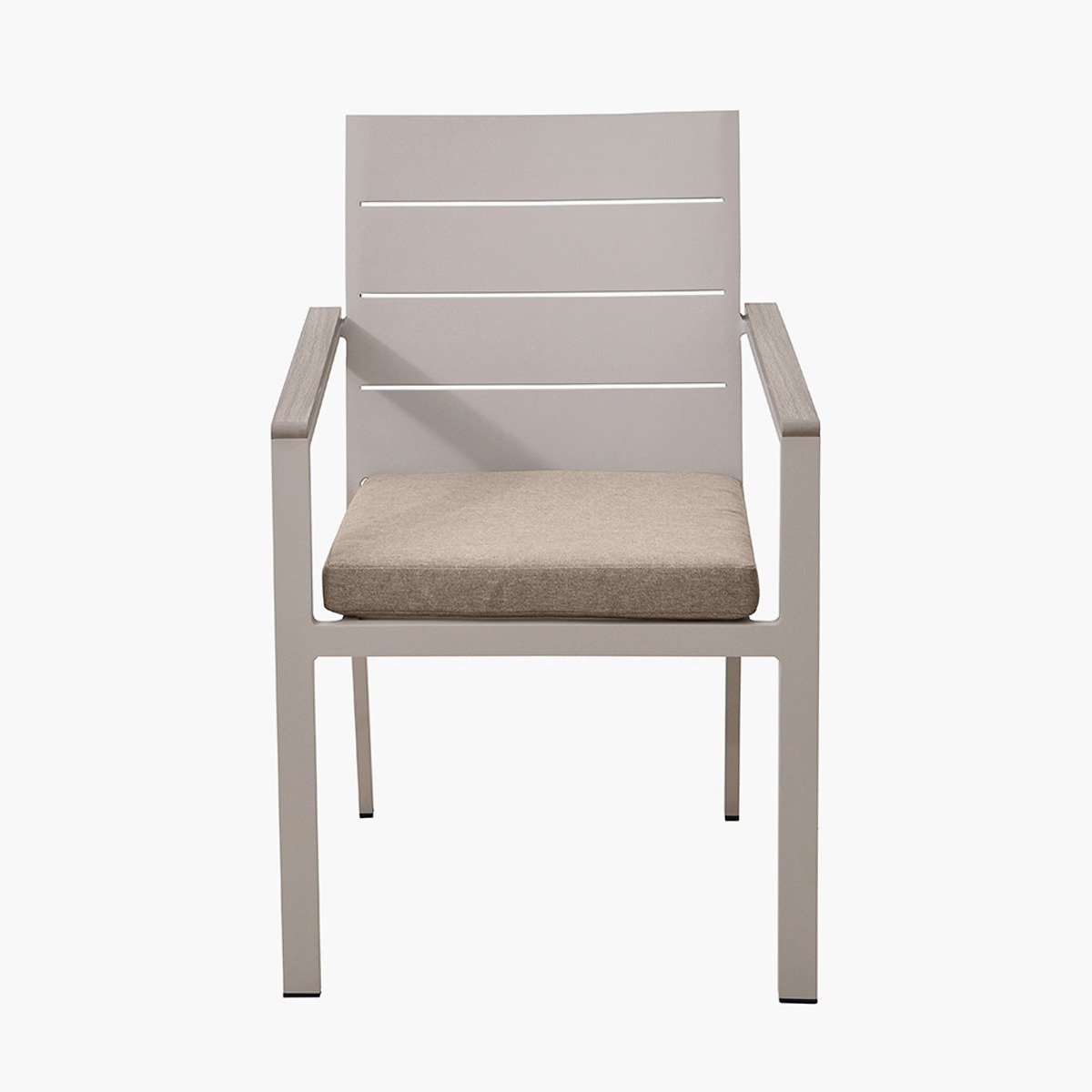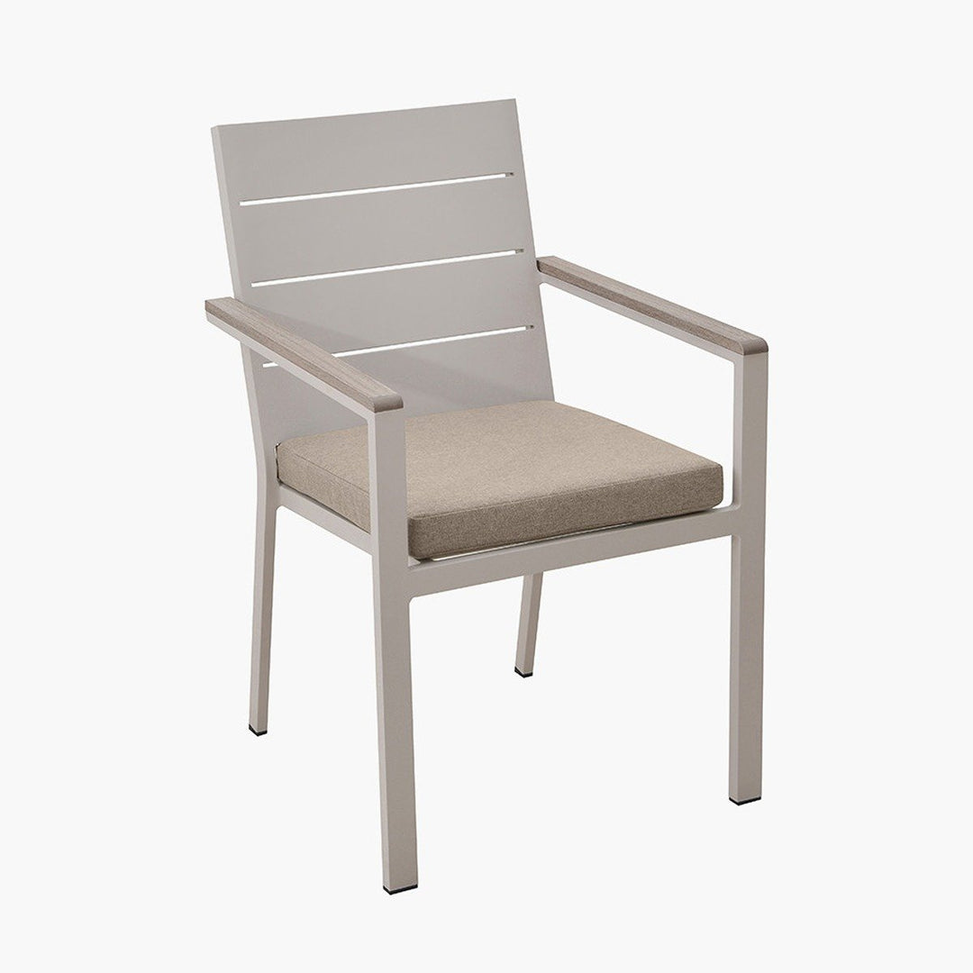 The Arona Outdoor 6 Seater Outdoor Dining Set is the ideal choice for al fresco dining. This set includes 6 Dining Chairs and 1 Dining Table, all featuring a durable powder-coated aluminium frame in a stylish Latte colour. The dining table is topped with an Ash coloured polywood surface for a modern look. Each outdoor dining chair is paired with a comfortable, season-proof seat cushion covered in Putty Olefin fabric. The Olefin fabric, an industry favourite is a synthetic fibre, highly resistant to staining and fading, quick drying, making it perfect for outdoor furniture.