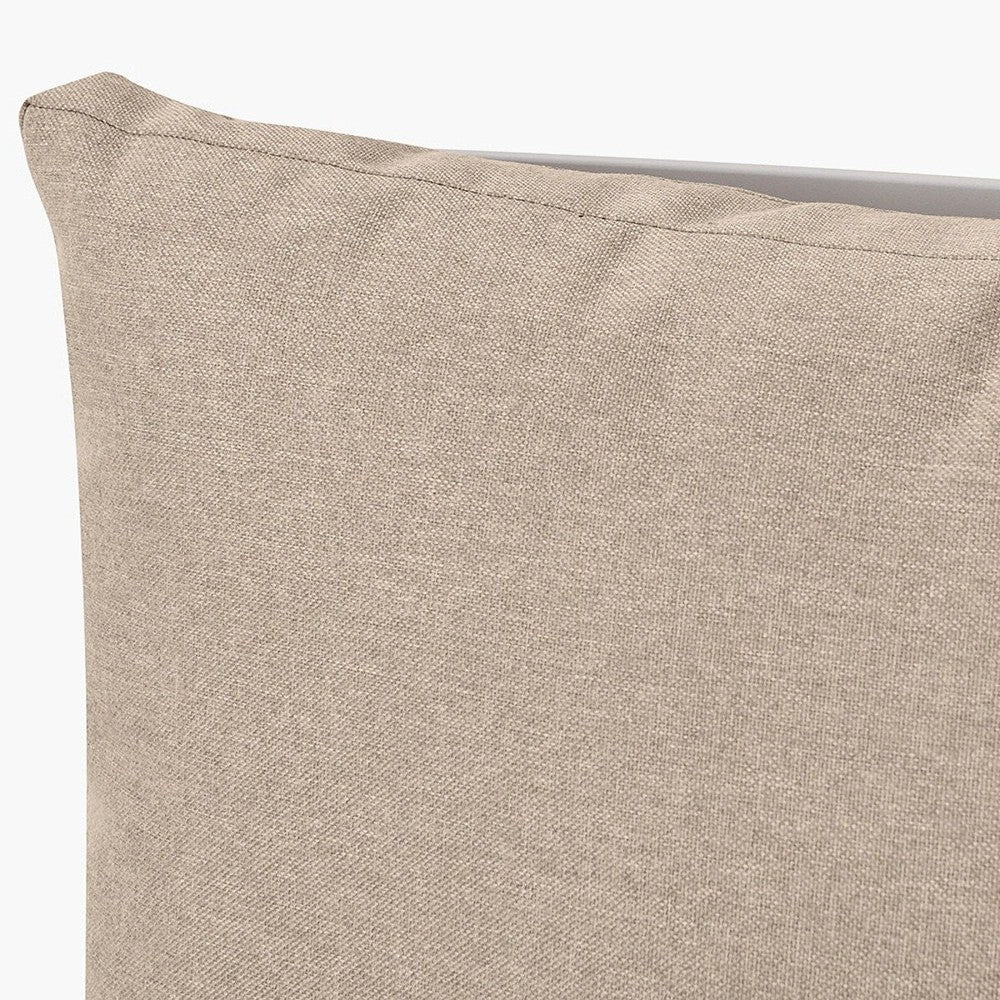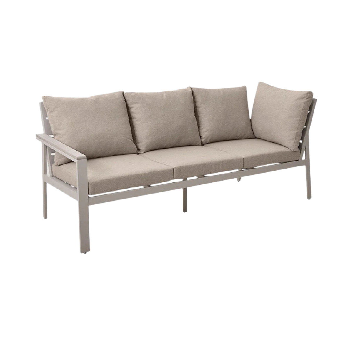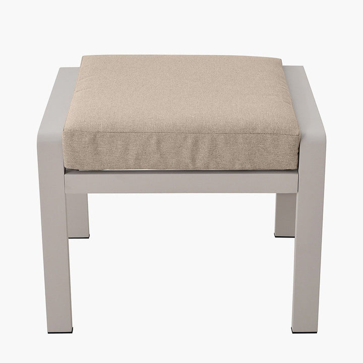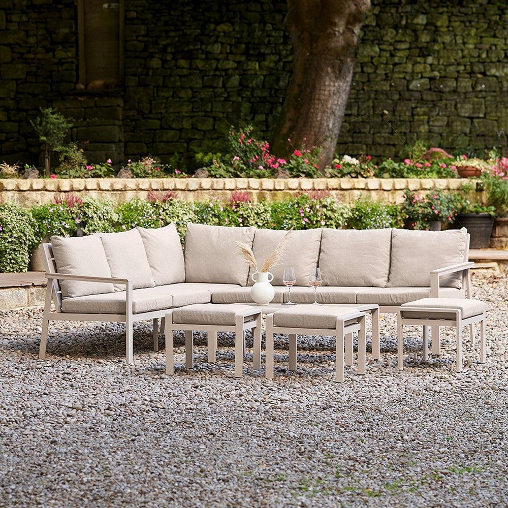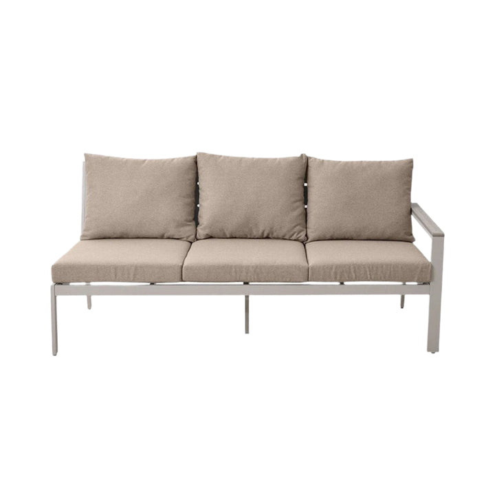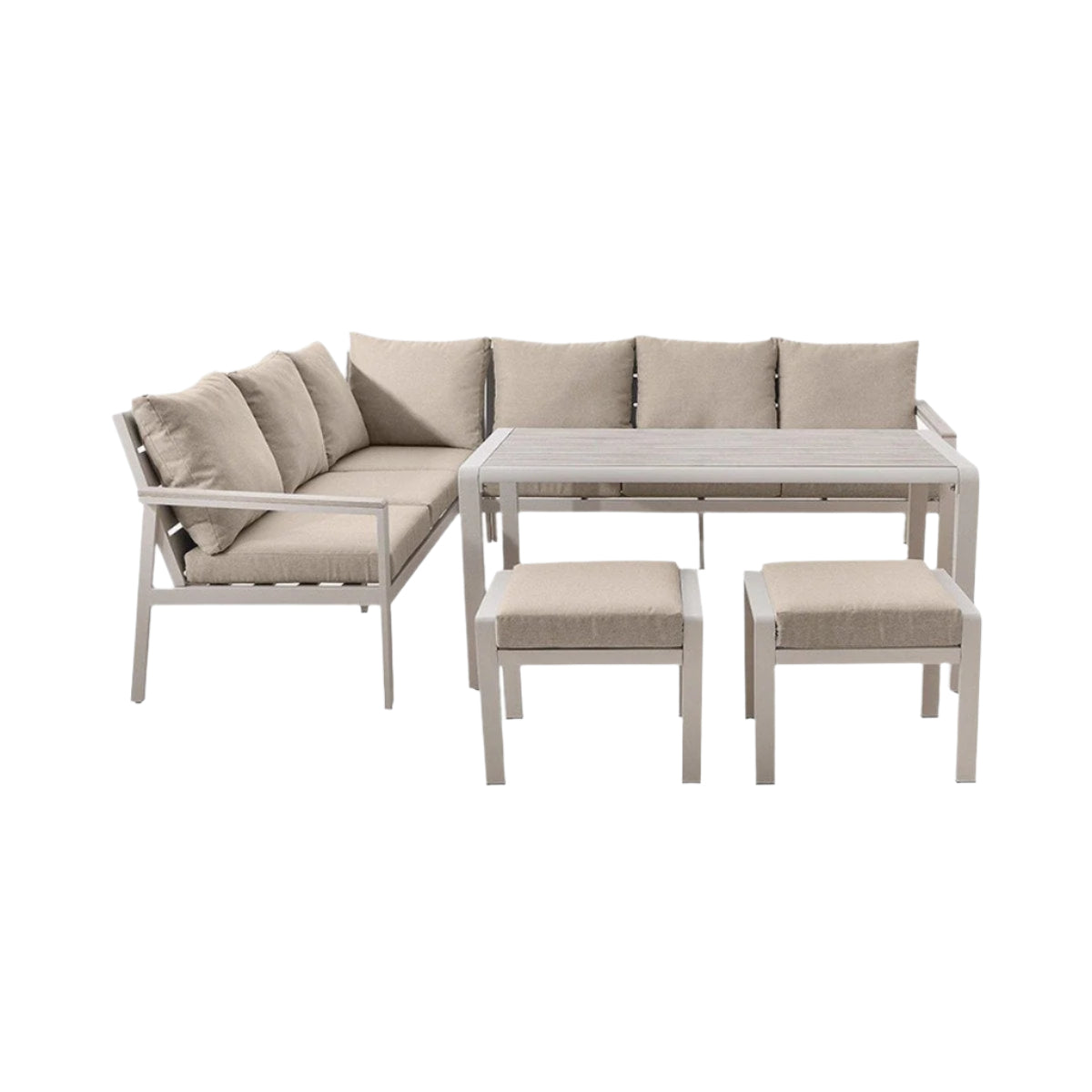 Upgrade your outdoor space with the sleek, contemporary Arona Outdoor Corner Seating Set, the ultimate lounging experience. This set consists of; 1 Left Arm Sofa, 1 Right Arm Sofa, 1 Coffee Table and 3 Footstools for ample seating space and maximum comfort. The frame of this set is a powder-coated aluminium frame with an elegant Latte finish. The frame is accented perfectly by the complementary season-proof seat cushions in a Putty Olefin fabric. The Olefin fabric, an industry favourite is a synthetic fibre, highly resistant to staining and fading, quick drying, making it perfect for outdoor furniture. The outdoor coffee table is topped with glass and finished in an Ash wood effect, adding a sophisticated touch to this contemporary collection.