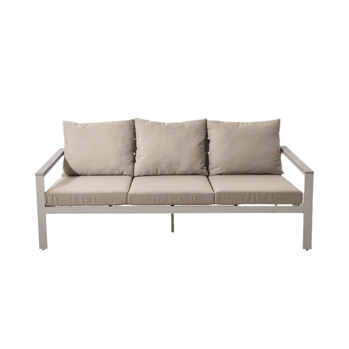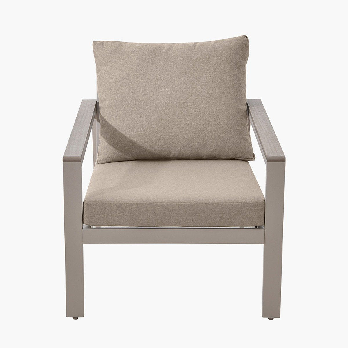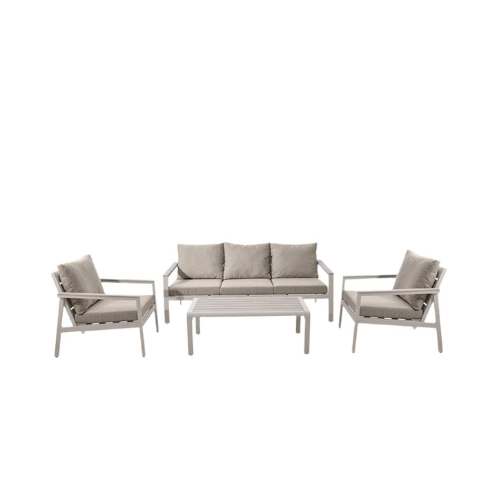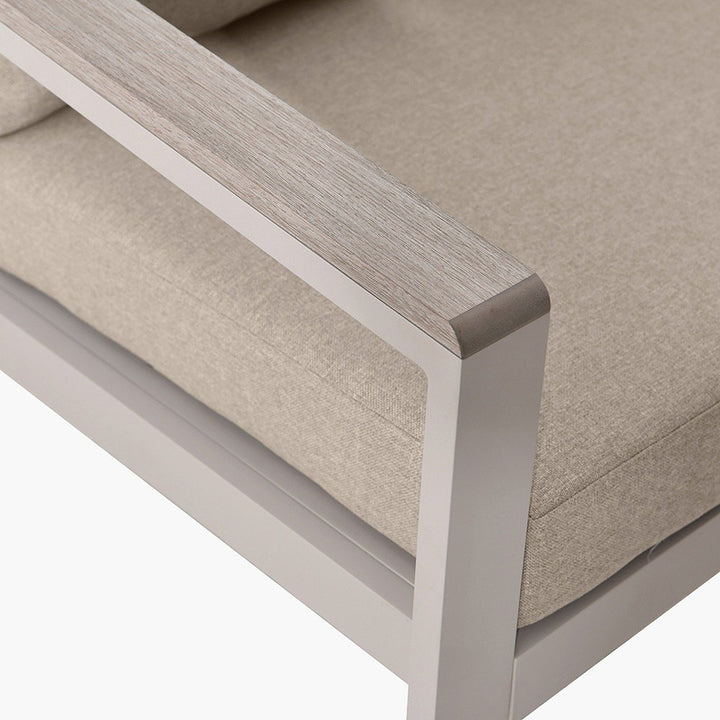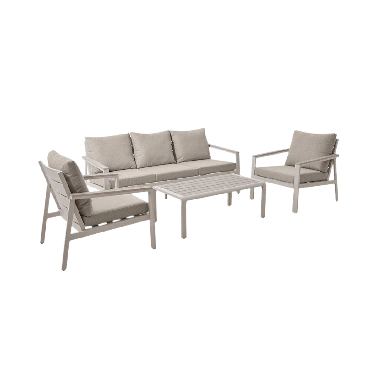 Upgrade your outdoor space with the sleek, contemporary Arona Outdoor Seating Set, designed for both style and comfort. This set includes a 2 Seater Sofa, 2 Armchairs, and a Coffee Table, all crafted from durable powder-coated aluminium in an elegant Latte finish. The frame is accented perfectly by the seat cushions being a Putty Olefin fabric. The Olefin fabric, an industry favourite is a synthetic fibre, highly resistant to staining and fading, quick drying, making it perfect for outdoor furniture. The outdoor coffee table is topped with glass and finished in an Ash wood effect, adding a sophisticated touch to this contemporary collection.