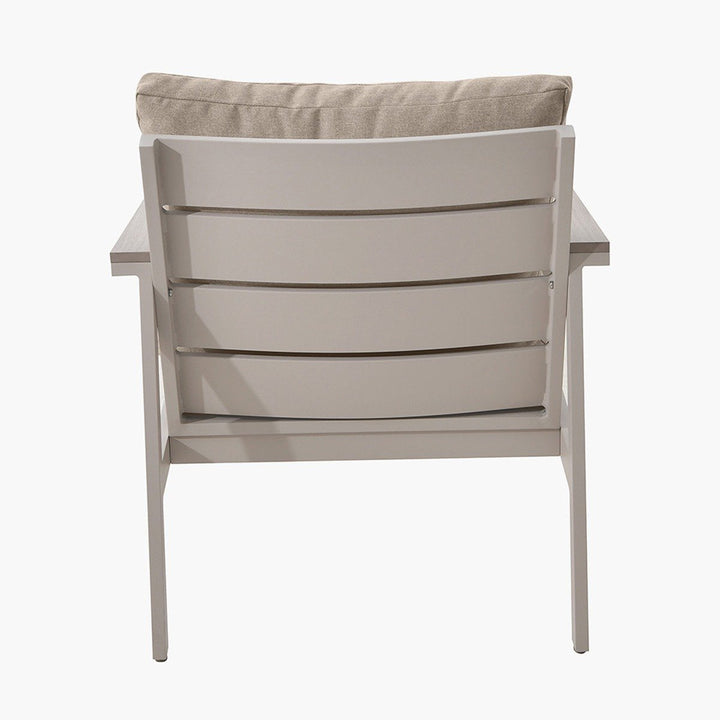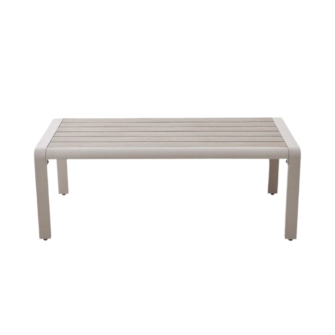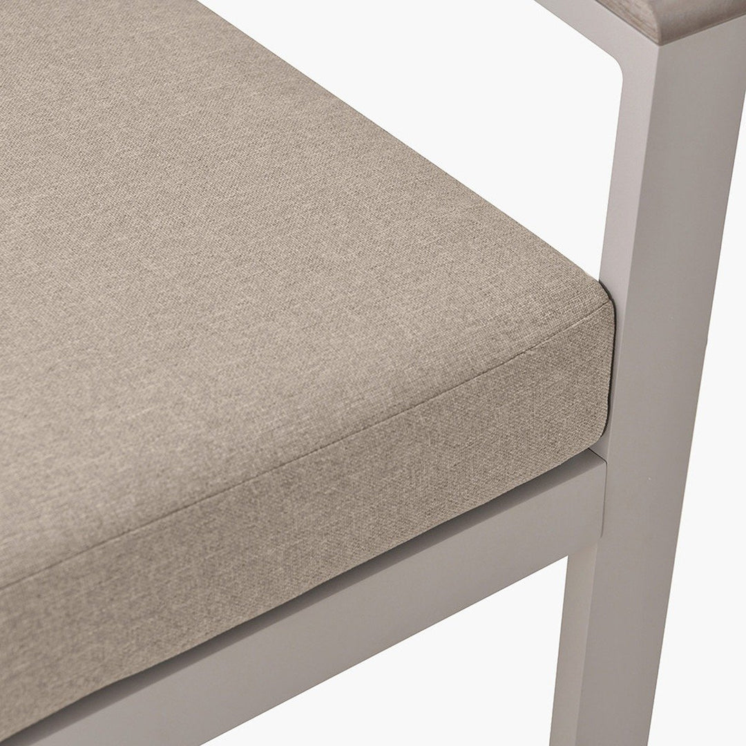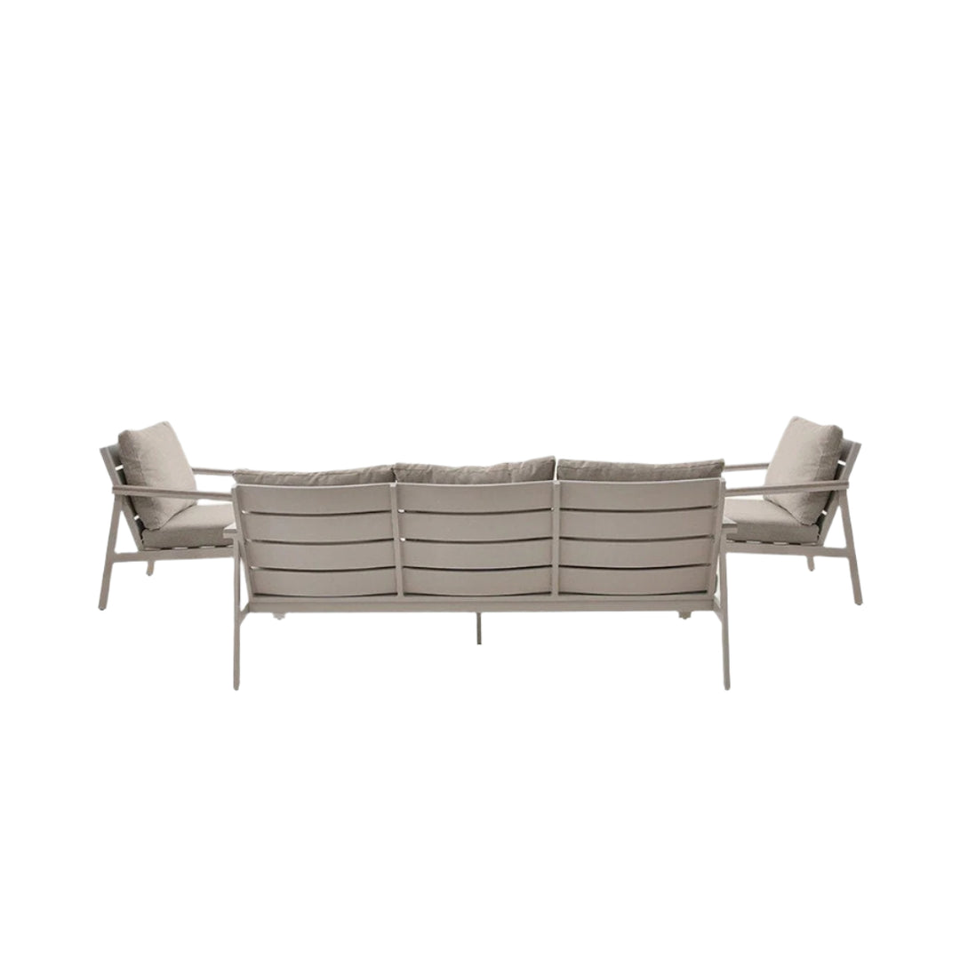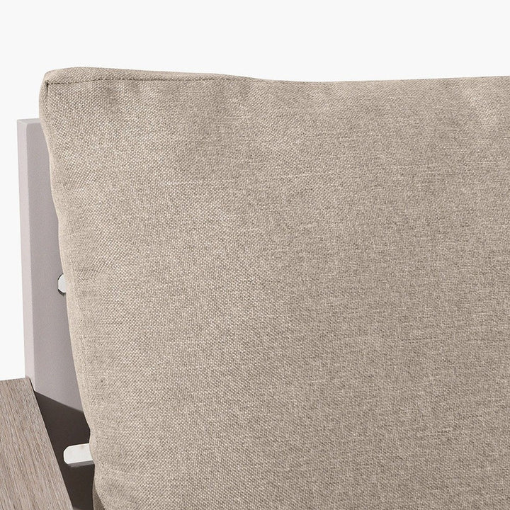 Upgrade your outdoor space with the sleek, contemporary Arona Outdoor Seating Set, designed for both style and comfort. This set includes a 2 Seater Sofa, 2 Armchairs, and a Coffee Table, all crafted from durable powder-coated aluminium in an elegant Latte finish. The frame is accented perfectly by the seat cushions being a Putty Olefin fabric. The Olefin fabric, an industry favourite is a synthetic fibre, highly resistant to staining and fading, quick drying, making it perfect for outdoor furniture. The outdoor coffee table is topped with glass and finished in an Ash wood effect, adding a sophisticated touch to this contemporary collection.