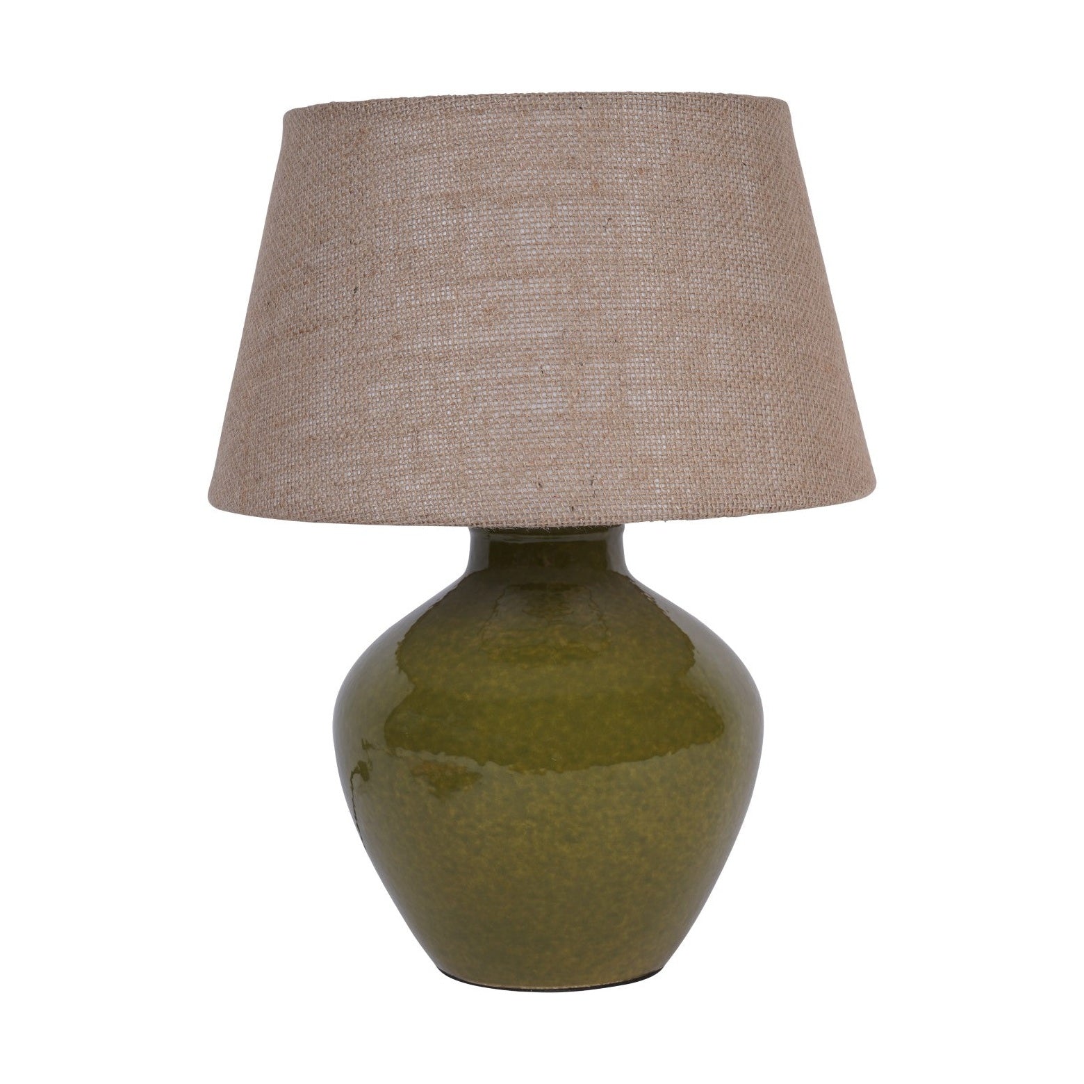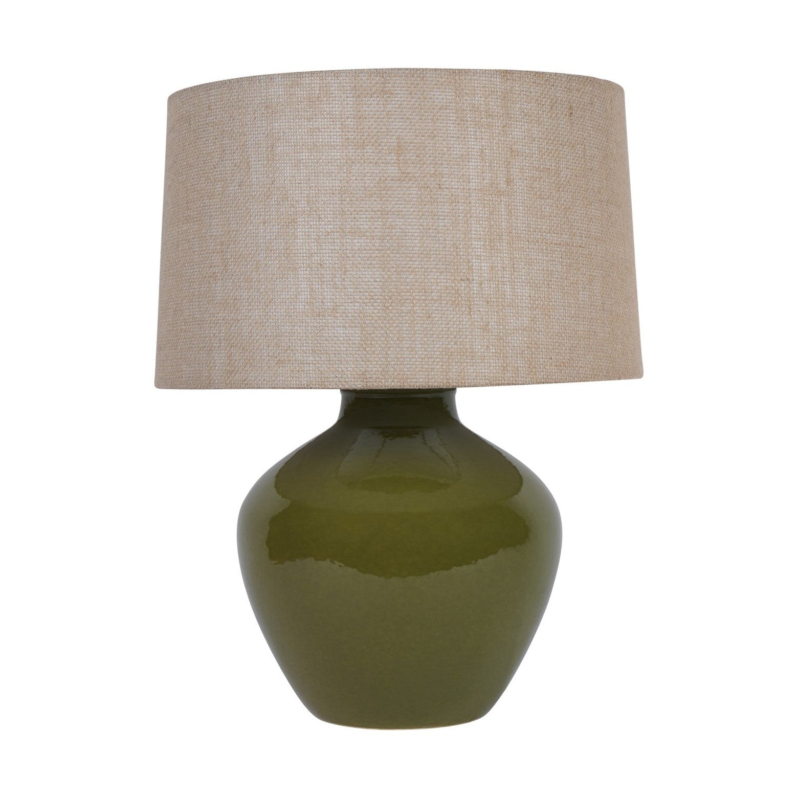 The Aubrey Lamp in Green features a beautifully glazed ceramic base in a rich, mossy tone, paired with a natural hessian shade for a soft, organic look. Its subtle mottled finish adds depth and texture, making it a versatile piece for both modern and rustic interiors. Switch type: Standard Toggle Switch. Both sizes also available in Terracotta, with Dusky Pink offered in the small only.
