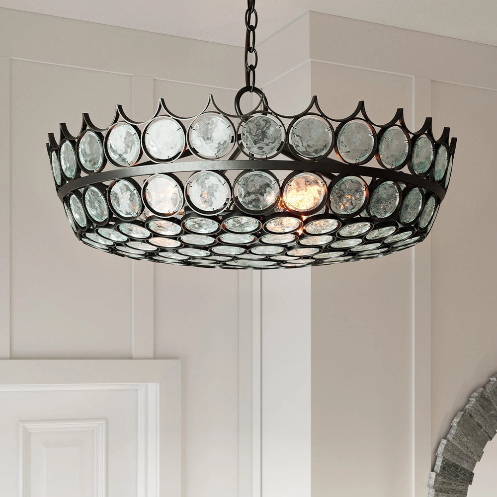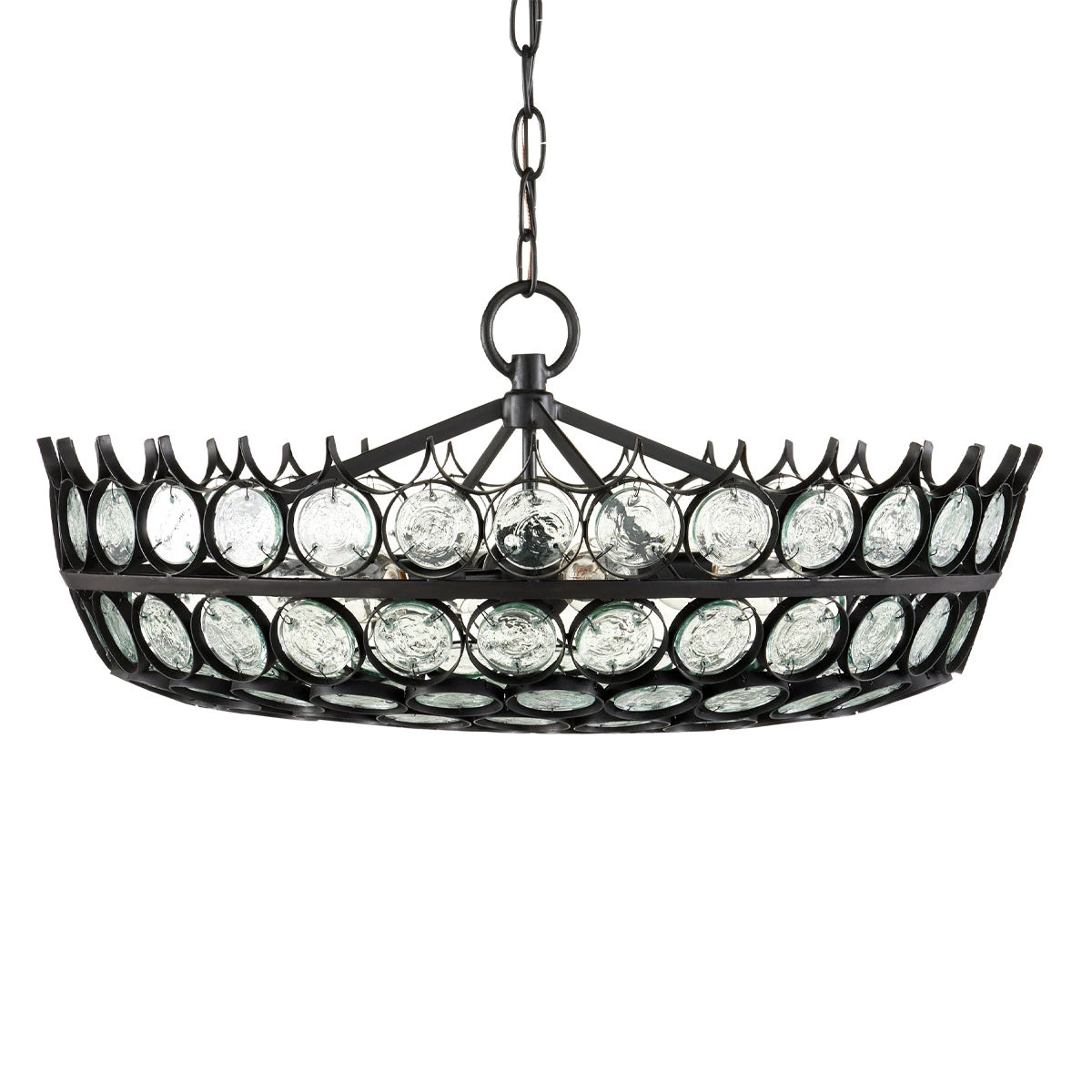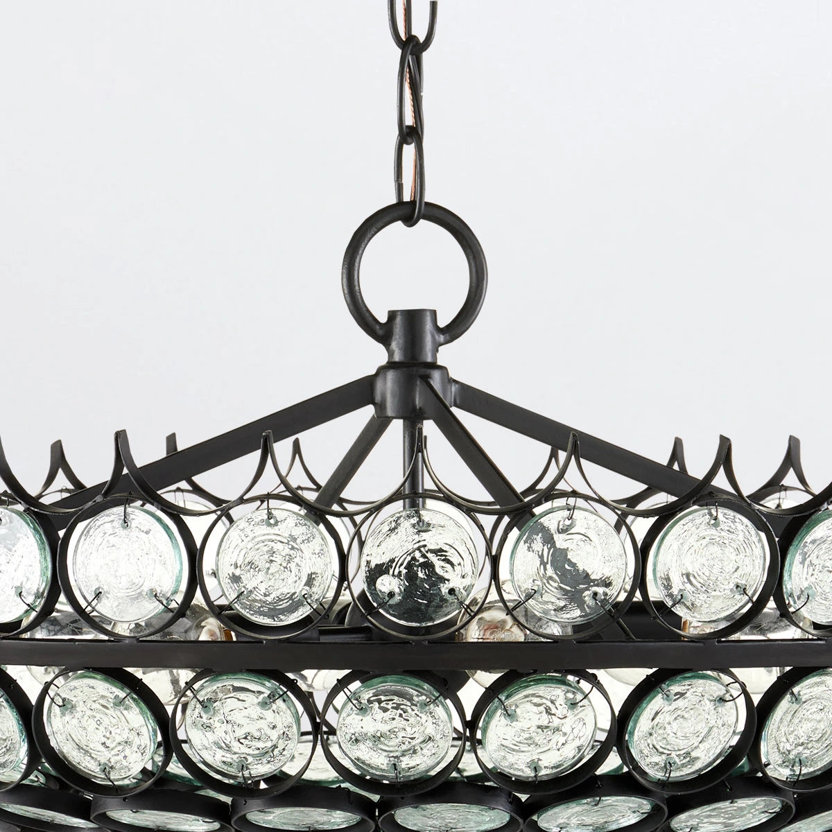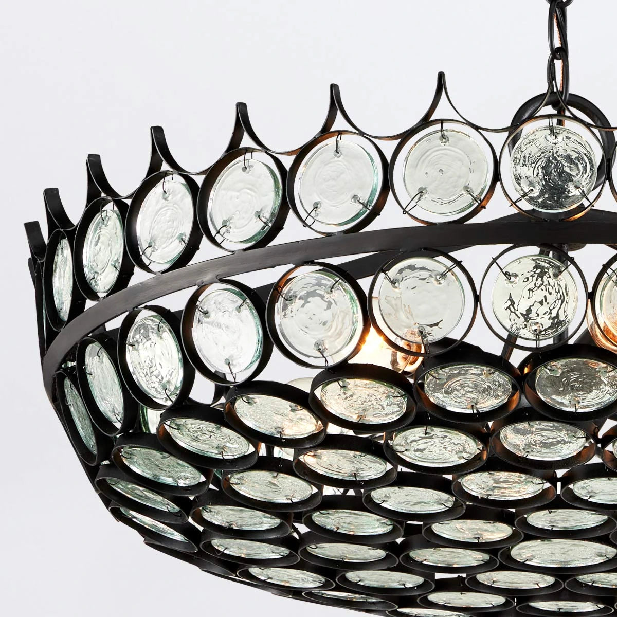 Recycled glass discs are encased in wrought iron in a satin black finish to bring the Augustus Small Chandelier great aesthetic strength. Design details of note are how unobtrusively the discs are fastened to the frame and the fact that the discs grow smaller as they descend to the bottom of the shade. This classic black chandelier is in the Bunny Williams Collection.