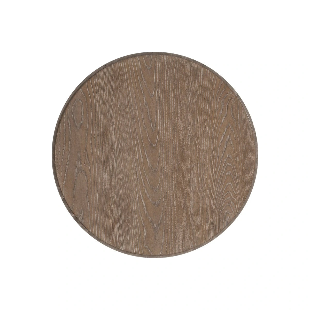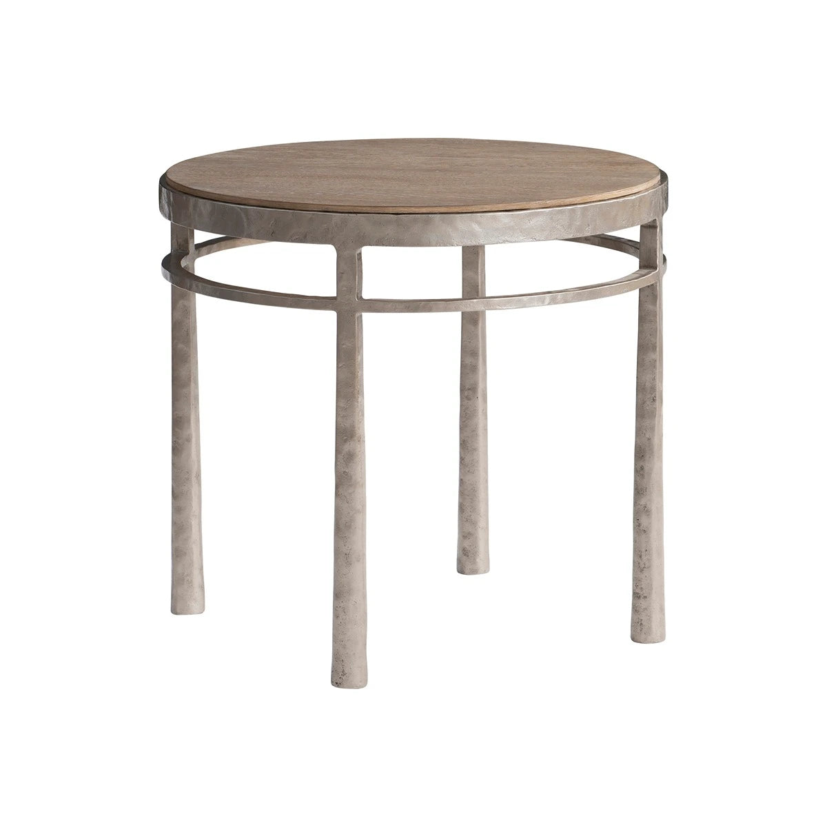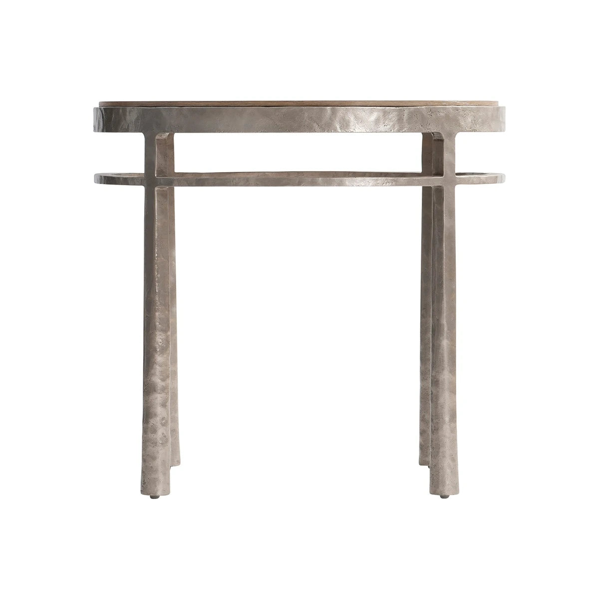 A circle of wood banded by cast aluminum floats above a satellite ring of metal on the Aventura side table. Tapered legs are formed from textured cast aluminum for casual rustic look. And the inset oak top is finished in Marcona.