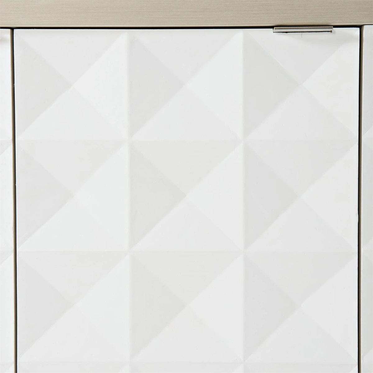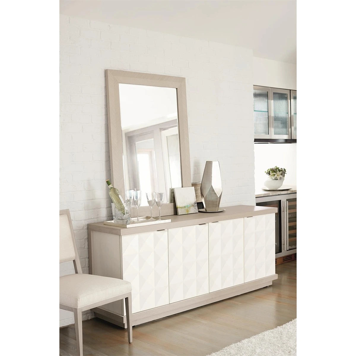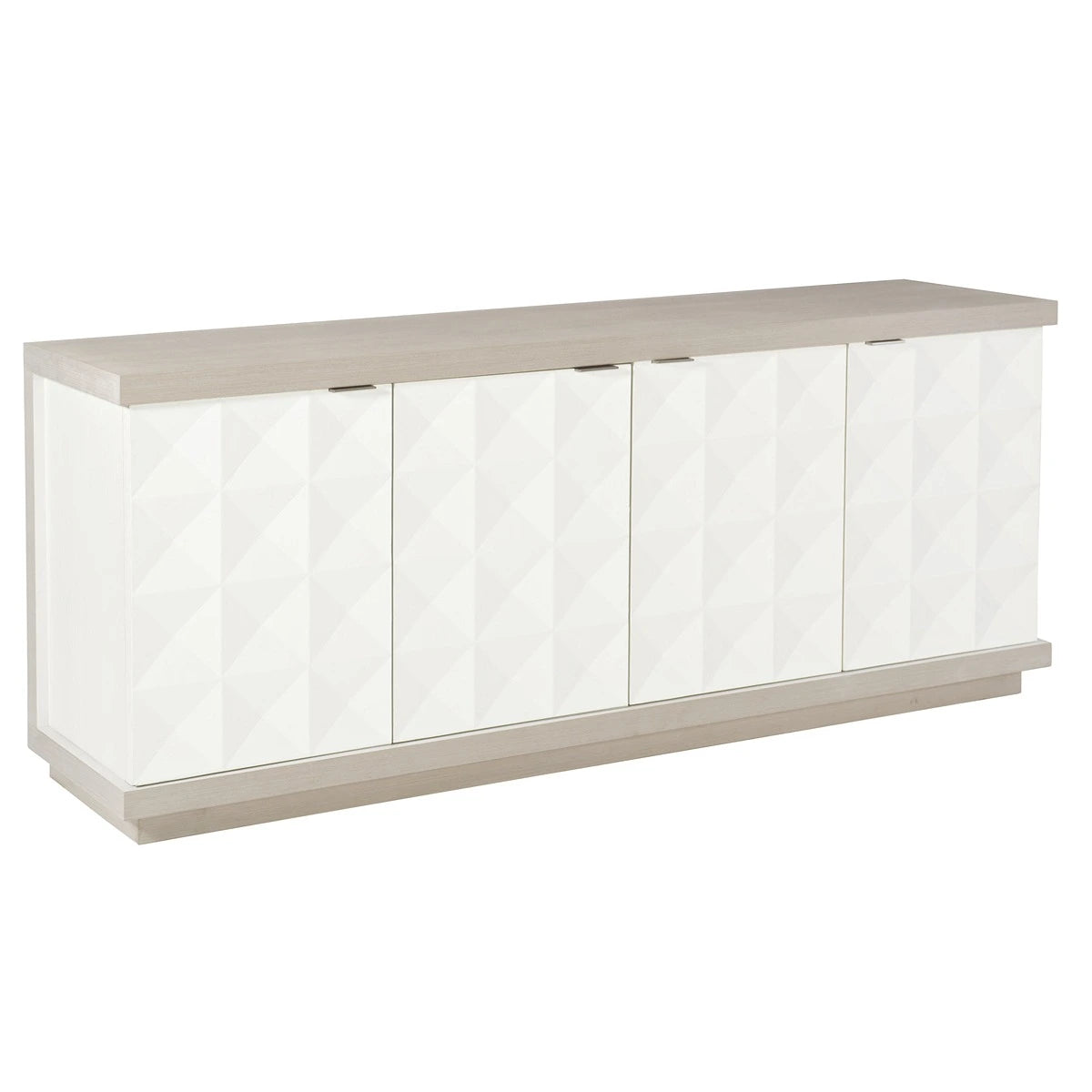 The Axiom buffet creates a fresh, modern look by merging clean lines with a dynamic 3-D motif of an inverted pyramid. This expertly crafted piece features engineered faux anigre veneers in two silky yet low-sheen finishes, Linear White and Linear Gray. These serve as the perfect complement to the hand-applied plaster overlays on the doors, finished in White Linen. With its sleek form and unique materials, this glamorous transitional buffet makes a sophisticated statement.