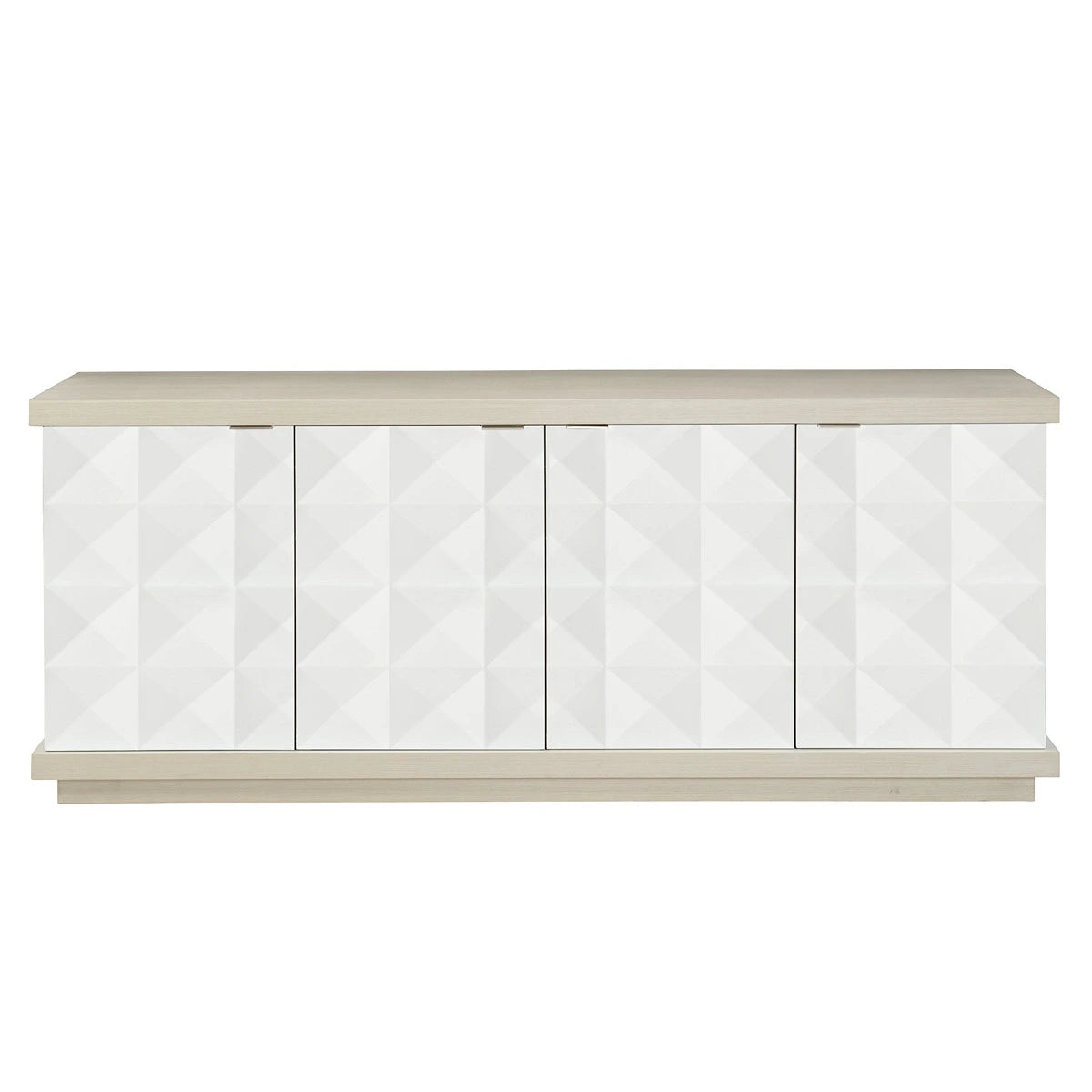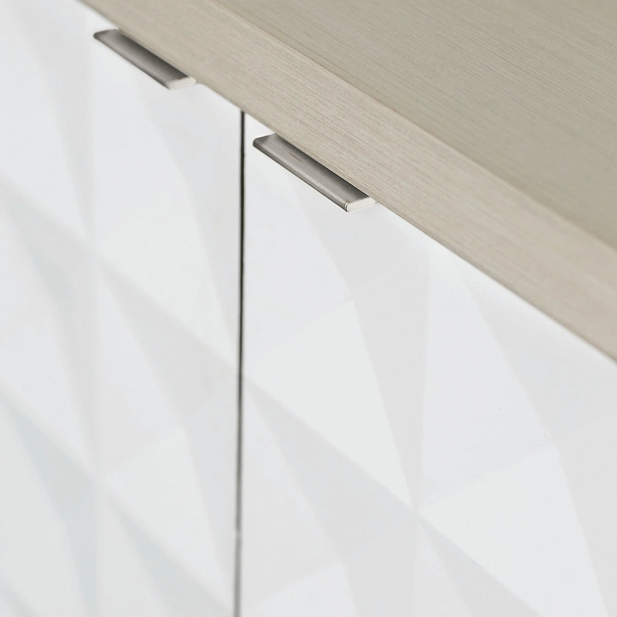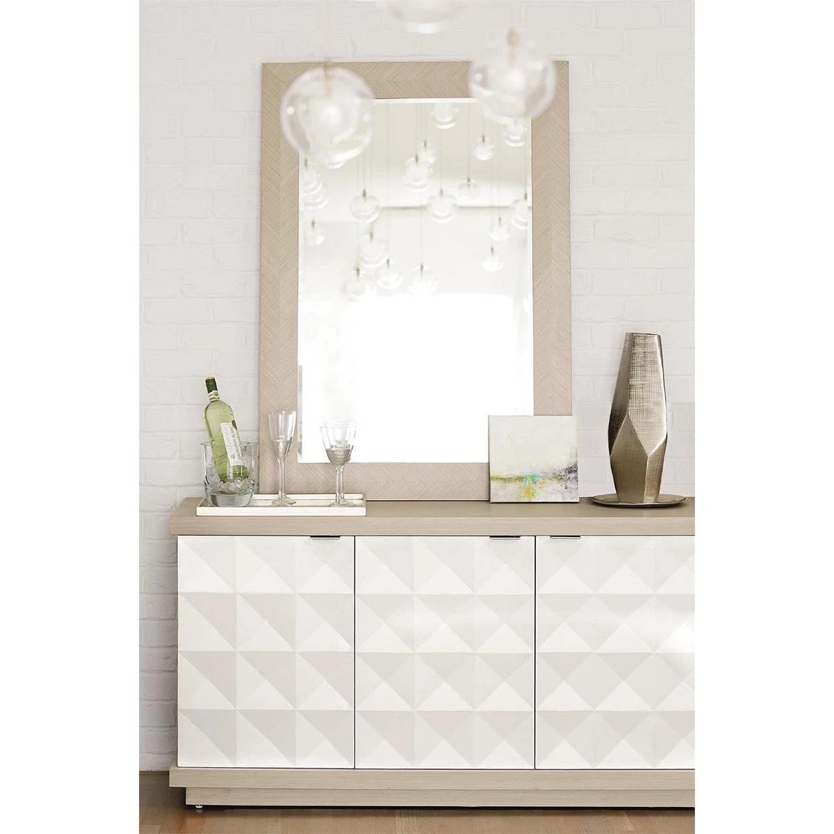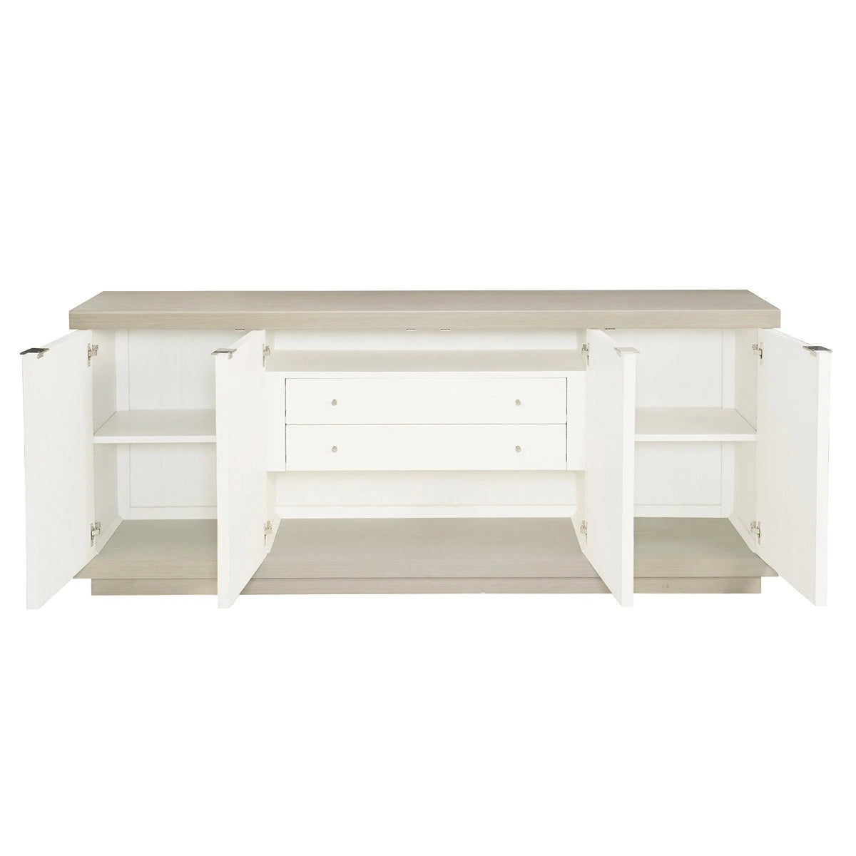 The Axiom buffet creates a fresh, modern look by merging clean lines with a dynamic 3-D motif of an inverted pyramid. This expertly crafted piece features engineered faux anigre veneers in two silky yet low-sheen finishes, Linear White and Linear Gray. These serve as the perfect complement to the hand-applied plaster overlays on the doors, finished in White Linen. With its sleek form and unique materials, this glamorous transitional buffet makes a sophisticated statement.