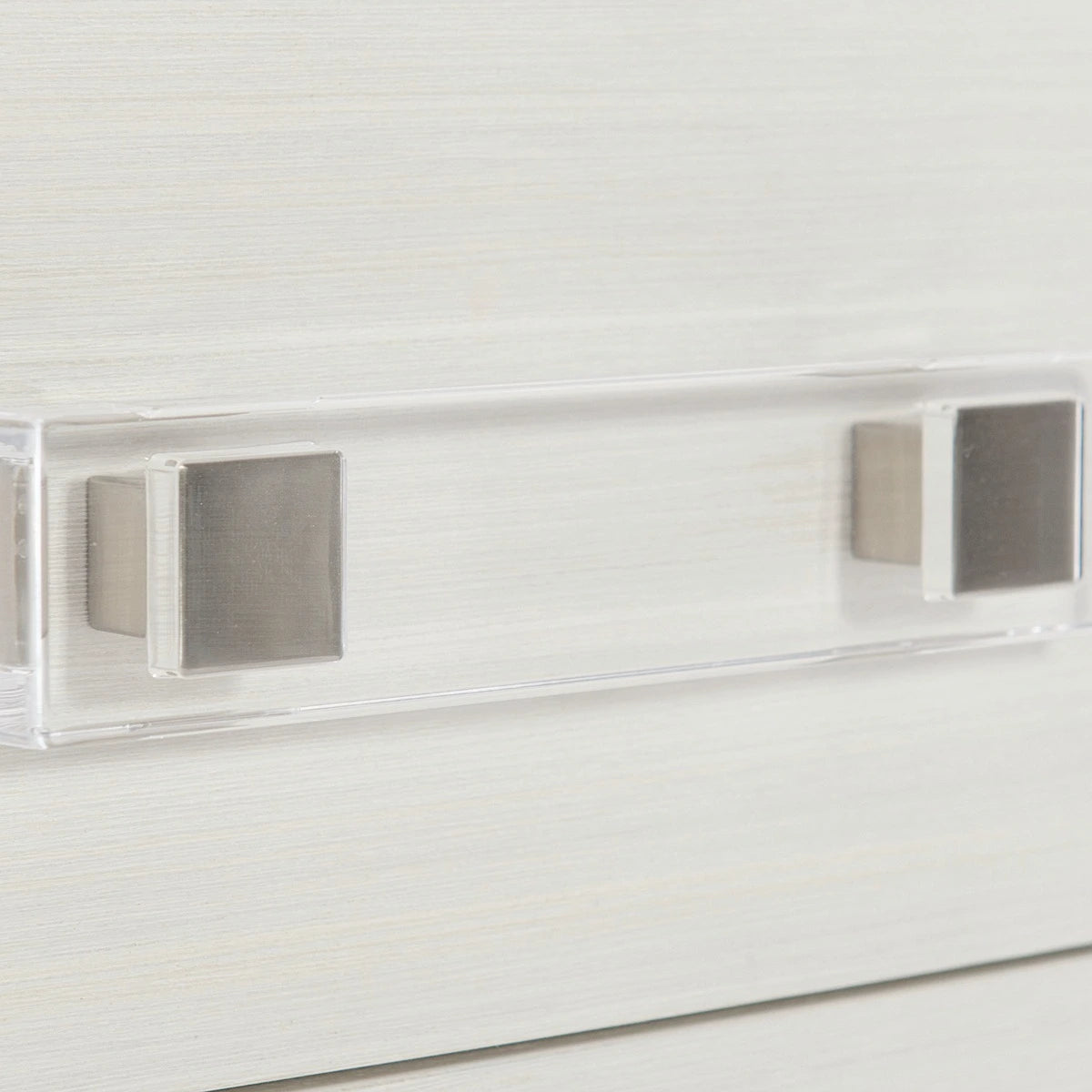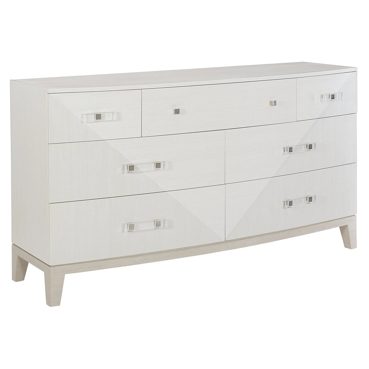 Crafted from poplar solids and engineered faux anigre veneers, the Axiom dresser features a softly curved front with a unique inverted pyramid design. Three silky yet low-sheen finishes form a subtle, sophisticated palette. Clear acrylic is combined with metal for hardware with a fresh and unique feel. With clean lines and a sleek form, this seven-drawer dresser remains a warm and inviting staple for the bedroom.