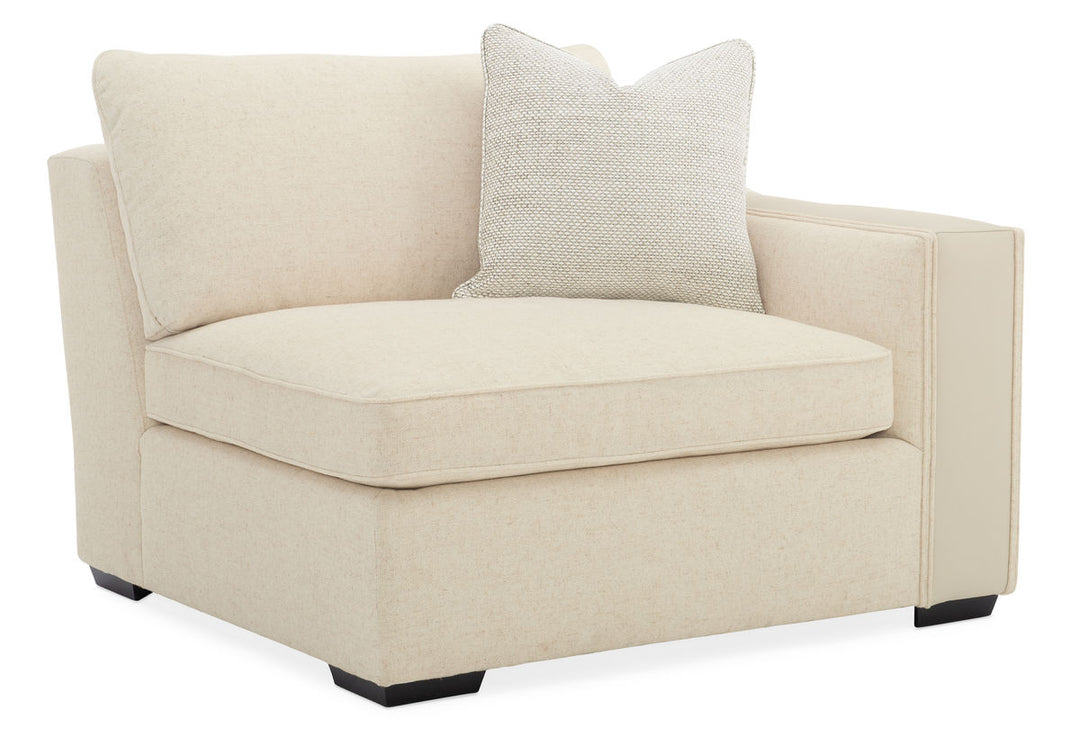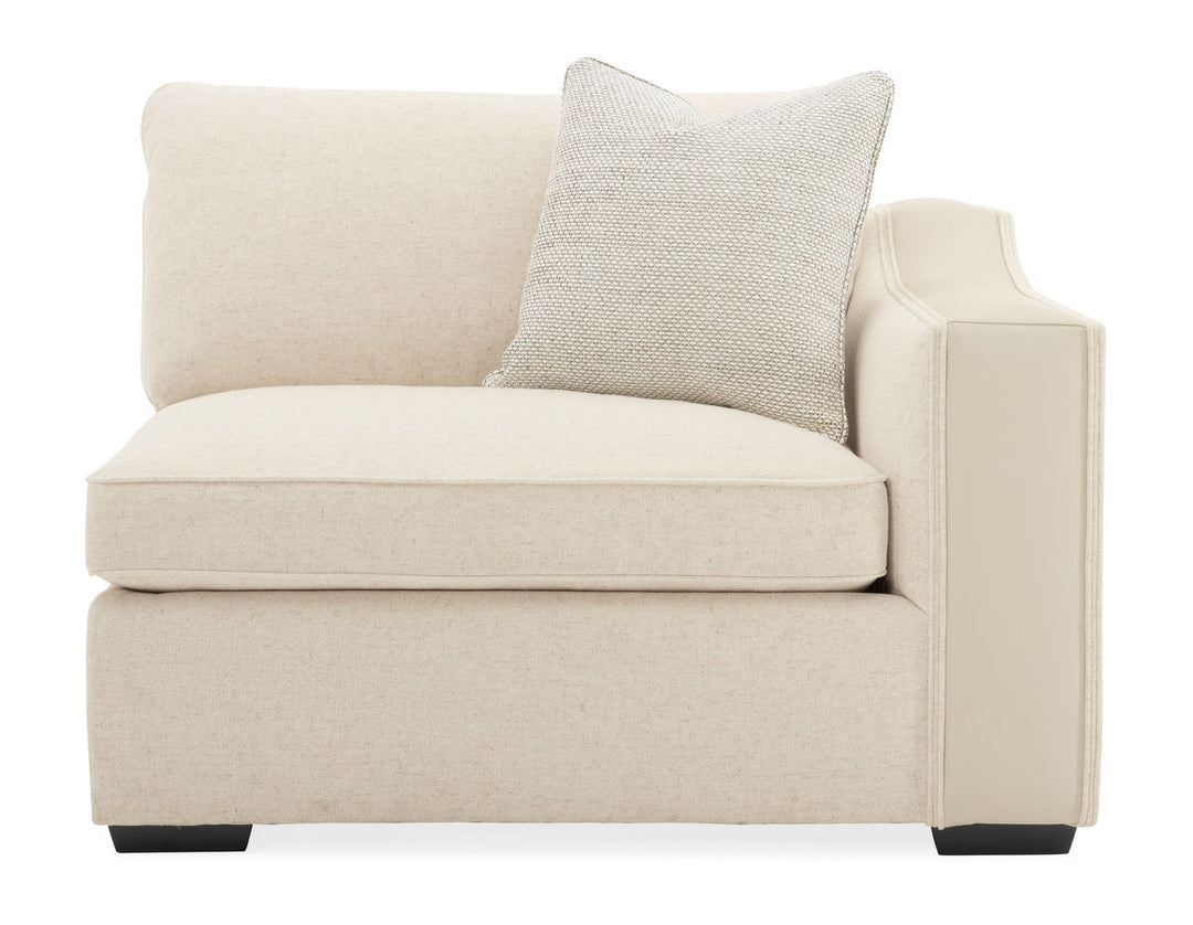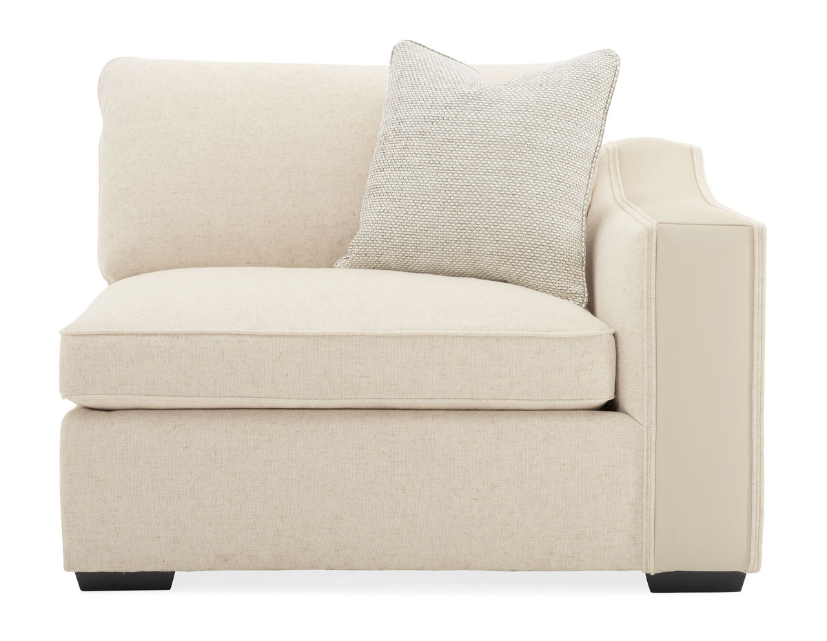 The ultimate setup for rest and relaxation, the beauty of this modular seating solution goes beyond skin deep it can be designed to fit your unique home. Customize its shape to your floor plan and enjoy just the pieces you want. You'll love this sectional's bold track arm and exquisite tailored detailing. Its creamy neutral fabric cover is sumptuously soft and paired with accent pillows in rich shades of mocha while an Almost Black finish gives its feet a contemporary vibe. Maxing out both style and versatility, this classic silhouette is a must-have for modern living and scaled to make everyone feel at home.FEATURES: Wide track arm with leather inset. Tapered block leg. Loose seat and back cushion.CONSTRUCTION: Springdown cushion. 8-Way hand tied seat. Feather down pillows.CARACOLE FURNITURECaracole furniture is inspired and sophisticated, offering an edited range of distinctive styles to set the stage for elegant modern living. Filled with personality, each piece is a breath of fresh air, elevating interiors with timeless fashion and modern details. From minimalist simplicity for contemporary spaces to signature styles inspired by classic design, Caracole is the epitome of modern luxury. These timeless looks are always on trend, bringing together superior craftsmanship and incredible style to re-imagine interior spaces with expression and creativity.