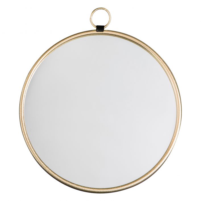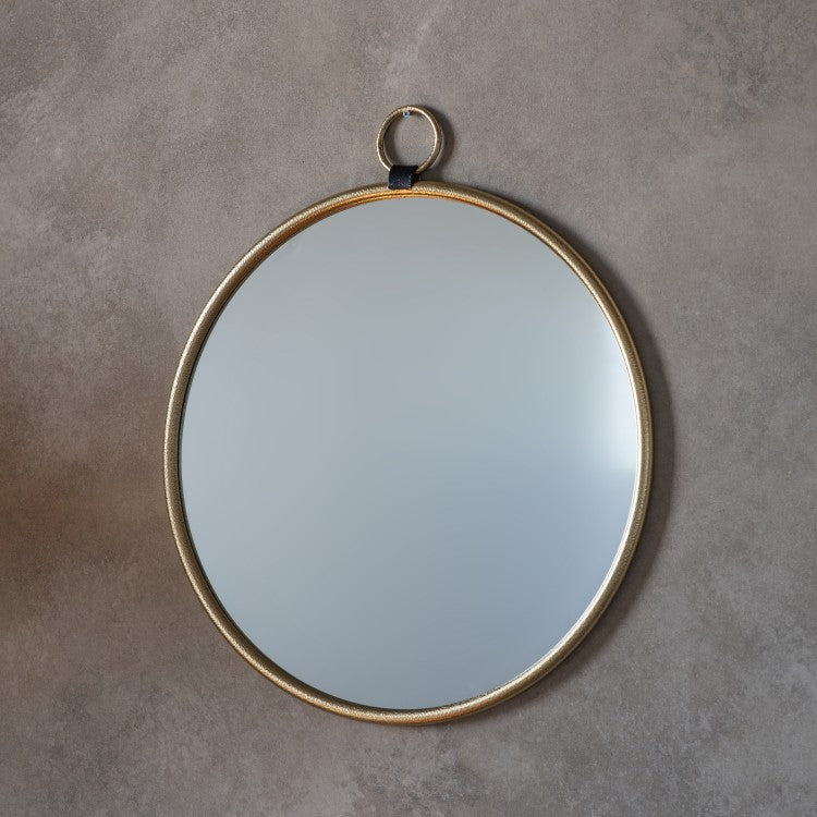 Simple yet stylish mirror with an industrial feel, featuring a gold coloured metal surround and 'hanging' loop, joined to the main frame by contrasting black metal to add a subtle detail.