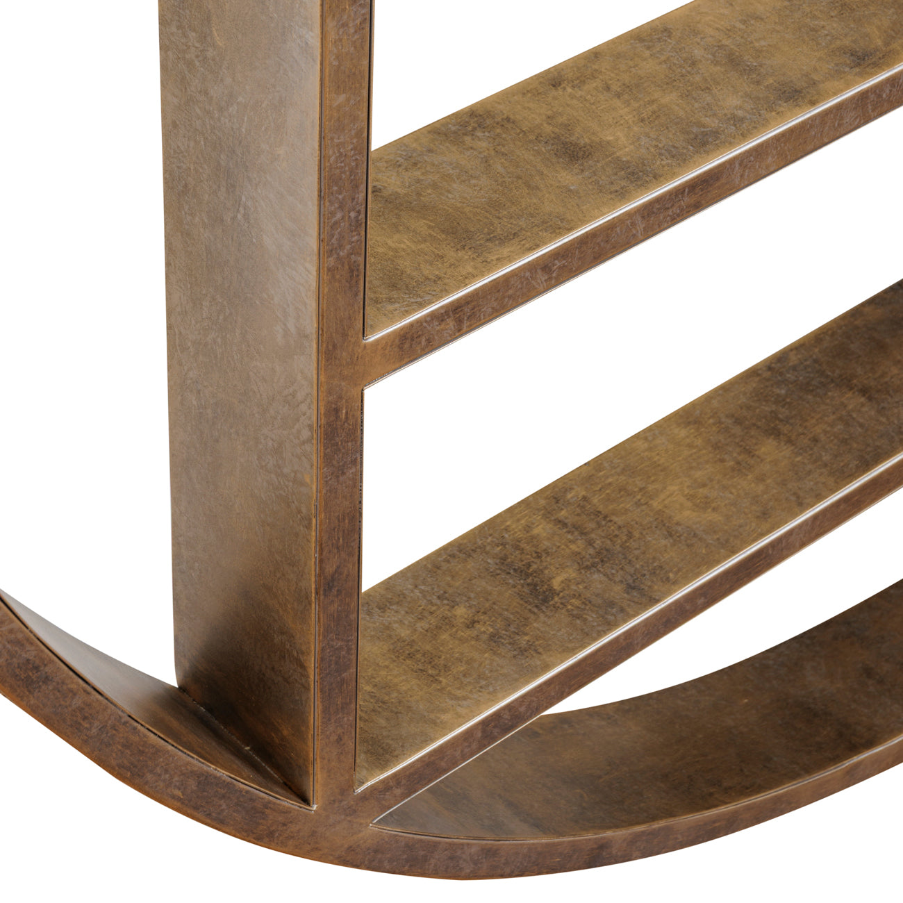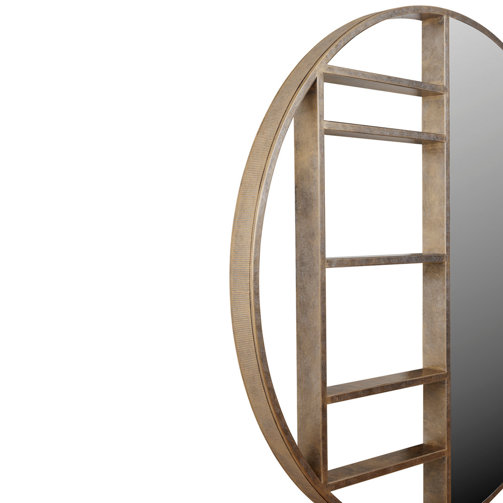 Commanding in scale and refined in detail, the Belvedere Shelving Mirror Large is a sculptural statement designed to anchor expansive interiors. Made in two parts and simply assembled, the mirror is made from iron with a champagne gold finish. The circular frame combines mirrored glass and integrated open storage across five shelves. The design unites form and function, offering reflective depth alongside display opportunities. Its corrugated iron edging introduces textural richness and a subtle industrial rhythm, softened by the warmth of the metallic finish. The generous proportions and carefully balanced composition make it ideal for reception areas, bedroom or living spaces where statement accents are appreciated.