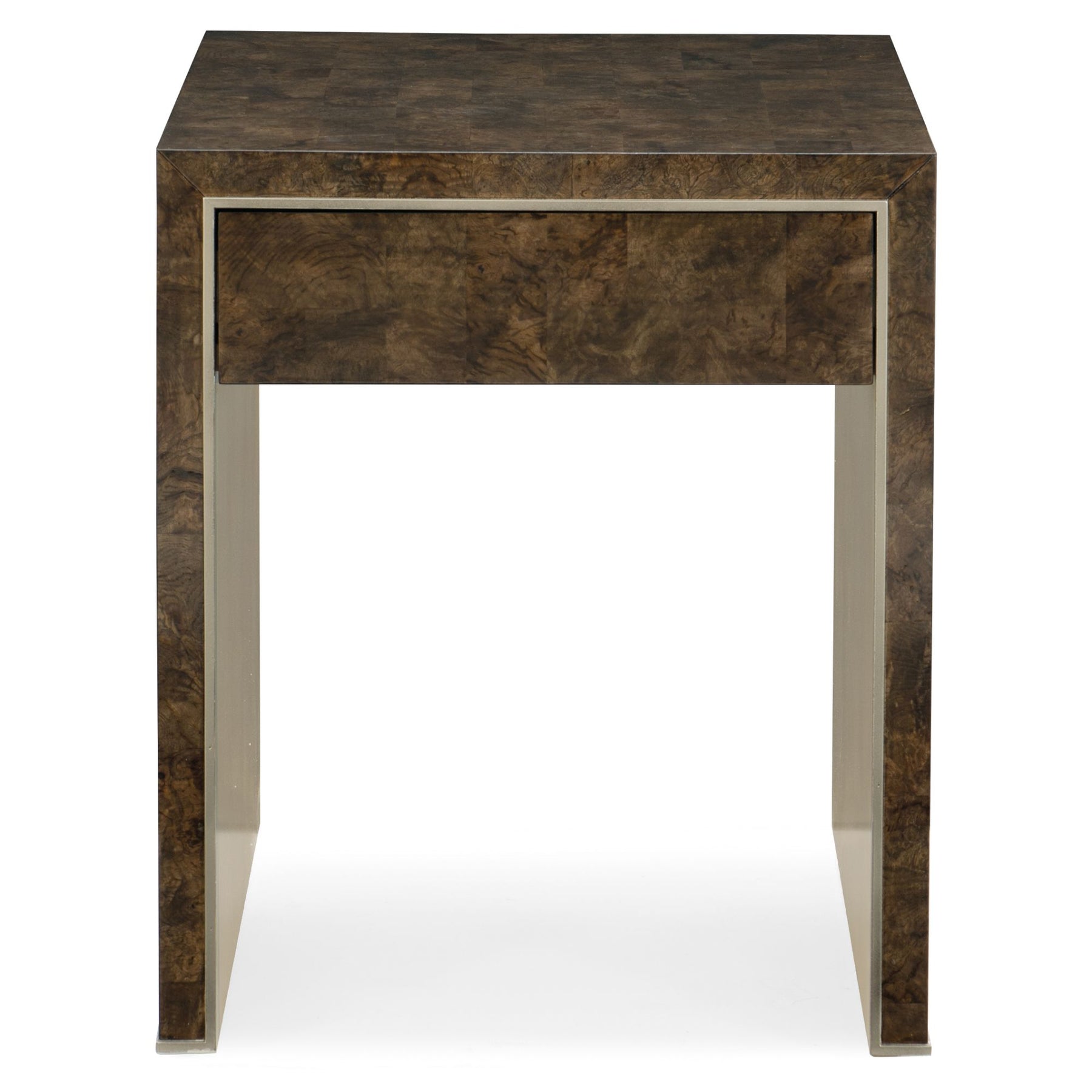Quite definitely a show-stealer, this smart table combines rich finishes to masterful effect. Its dazzling design features a distinctive pattern of randomly matched European Oak Burl in a rich Galway finish. Warm Golden Blonde Leaf highlights the inside of its end panels and edge moulding, creating a dramatic contrast. It's one soft-close drawer features a Chocolate Spice finish. You're not dreaming, it really is this exceptionally designed. Top, ends, drawer fronts and back panel are randomly matched European Oak Burl finished in Galway Burl. Inside end panels and edge moulding finished in Golden Blonde Leaf. One drawer with soft-close side guides and finger pull. Drawer interior in Chocolate Spice.