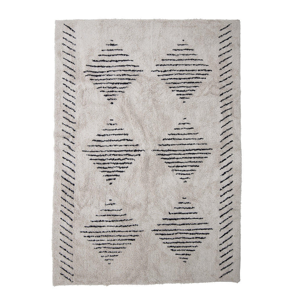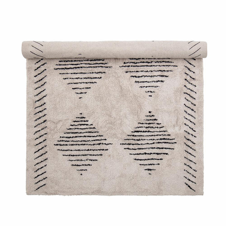 Smooth-tufted cotton rug with structured patterns in a simple design. The rug has a dense, soft pile that is comfortable to walk on. Care instructions: Vacuuming and spot cleaning only.