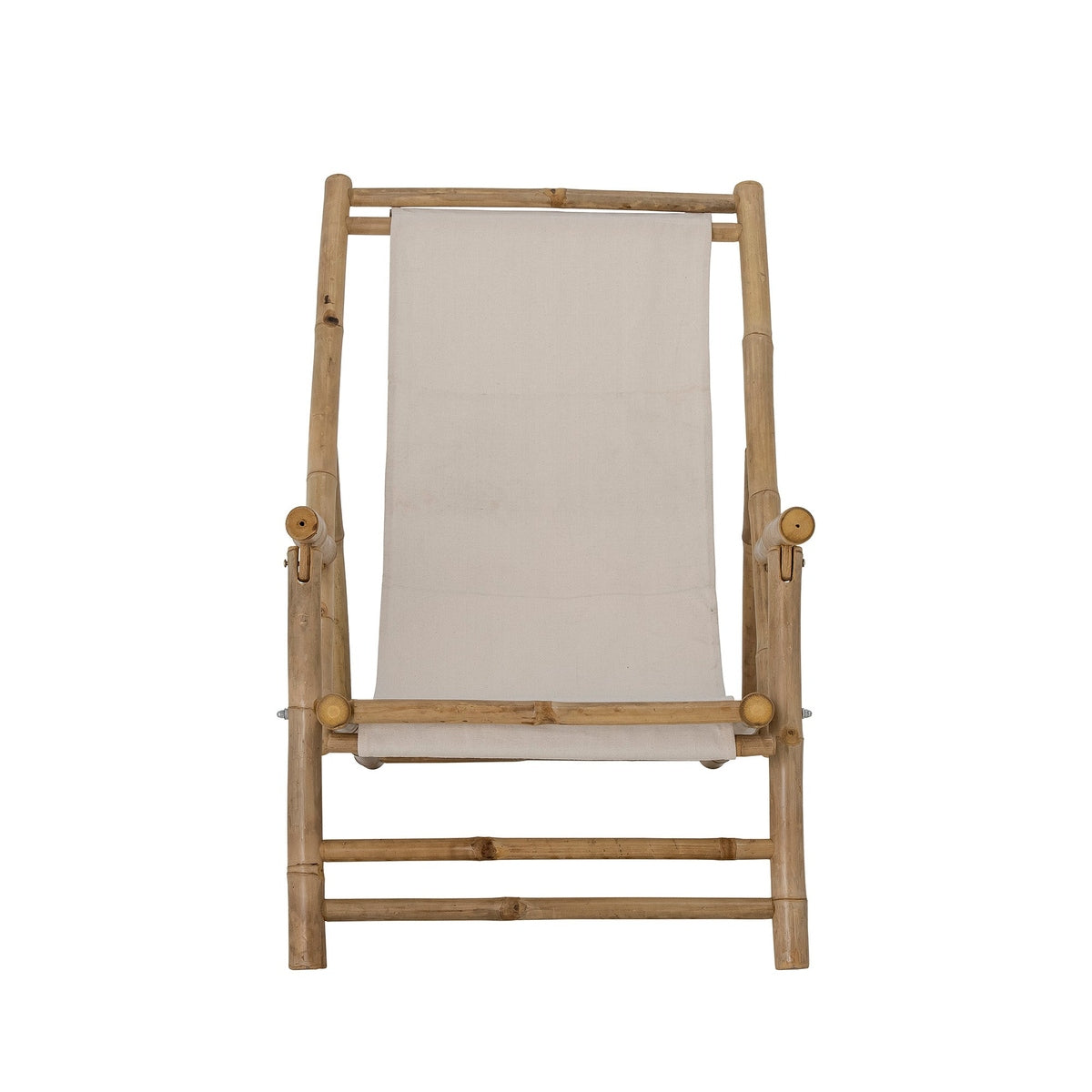 The Korfu Deck Chair by Bloomingville, crafted from bamboo, offers an organic, cozy, and homely feel. Featuring a seat made of light-colored cotton that imparts a beautiful Nordic look, the back can be adjusted in 4 levels for personalized comfort. This collapsible beach chair is easy to move around and is recommended for placement in a covered area.