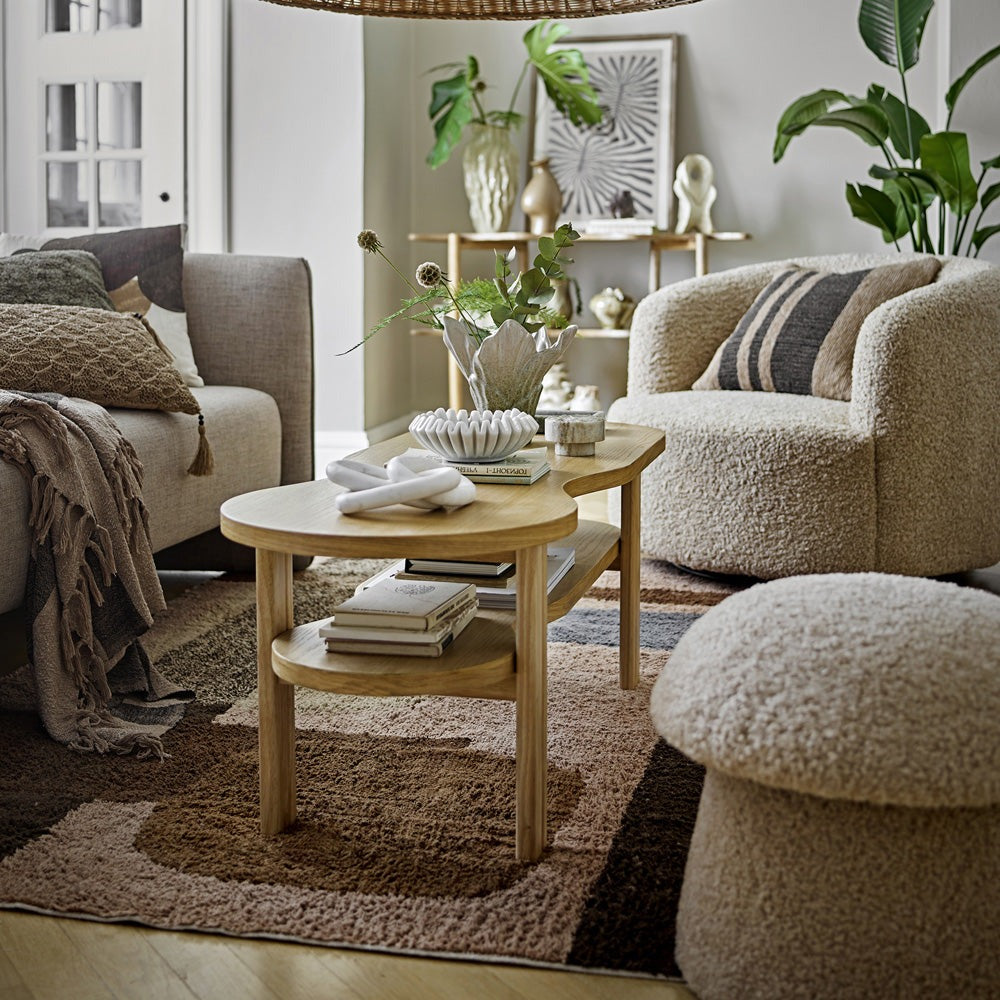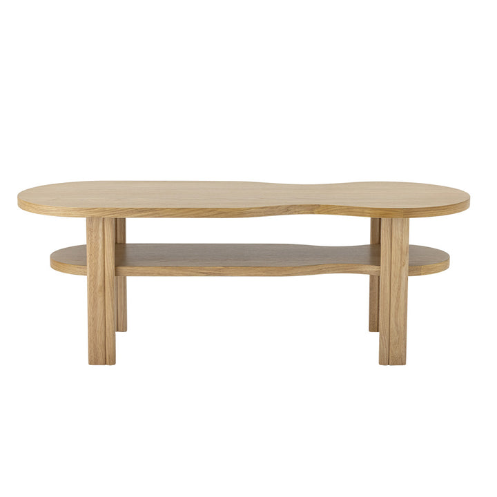 The Valria Coffee Table by Bloomingville features a simple yet elegant design with a natural oak veneer finish. Its curved shape gives it a soft, organic look, making it a versatile addition to any room. Whether in the living room or as a center table, its minimalist style adds a warm and inviting feel to your space. Practical and aesthetically appealing, this table is a functional piece that complements a variety of interior styles.