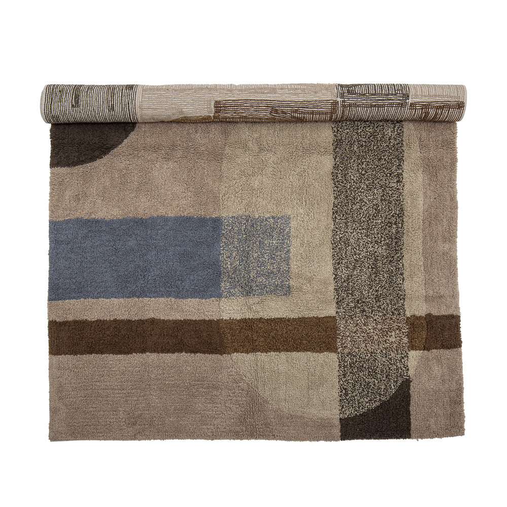 The Zofia Rug by Bloomingville is made of cotton. It has a beautiful tufted graphic pattern in a beautiful blue and earthy color combination. It will create atmosphere for any room.