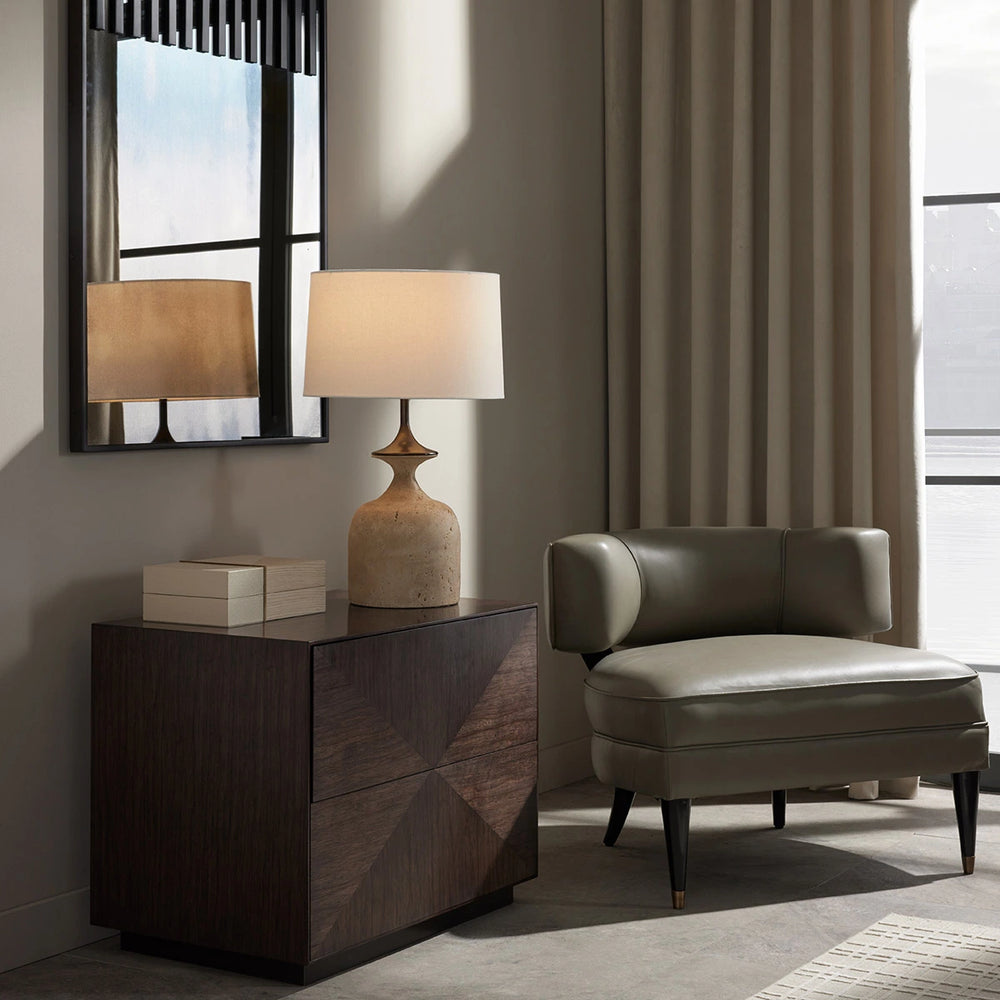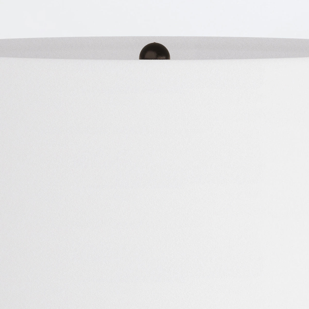 Inspired by the shape of a tulip, the Bridgeport is updated in a modern mix of materials. A base of faux travertine in a neutral sand shade curves elegantly to embrace an English bronze detail. Its drum shade of off-white linen with off-white cotton lining, it is anchored with a matching sphere of English bronze. Taupe cloth cord and three-way rotary switch. Finish will vary.