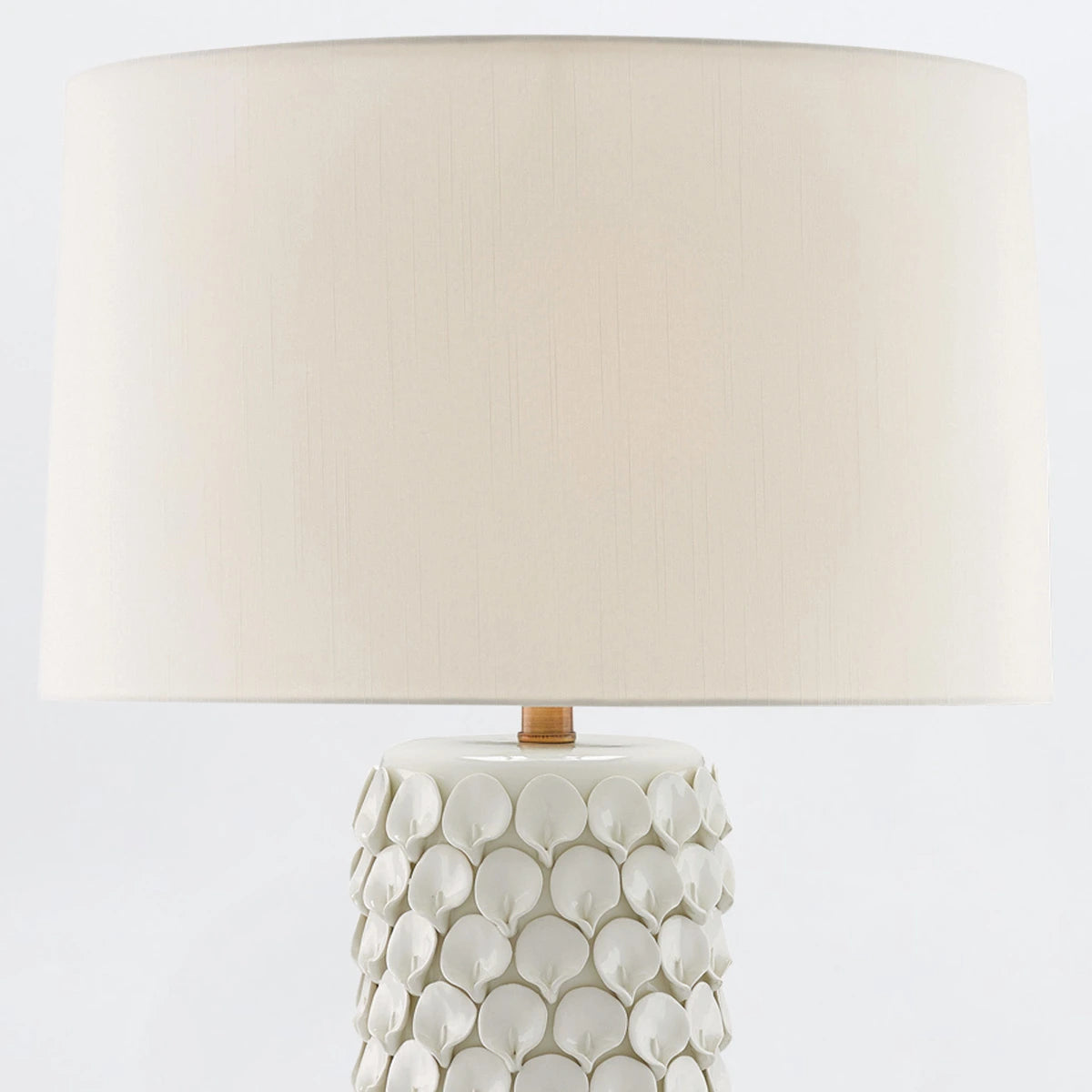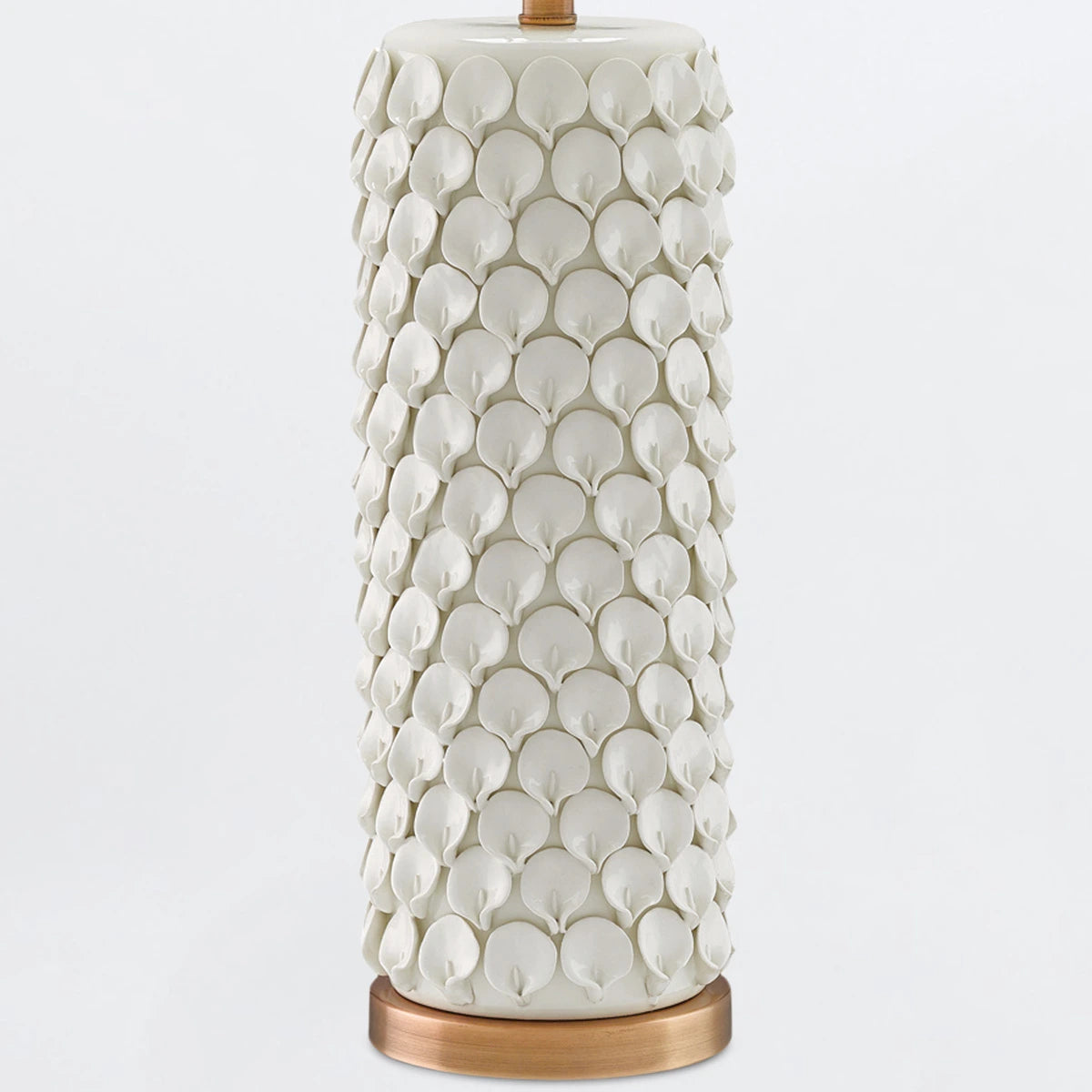 Intricate hand-formed ceramic flower petals cover the surface of the Calla Lily Table Lamp. The textural interest of the petal-covered column is heightened by the antique brushed-brass accents. The white lamp is topped with an eggshell shantung shade that completes this pretty composition.