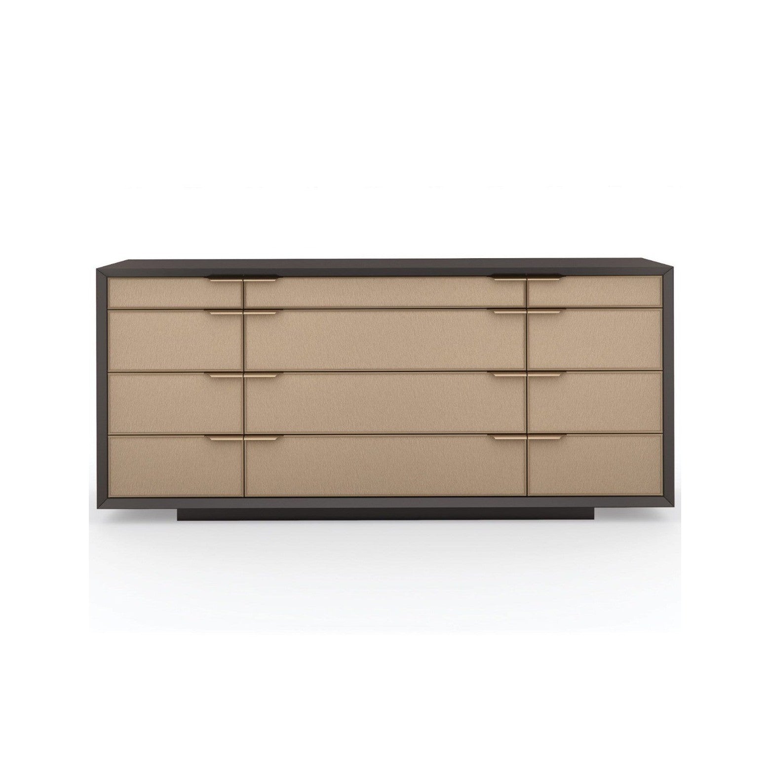 Merging minimalism with elements of mid-century modern, this streamlined dresser introduces a sophisticated style to bedroom interiors. Each drawer front is wrapped in a beautifully textured vinyl, embossed with a rivulet pattern like rain trickling down a windowpane. Casting a warm glow, metal trim in Champagne Gold artfully incorporates rounded pulls to seamlessly frame each drawer. Offers generous storage with soft-closing features and two felt-lined top drawers for an added note of luxury. Case in Dark Chocolate. Metal trim in Champagne Gold. Twelve drawers with vinyl fronts. Top outside drawers with felt lined bottoms. Tops drawers with side guides and rest of drawers with undermount soft close guides. Drawer interiors in Dark Chocolate. Plinth base in Dark Chocolate.