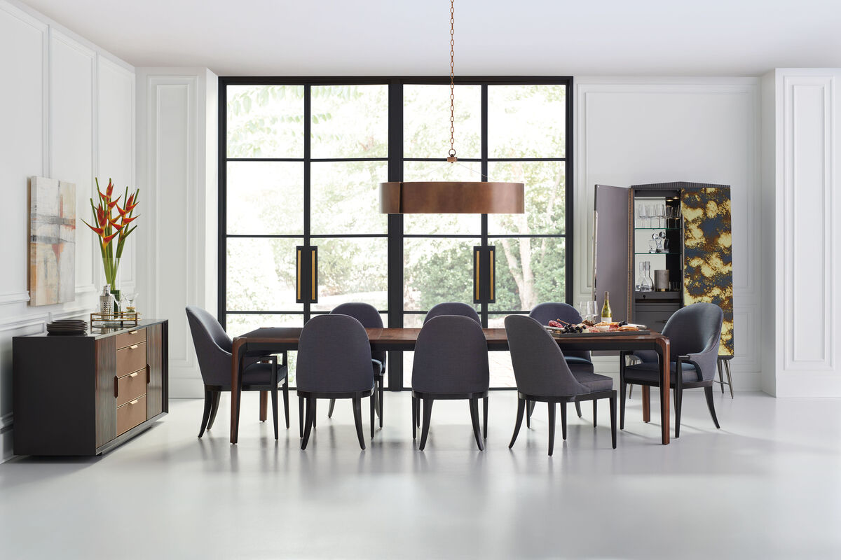 A masterful mix of form and function, this mid-century-inspired console stirs interest with its linear design and host of storage options. Sliding tambour doors in Rich Walnut add texture and contrast to a Dark Chocolate finish. Framed in Champagne Gold, four centre drawers feature vinyl fronts, embossed with a pattern reminiscent of rain trickling down a windowpane. Expansive storage offers two fixed shelves on the left, offset by five soft close drawers on the right. Modern and multifunctional, its clean-lined design is well-suited for living, dining, and bedroom interiors. Top, ends and face of frame in Dark Chocolate. Metal trim in Champagne Gold. Tambour doors on each end in Rich Walnut with two fixed shelves on left side and five undermount soft close drawers on right side. Four centre drawers with vinyl fronts and soft close undermount guides. Top drawer with felt lined bottom. Interior in Dark Chocolate. Plinth base in Dark Chocolate.