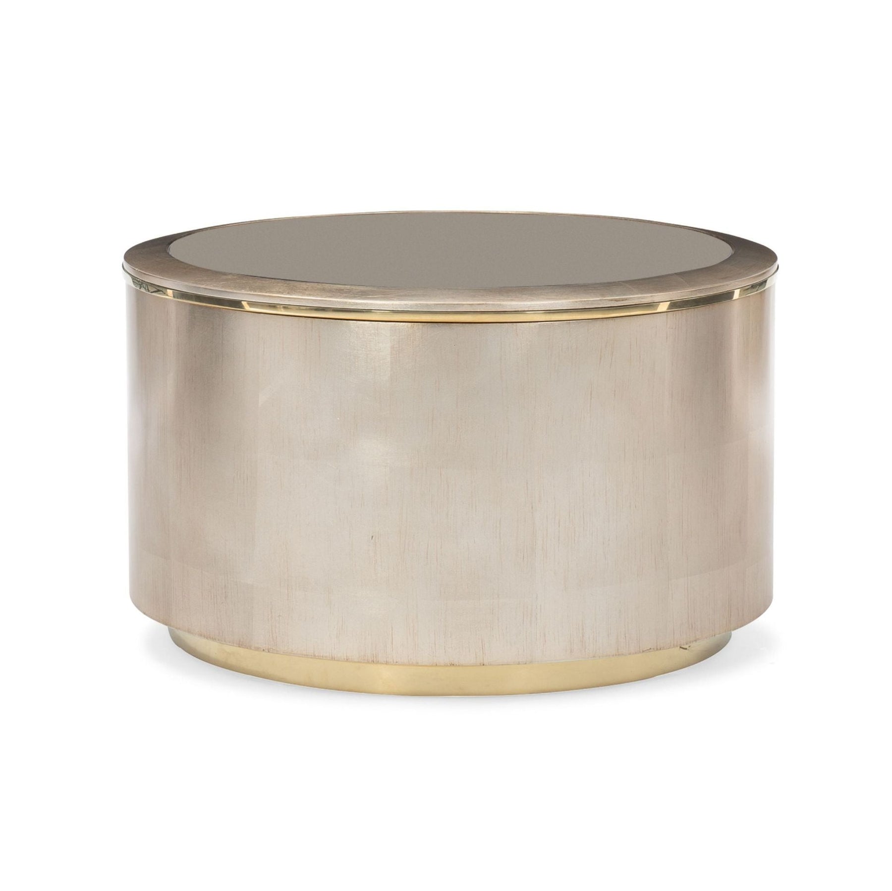 Bold and beautifully balanced, this round cocktail table artfully mixes cool silver leaf tones with the warmth of gold. Features a reflective bronze mirror top for added depth, and hidden storage to keep the look clean. Use it to centre a room, or bunch together with our All Around cocktail table to create a memorable seating area. Case finished in Auric. Bronze mirror top with Gold Bouillon metal inlay and base.