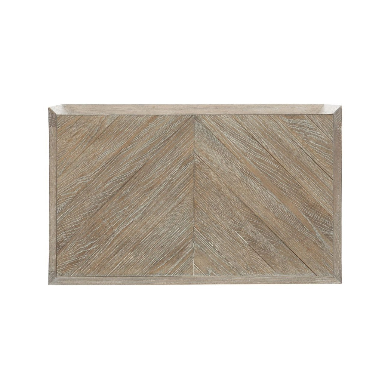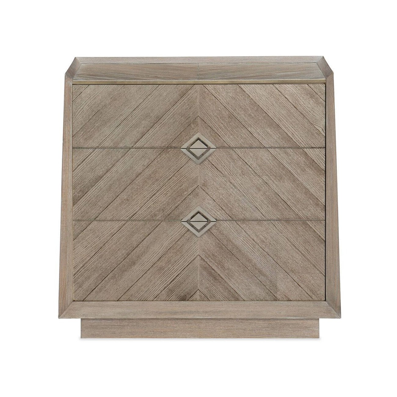 A stunning bedside companion, the Crossed Purposes nightstand clearly has the WOW factor. A simple, slightly tapered silhouette accentuates the inherent beauty of its natural materials. Perfectly matched directional woodgrain veneers create a one-of-a-kind chevron pattern that attracts the eye without competing with other pieces in the room. An easy-going Ash Driftwood finish brings out the beauty of its stunning natural lines and will complement any statement bed while a bead of Sundance Gold gives the top edge a touch of shine. Fully finished drawers wear an interior shade of Putty and are ideal for storing books, magazines and night-time essentials. Case finished in Ash Driftwood. Three drawers with soft close side guides. Interior in Putty. Back cord access and USB port top left.