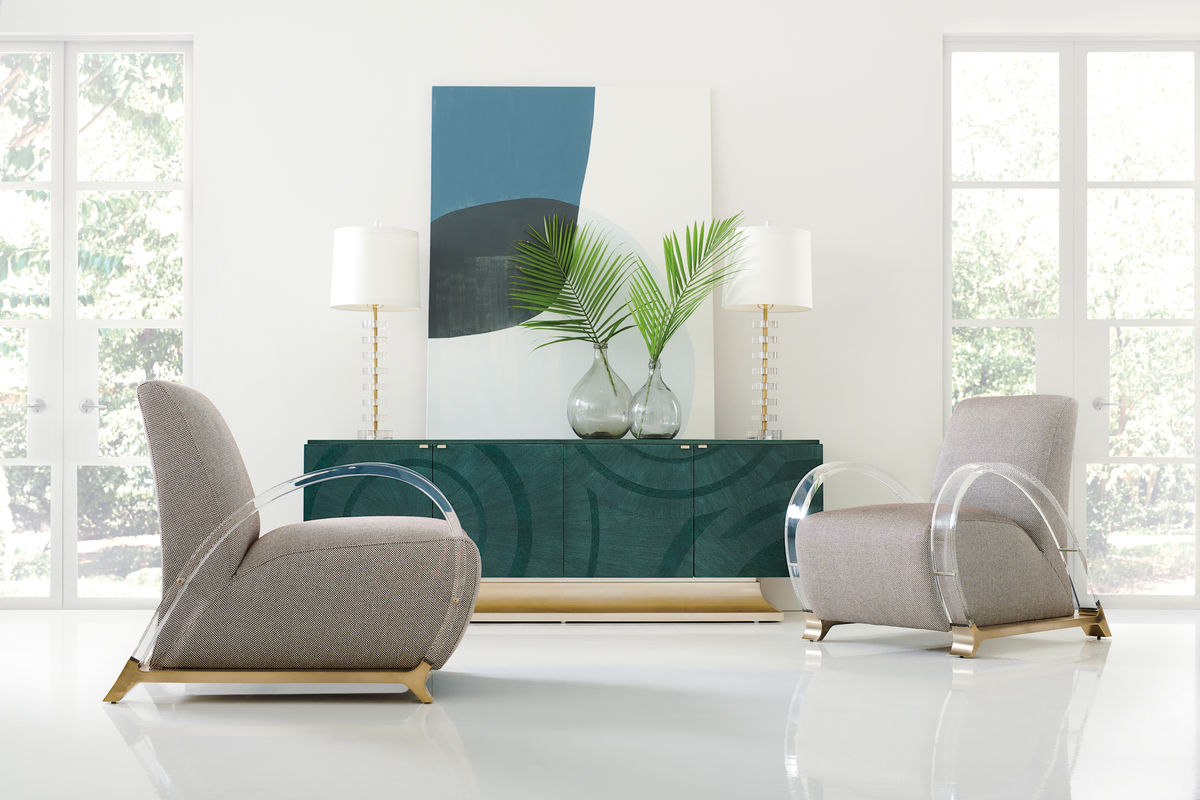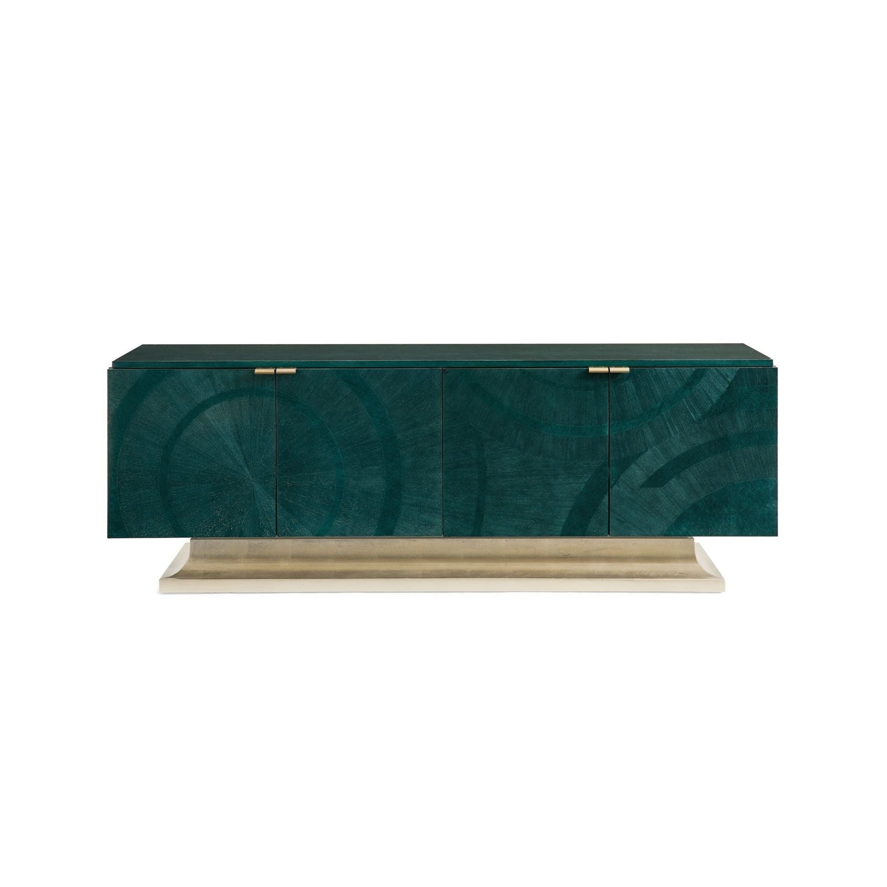 A stunning statement-maker, this impressive console is distinguished by an Art Deco-inspired pattern brought to life in a can't-miss shade of Peacock over Koto veneers and Bird's Eye maple inlays. A luxe Golden Blonde Leaf finish highlights its base while its four doors open with tab pulls to reveal generous storage space and adjustable shelving and wire management. Case is Bleached Koto with Bleached Birds Eye maple inlay in Peacock finish. Base finished in Golden Blonde Leaf. Four doors with metal tab pulls. One adjustable shelf behind each pair of doors. Interior finished in Warm Reflections paint. Wire management holes in back panel and partitions.