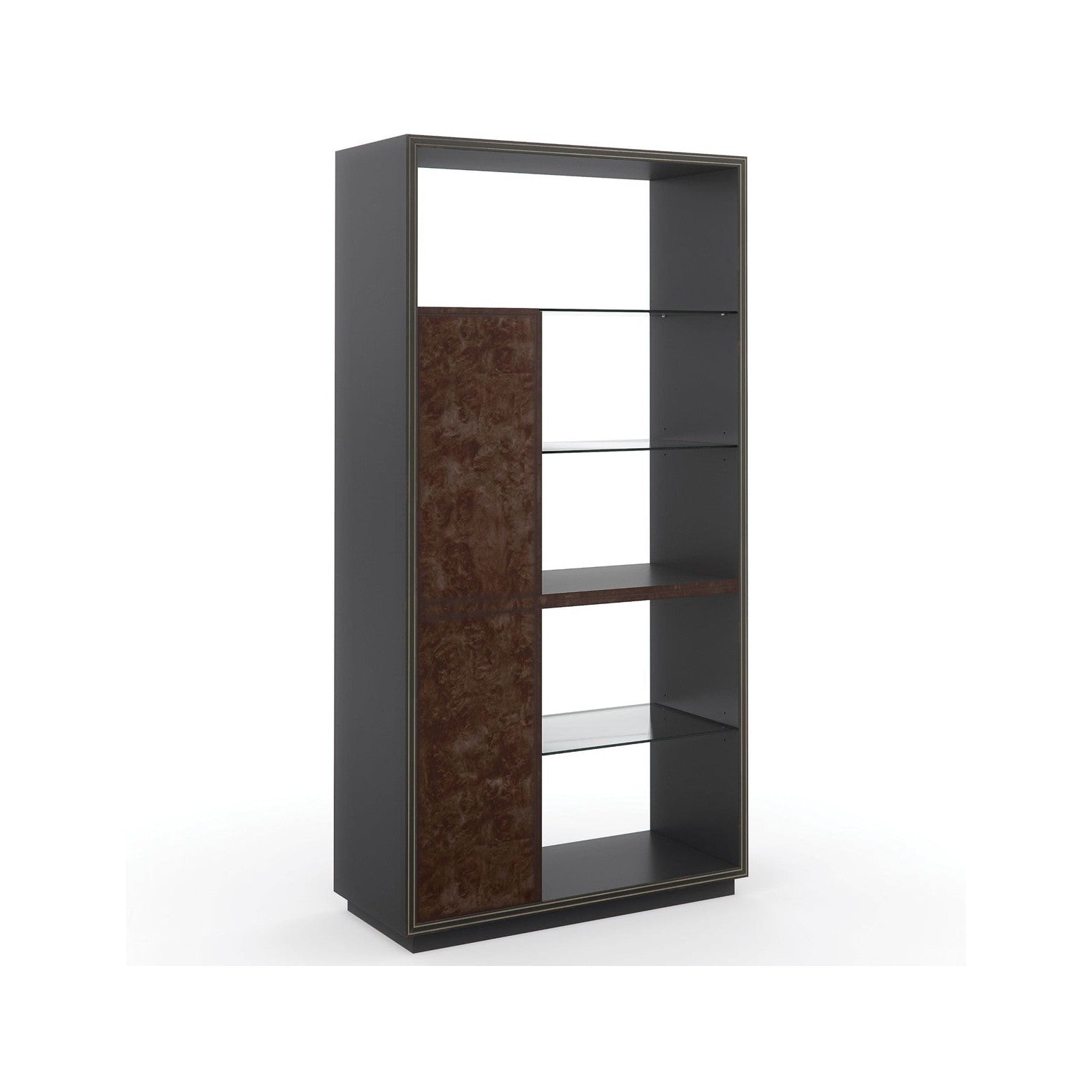 A well-crafted take on functional storage and display, this contemporary cabinet pairs warm wood tones with polished metal for a refined use of materials and finishes. Framed in a Warm Slate finish, its shadow box-like design features ample open space and adjustable glass shelves. On the right, its Sepia burl clad storage space is accented by Champagne Gold hardware, creating the appearance of an asymmetrical, box-within-a-box. For added function, the centre shelf features a pull-out tray for service, or a place to rest one's glass while admiring books and collectables. Both sides are fully finished, so it can function as a wall piece, or a free-floating divider. Case finished in Warm Slate. Metal trim and hardware in Champagne Gold. Frame box of door area, door fronts and top of pull out shelf in Sepia Burl. Two doors on right side with two interior adjustable glass shelves. Left side with top and middle fixed shelves. Center pullout work surface and open back. Case is finished on both sides.