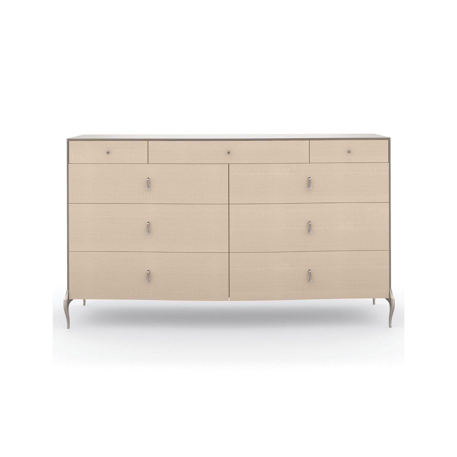 Poised to make an elegant first impression, this generous dresser introduces a refined mix of natural materials, with soft colour palettes and a shimmering silver finish. Features nine soft-close drawers with fronts in Vanilla Cream, a soothing contemporary finish that brings to light the decorative character of figured sycamore. Elongated drawer pulls, inspired by an Art Deco jewellery pendant with a faux stone centre, add a touch of grace. Ornate metal legs mimic flowing lines and a subtly curved top in Soft Silver Paint. Two felt-lined drawers on the top left and right add a note of luxury to intricately painted interiors. Case in Soft Silver Paint. Nine drawers with fronts in Vanilla Cream with softclose undermount guides. Top left and right drawer bottoms are felt lined. Drawer interior in Soft Silver Paint. Metal legs in Soft Silver Paint.