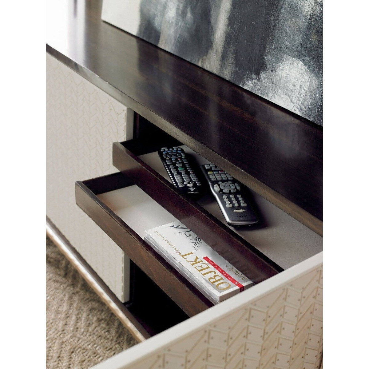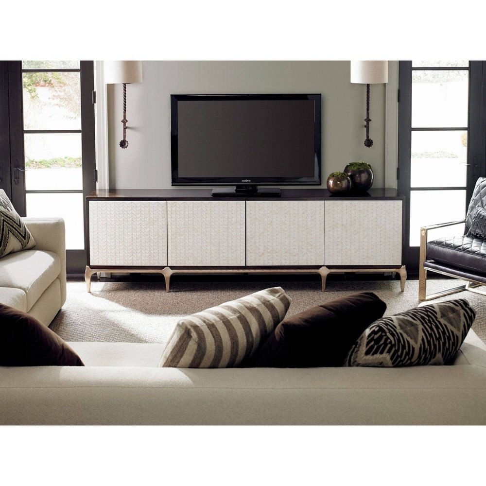 At 100-inches wide, there couldn't be a more dramatic centrepiece for both entertainment and design enthusiasts. Used with or without the largest plasma screen, the face of this cabinet is sure to capture everyone's attention. Each of the four touch latch doors feature over 300 pieces of white faux bone, individually applied and secured with petite, polished brass nail heads. The moulded base is finished in Gold Bullion Paint. The cabinet case is made of fumed Eucalyptus veneers and hardwoods finished in a dark French Roast. If the movie isn't anything to talk about, this entertainment centre will keep the conversation going. Four touch latch doors with resin faux bone overlay. Behind right and left door: two adjustable shelves. Behind each center door: three drawers and opening.