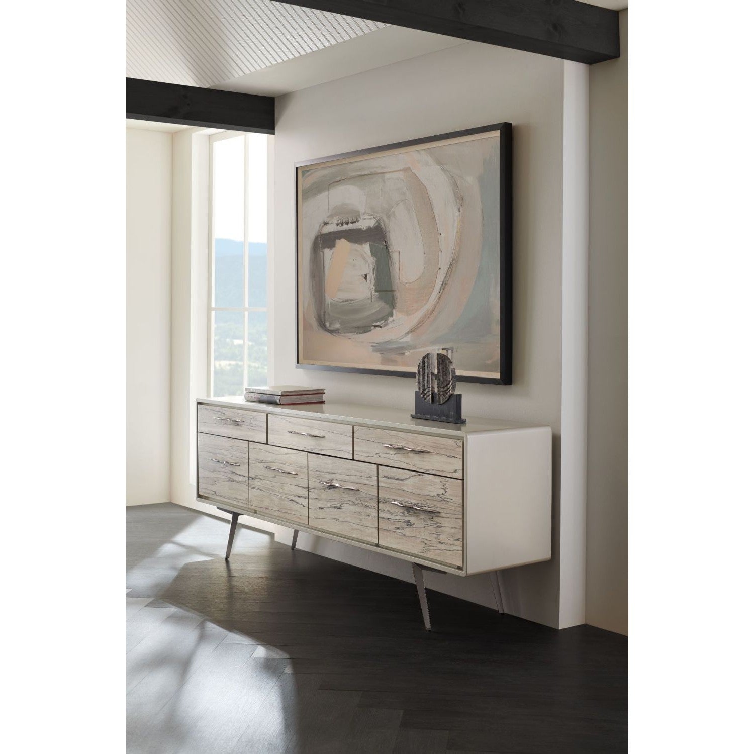 An artful interpretation of found beauty in the natural world, this clean-lined credenza brings a look of casual luxury to living interiors. Masterfully crafted with top drawer fronts and bottom doors in Snowcap Organic–our exclusive, bleached white printed spalted maple veneer–and encased in a Matte Pearl finish for a hint of shimmer. Custom hardware adds interest and emulates the marble-like veining of spalted maple. Features cut-outs in the back for wire management, and adjustable metal legs that allow you to raise the height for a more traditional console, or lower it to accommodate media. Top frame and ends in Matte Pearl. Four bottom doors with fronts in Snowcap Organic and European softclose hinges. Three top drawers with fronts in Snowcap Organic and soft close undermount guides. Metal legs in Deep Bronze. Wire management exit holes in back. Interior in Matte Pearl. Hardware in Deep Bronze.