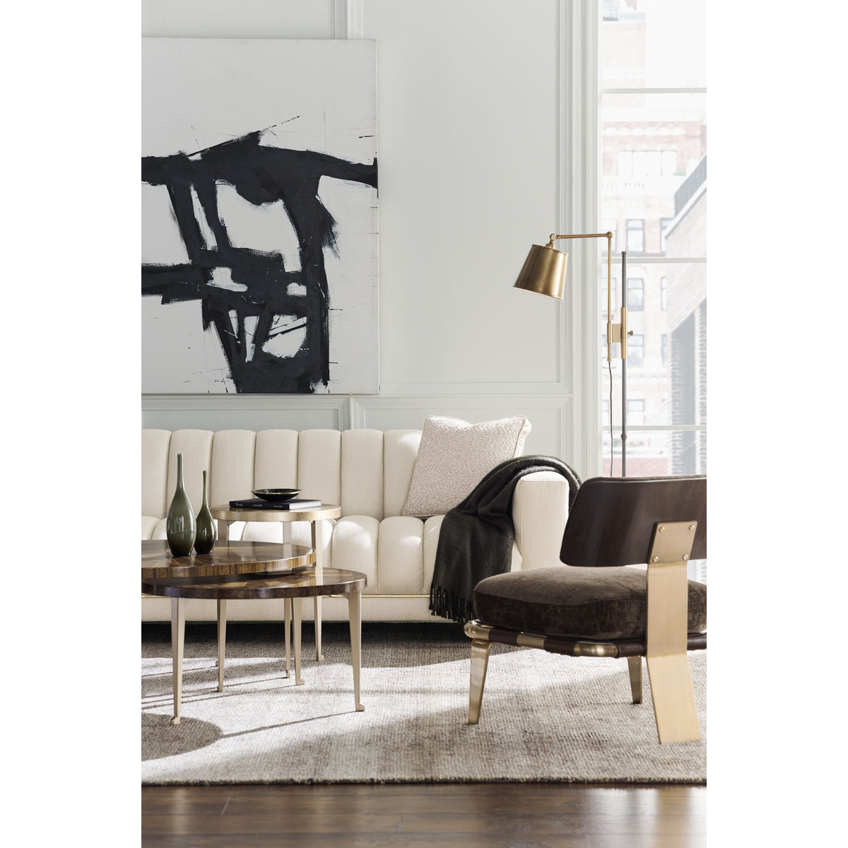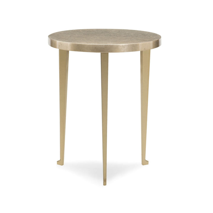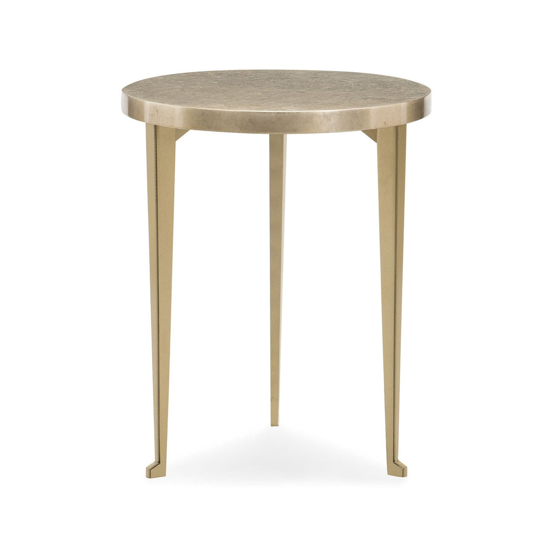 A treasure in itself, this petite table makes it easy to create an artful space. Glowing with the warmth and richness of pure honey, it features an intriguingly unique top created from layers of Golden Blonde Leaf applied in alternating patterns. Perfect next to a chair or anywhere you need a touch of brilliance, its eye-catching look is finished with three legs wearing a Golden Shimmer finish. Top is finished in Golden Blonde Leaf applied in a random broken pattern. Three legs in Golden Shimmer. Ships KD. Bunches with CLA-418-409 and CLA-418-4010.