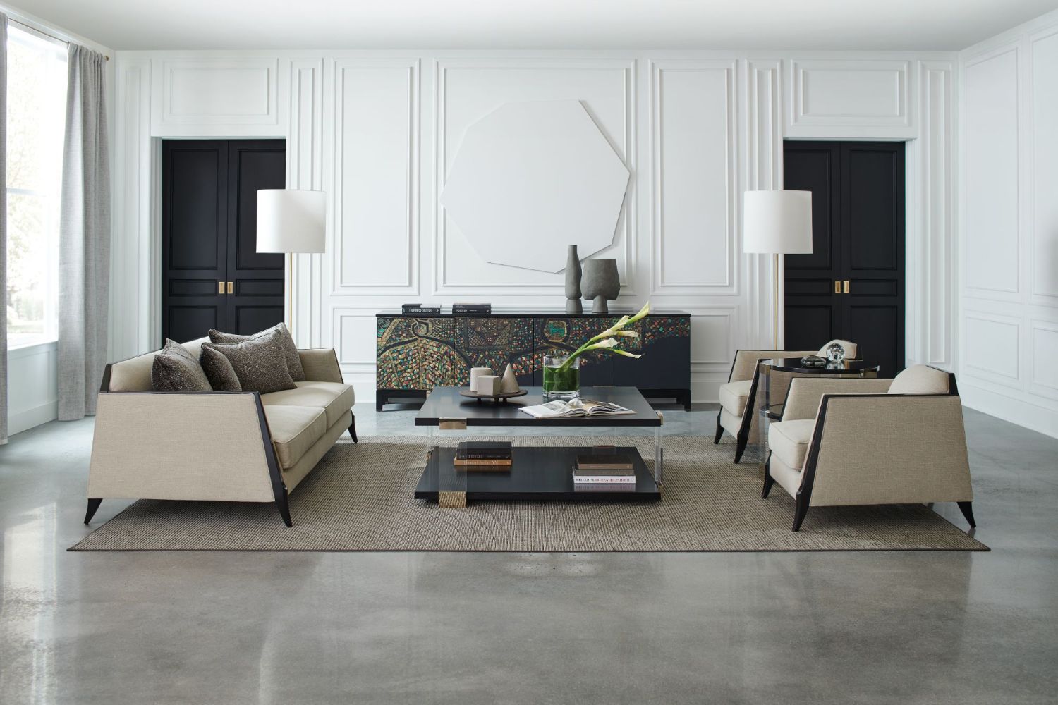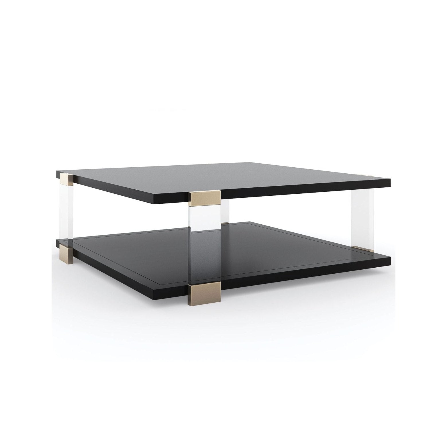 Instantly elevating, this square cocktail table brings a beautiful balance of linear forms and light. Its Tuxedo Black tabletop and shelf appear to float within clear acrylic posts, for a look that stirs interest, without imposing. Whisper of Gold metal accents create shimmer and moments for reflection. Centres a room, and offers ample space to style books and decor, above and beneath. Table finished in Tuxedo Black. Metal trim in Whisper of Gold. Acrylic posts.