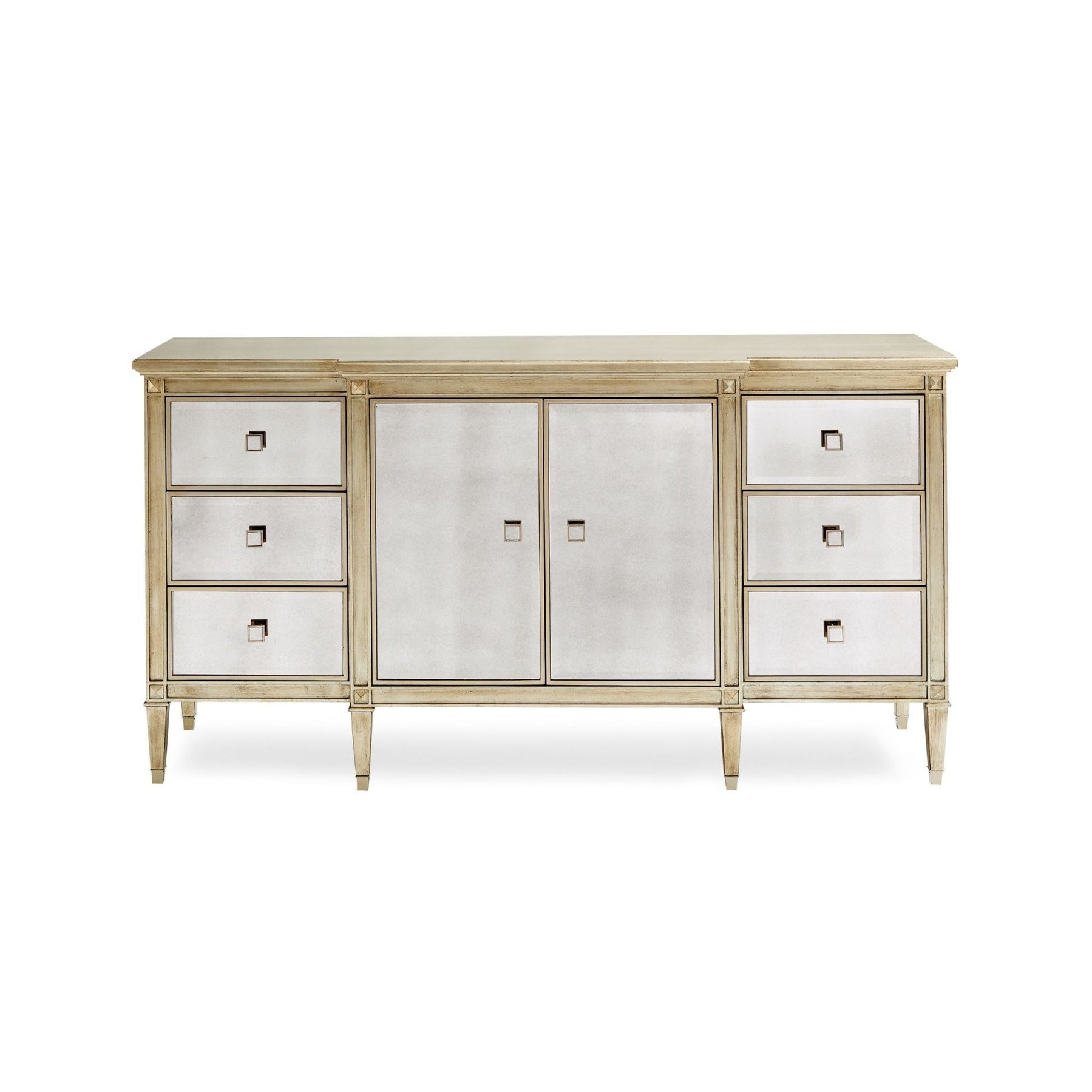 Linear Italian styling has been given a modern twist with the addition of a lustrous Auric silver leaf finish and beautiful bevelled antique mirror facades. This carved dresser features six soft-close side drawers with custom-designed square metal/mirrored pulls. Two centre doors open to reveal a tray drawer and one shelf for generous storage. The entire interior is finished in sparking Gold Bullion Paint. Beautifully carved square tapered feet with metal ferrules lift this piece off the ground in style. Six drawers with soft-close undermount guides. Two doors. Behind doors is one tray drawer and one adjustable shelf. Beveled antique mirror on front of drawers, doors and end panels. Metal ferrules. Hardware has inset antique mirror face.