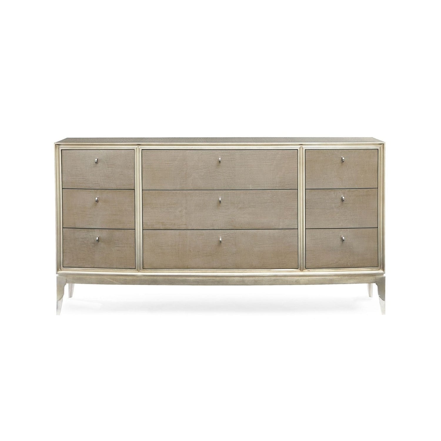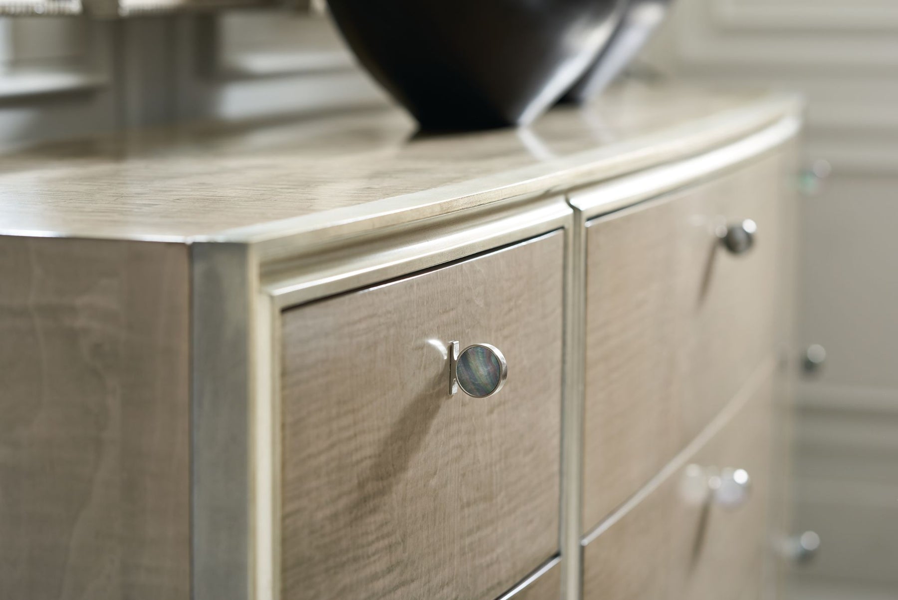 The ultimate expression of style, this nine-drawer design will add signature glamour to an interior. Its harmonious appearance creates a sophisticated effect with a soft palette of shimmering finishes of Moonlit Sand over Silver Curly Maple, and Soft Silver Leaf accents on its front frame and base. Lightly Brushed Chrome metal ferrules lends a touch of reflectivity. Case in Moonlit Sand with front frame and base in Soft Silver Leaf. Nine drawers with undermount soft-close drawer guides. Drawer interiors in Silver Glaze. Legs with metal ferrules in Lightly Brushed Chrome.
