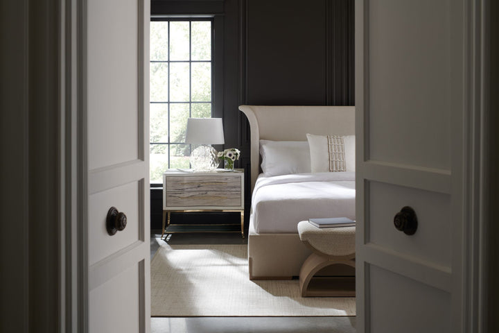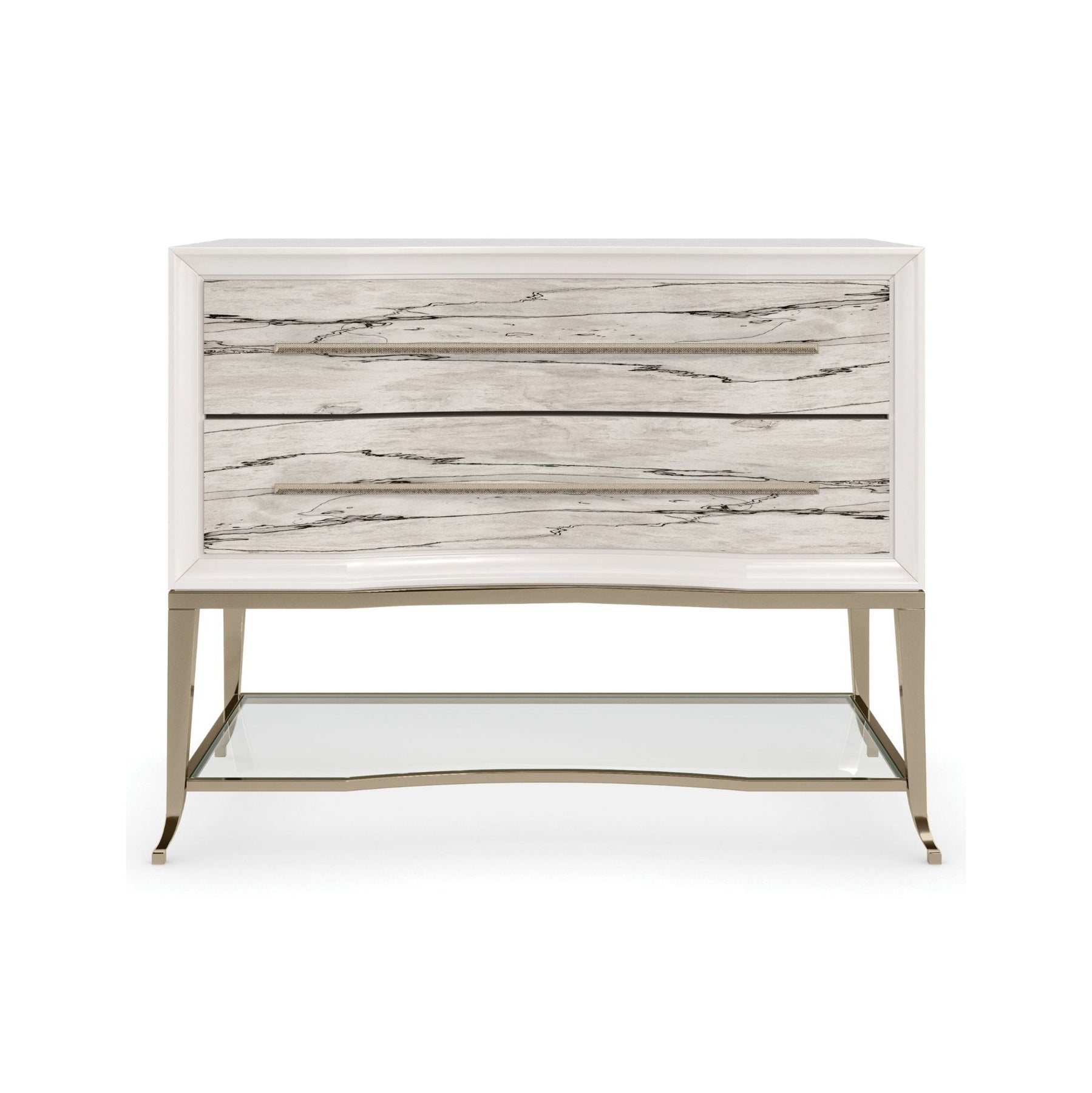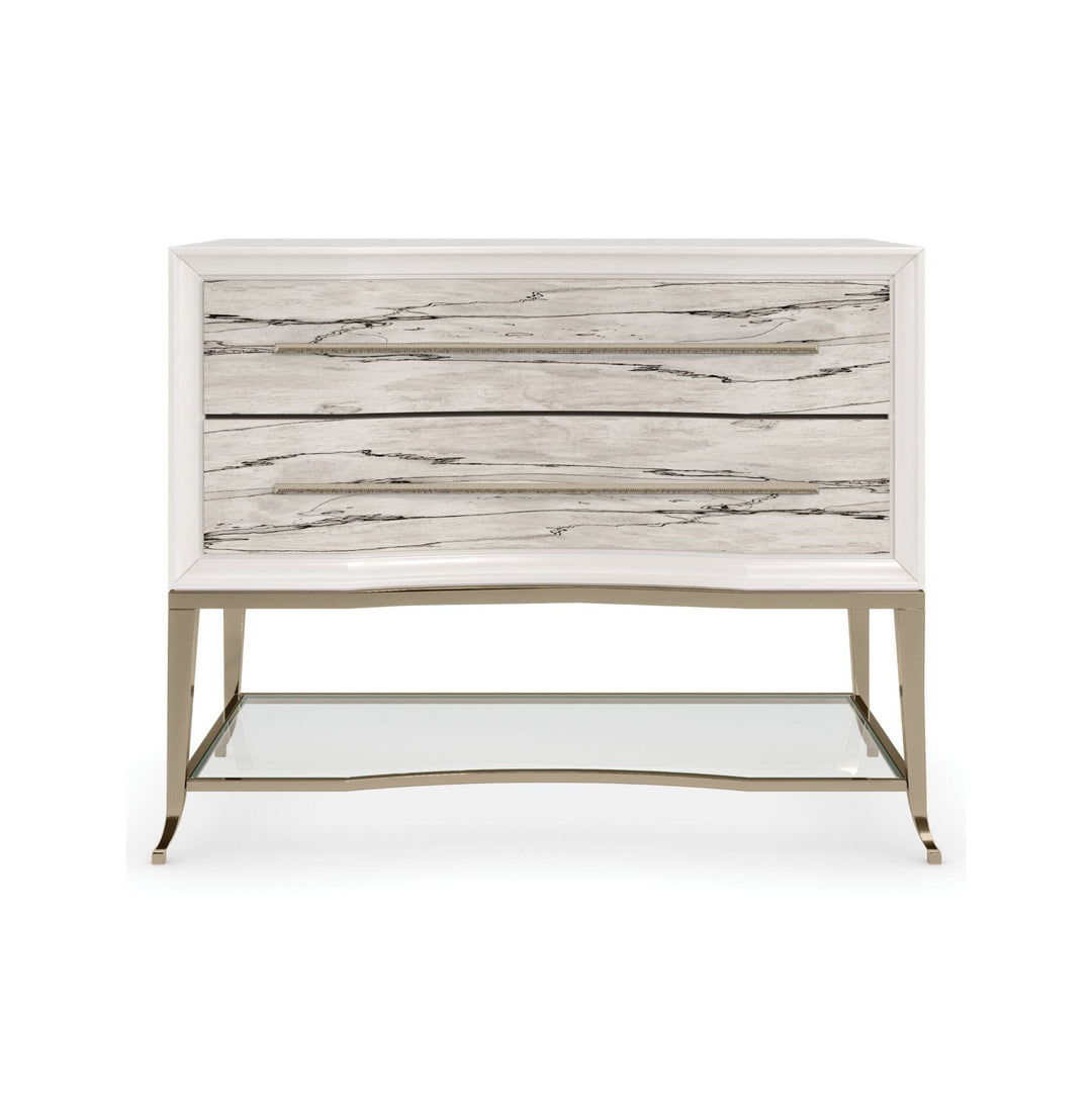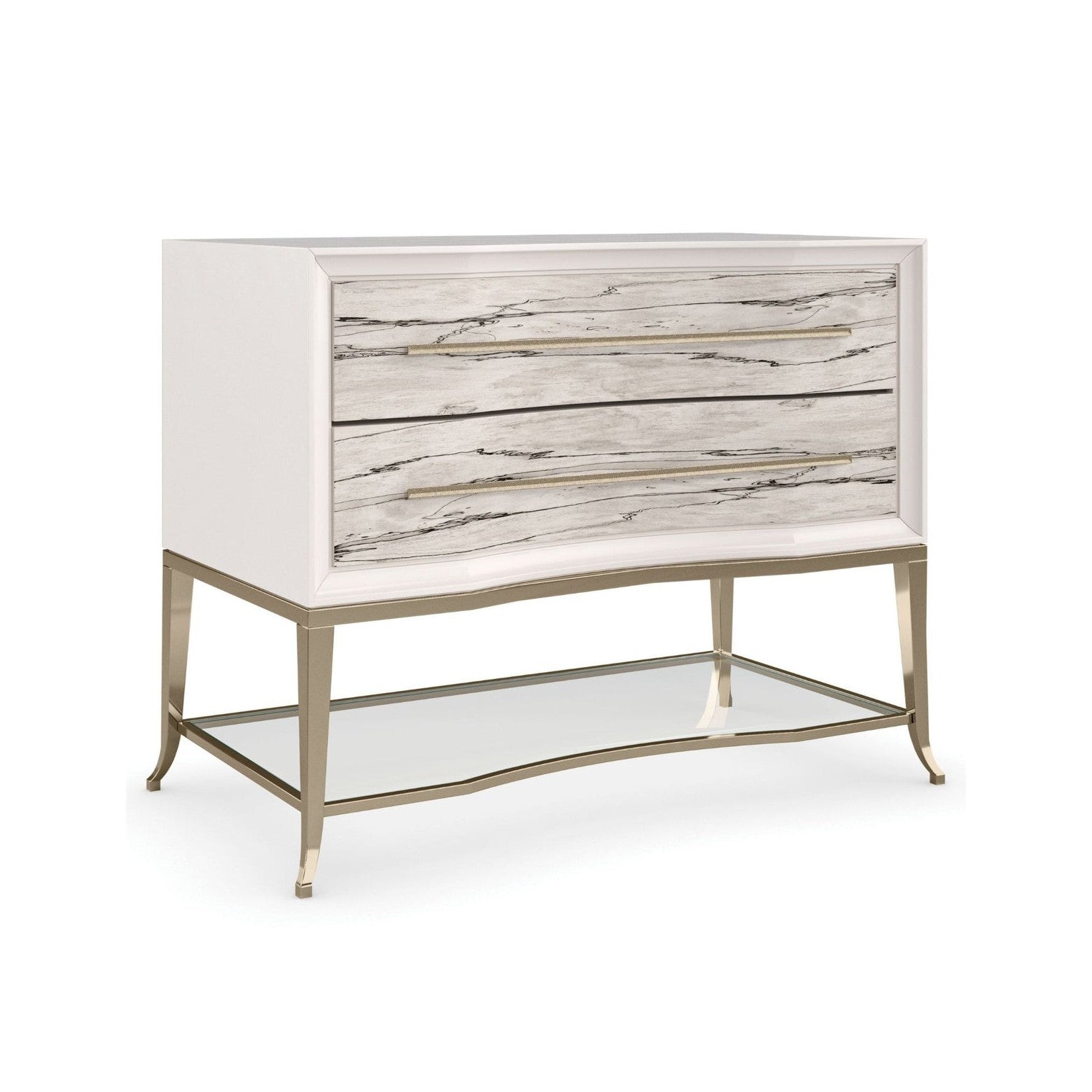 An elevated take on found beauty in the natural world, this nightstand introduces an organic element with a touch of luxe. Drawer fronts crafted in our exclusive, bleached white printed spalted maple add depth and dimension with dark veining patterns over a light ground reminiscent of fallen snow. Dimpled bar drawer pulls and a Majestic Gold base are a glamorous complement to its Pearly White finish, which pairs well with other pieces in our bedroom storage collection. Top drawer features dividers and a removable sliding jewellery tray, with a glass shelf beneath for open storage and display. Metal base in Majestic Gold. Case in Pearly White. Two drawers with fronts in Snowcap Organic and undermount softclose guides. Top drawer with dividers and removable sliding jewel tray. Bottom shelf is clear glass. USB port. Drawer interior in Pearly White.