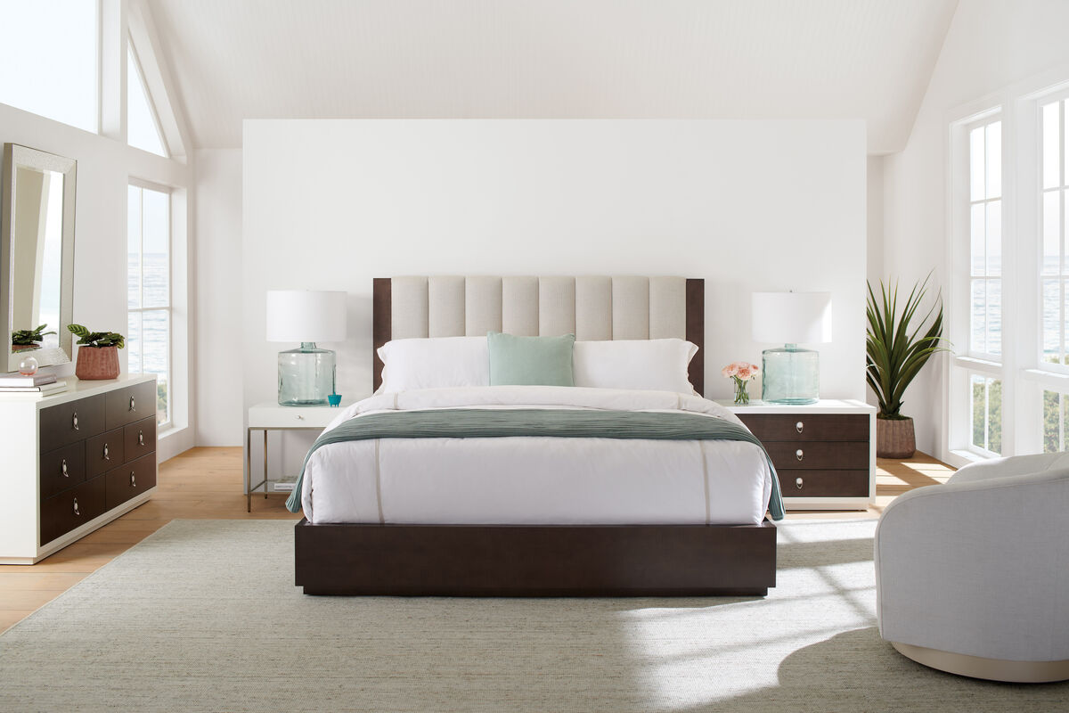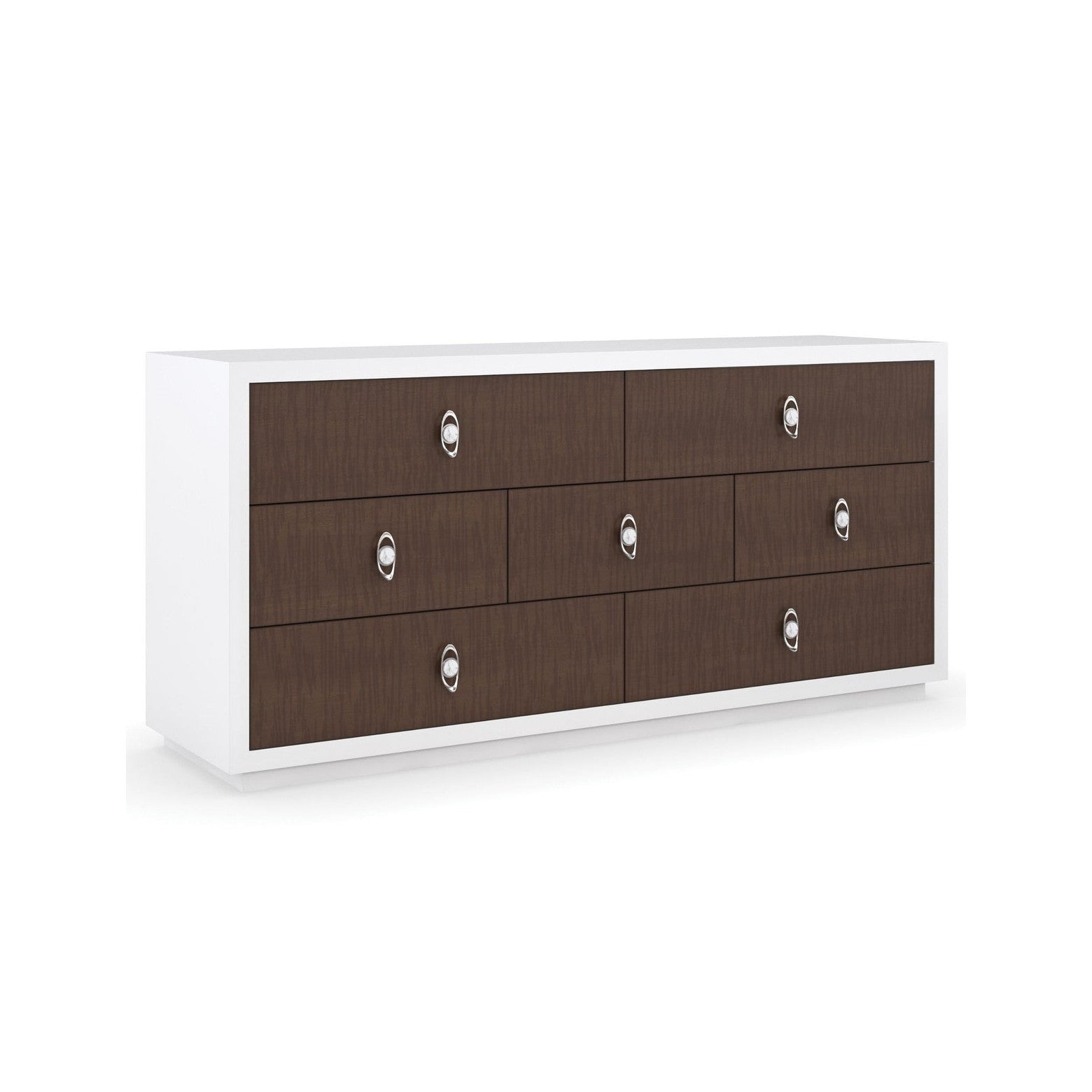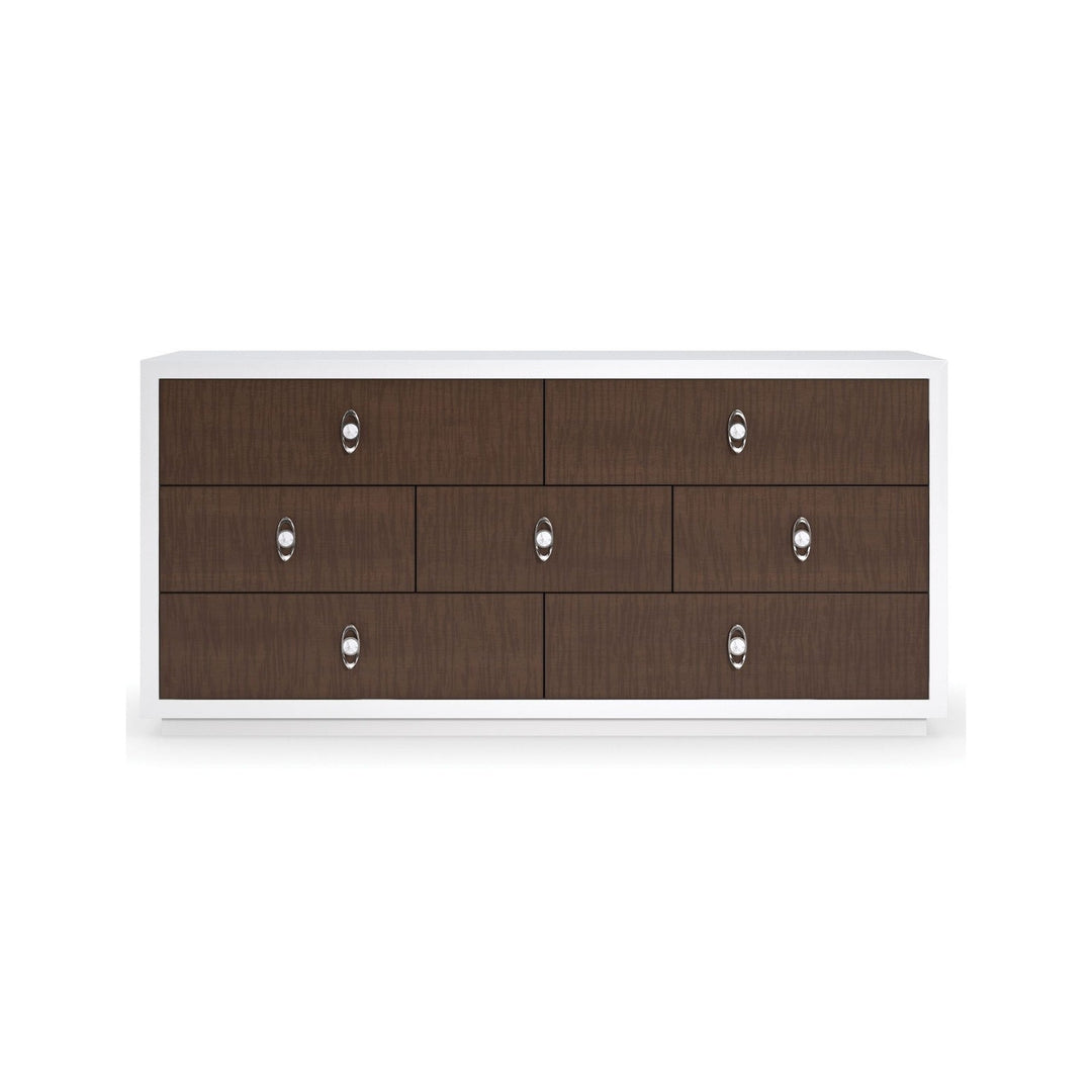 With drawer fronts crafted in a figured sycamore veneer, this bedroom dresser showcases the wood grain's intricately beautiful texture. At the centre of attention, cast metal drawer pulls with a ceramic detail recall the delicate design of a handcrafted cuff bracelet. Offers generous storage with seven spacious, soft-close drawers. Case finished in Cloud White. Seven drawers with fronts in Brunette and undermount soft close guides. Drawer interior in Cloud White.