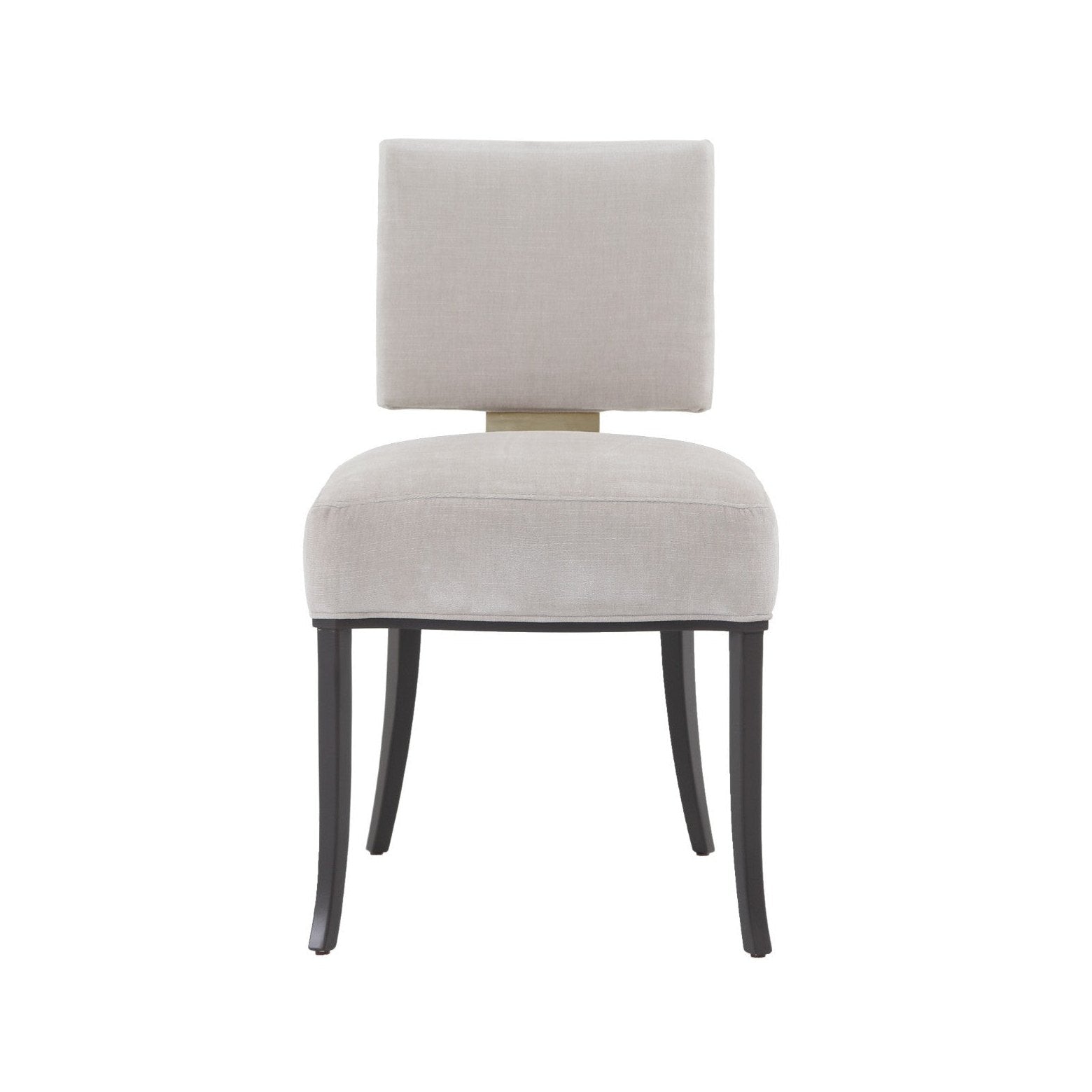 For a fresh interpretation on a low, modern klismos chair, this silhouette takes on dramatic style when you view the wide, Whisper of Gold panel that shines off its back. Fabric fully surrounds the square upper back and seat cushion that rest on an exposed wood frame and sabre legs finished in Seal Skin. This is a chair with truly polished appeal. Fabric: Manhattan AlabasterUpholstered seat and back with wood base. Metal back plate in Whisper of Gold.