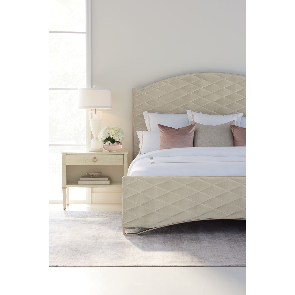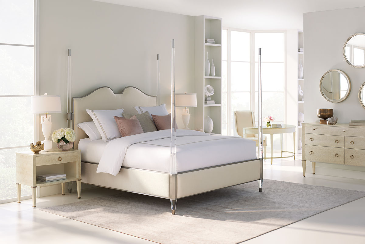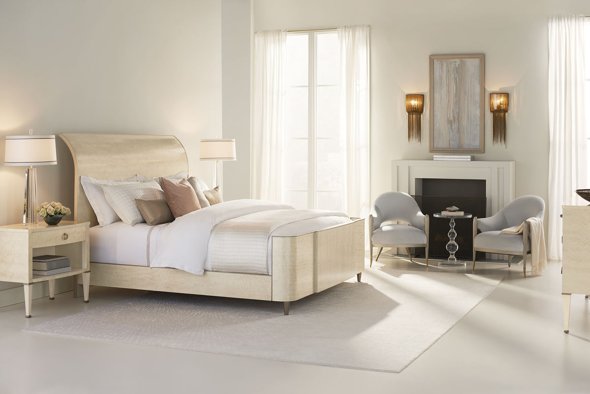 The perfect bedside companion, this well-designed case piece is sure to stand by you. Its thoughtful design is crafted of exotic mottled Anegre veneers and finished in a graceful Platinum Blonde finish. A single drawer with a delightful silkscreened pattern as well as cord access, sits above an open storage area with LED touch light ‚ perfect for a favourite book or magazines. Tapered legs give it a finishing touch and wear an Ivory painted finish accented with Golden Shimmer banding. Case finished in Platinum Blonde. Legs finished in Ivory Paint with Golden Shimmer collars. One drawer with undermount soft-close guides and cord access. Silk screen pattern in drawer. Open storage area below drawer with LED touch light. Case and drawer interiors in Ivory. Metal ferrules in Champagne Gold.