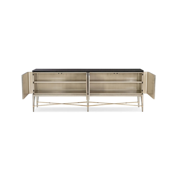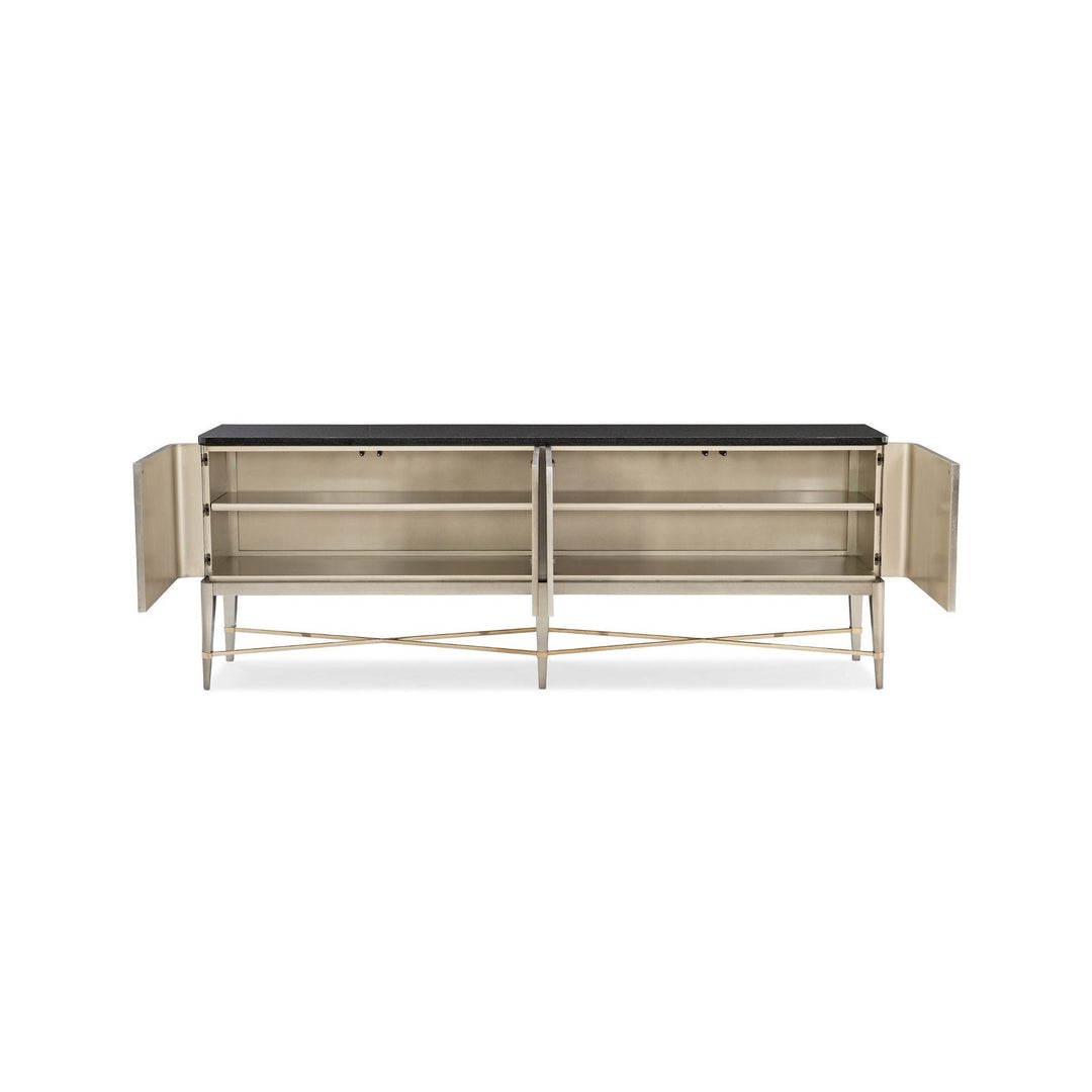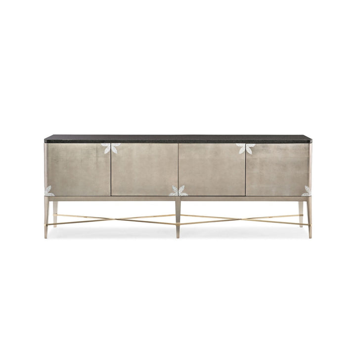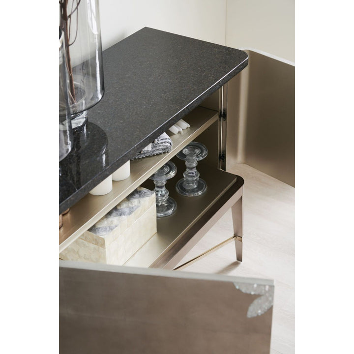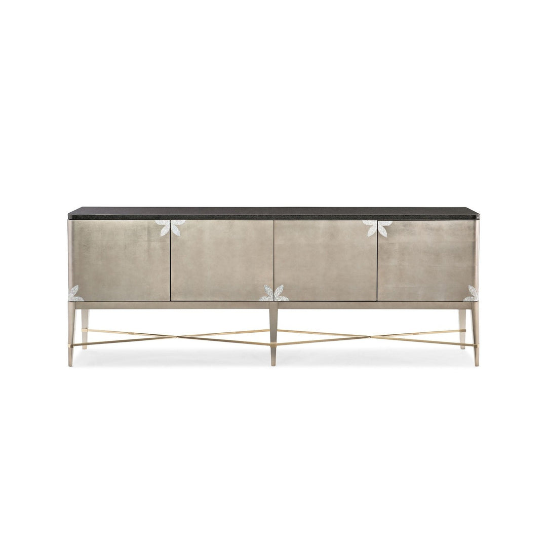 Edgy and elegant, this glamorous cabinet adds an element of fashion to any room. You'll love the white Mother of Pearl inlay featured on each of its four doors as well as the bold contrast of a granite stone top. A Charcoal Leaf finish lends dramatic presence while it's metal stretcher sparkles in Whisper of Gold. As functional as it is elegant, this thoughtfully designed piece offers plenty of storage and boasts an adjustable shelf in each interior compartment. Together, its intriguing mix of materials adds layers of luxury to its sophisticated silhouette. Case finished in Charcoal Leaf. Granite stone top. Four doors with white MOP inlay accents. One adjustable shelf in each of the interior compartments. Metal stretcher in plated Whisper of Gold. Interior finish in Soft Silver Paint.