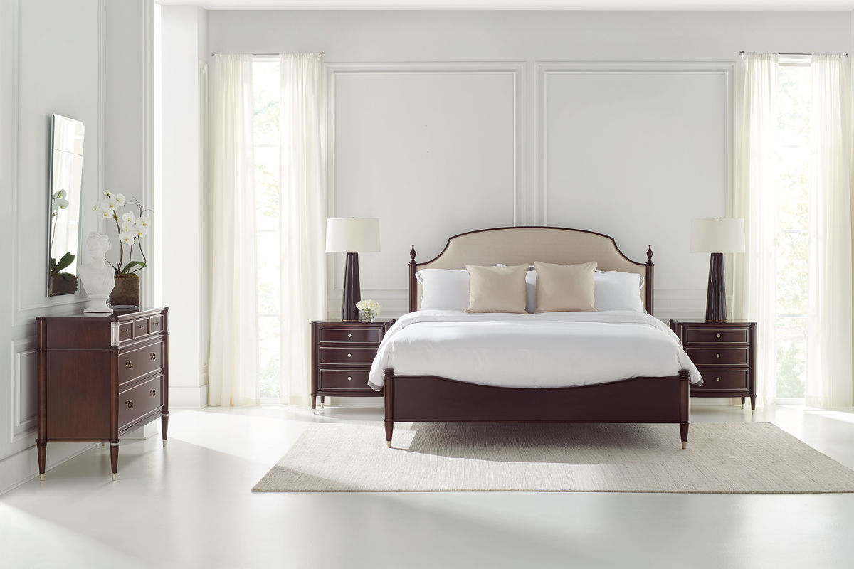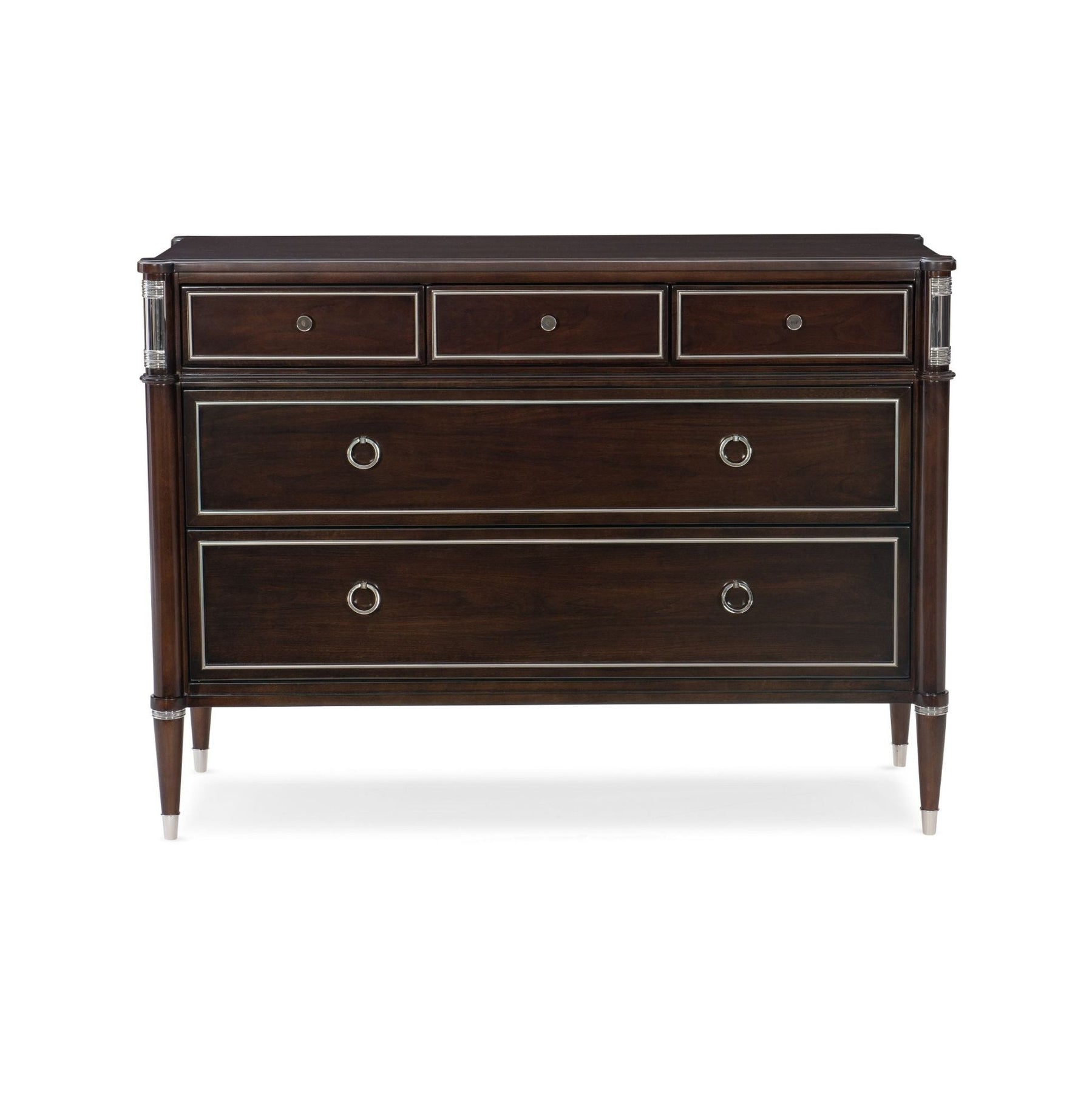 Captivating from every angle, this is a dresser worthy of accompanying a statement bed. Wearing a rich Mocha Walnut finish, it boasts drawers outlined in a shimmering Soft Silver Paint finish. Five drawers offer generous storage and ensure there's a place for everything and everything has a place. And only you will know that its top three drawers feature interiors finished with an exquisite silkscreen pattern that elevates the ordinary. Case finished in Mocha Walnut and drawer trim in Soft Silver Paint. Metal collars in Stainless Steel. Seven drawers with undermount guides. Top drawer bottoms with silkscreen pattern. Metal ferrules in Polished Stainless Steel. Drawer interior Soft Silver Paint.