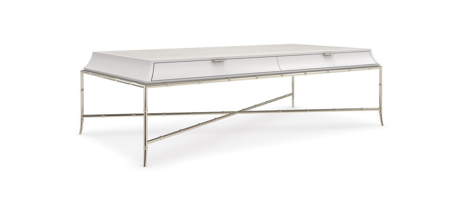 With its elegant simplicity, the Tea Time coffee table beautifully blends modern materials with traditional Asian design influences. Elevated on a faux bamboo metal frame and stretcher, a pagoda-style drawer box painted in Almond Milk features a faux shagreen top. Two slender drawers feature painted interiors and tucked-away storage for books and magazines. Metal frame and stretcher in Whisper of Gold. Case box in Almond Milk. Case top is wrapped faux shagreen with Alabaster painted finish. Two drawers with soft close side guides. Drawer interior in Almond Milk.