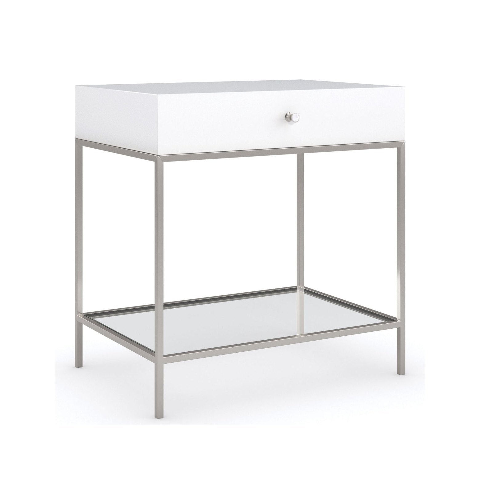 Clean-lined and visually light, this sleek bedside table adds a fresh modern perspective to bedroom and living room interiors. Smartly scaled for smaller spaces, it features a simple box drawer set on a metal frame with a glass bottom shelf for open storage and display. A Cloud White finish lends cool contrast to wood veneers, and seamlessly blends in with other pieces from our collection. Metal base in Satin Nickel. Box in Cloud White. One drawer with side guides. Drawer interior in Cloud White.