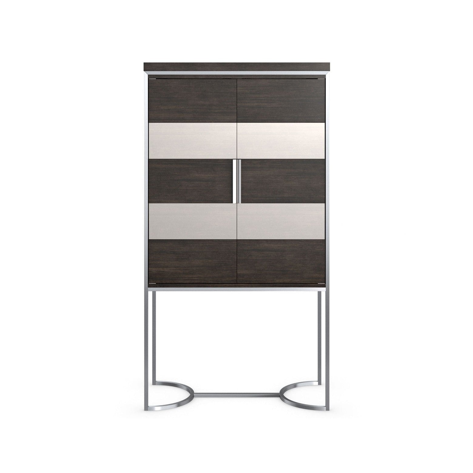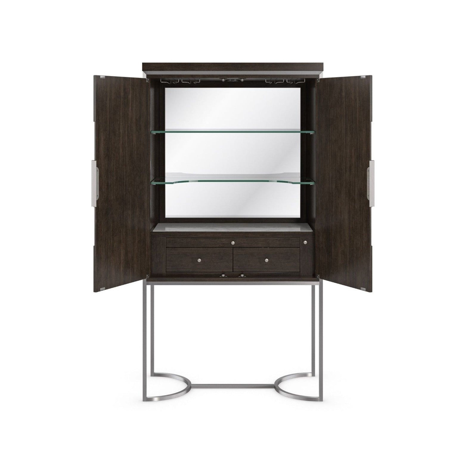 A high-profile style, this architectural bar cabinet fuses form and function in an intriguing mix of materials and finishes. Its linear design adds height to a room, with a lavish amount of space for entertaining essentials. Features a mirrored back and lit interior with adjustable glass shelves, two drawers, a white marble work surface, and metal frame stemware storage. A pull-out laminated shelf lets you serve guests with ease. Metal frame in Smoked Stainless Steel Paint. Two doors with alternating front sections in Sepia and Smoked Stainless Paint. Interior features: clear mirrored back, white marble work surface, two adjustable glass shelves and two drawers with side guides. Upper wine glass storage. Pull out shelf with laminated surface,Interior light with touch dimmer. Drawer interior in Soft Silver Paint.